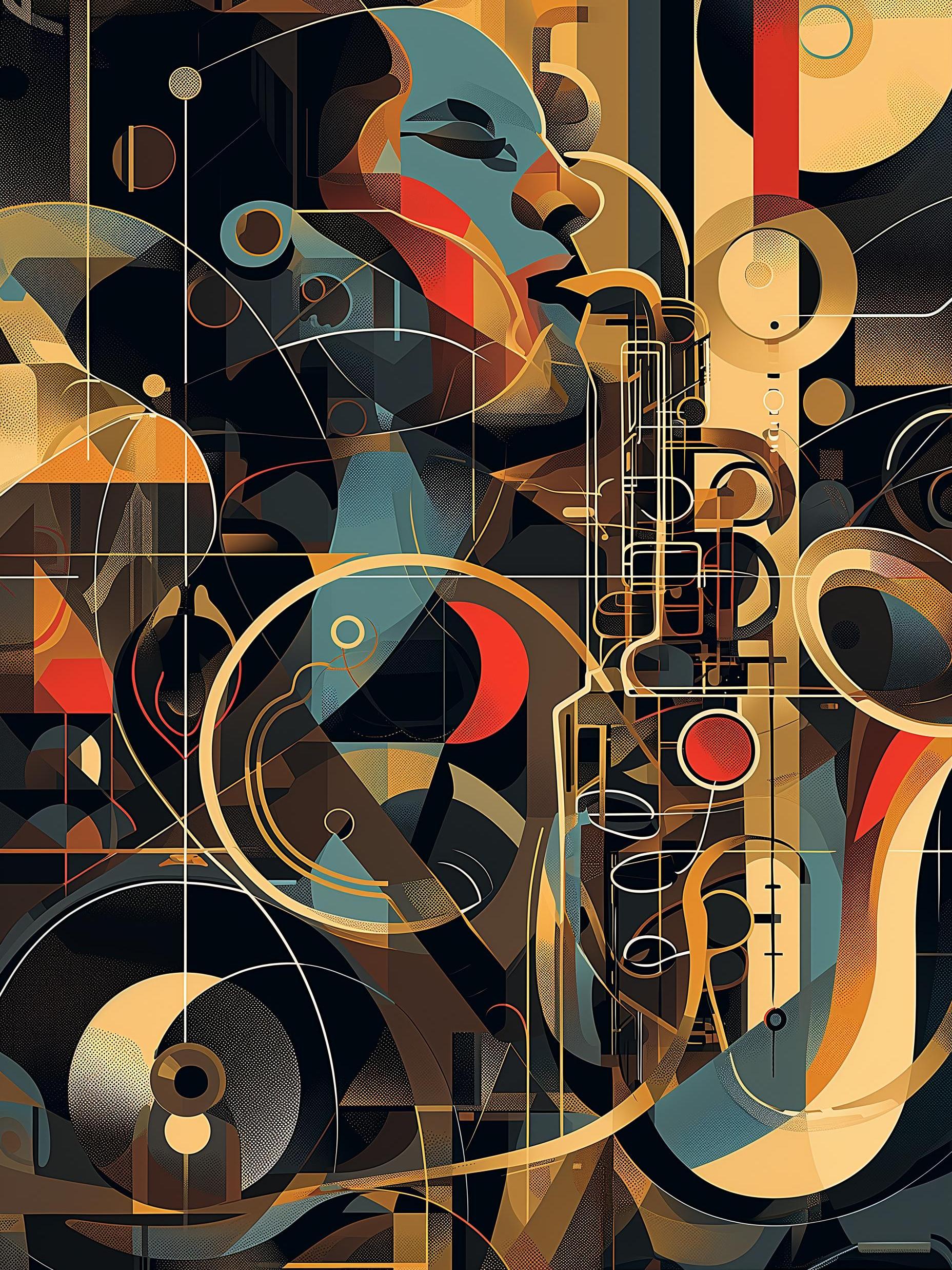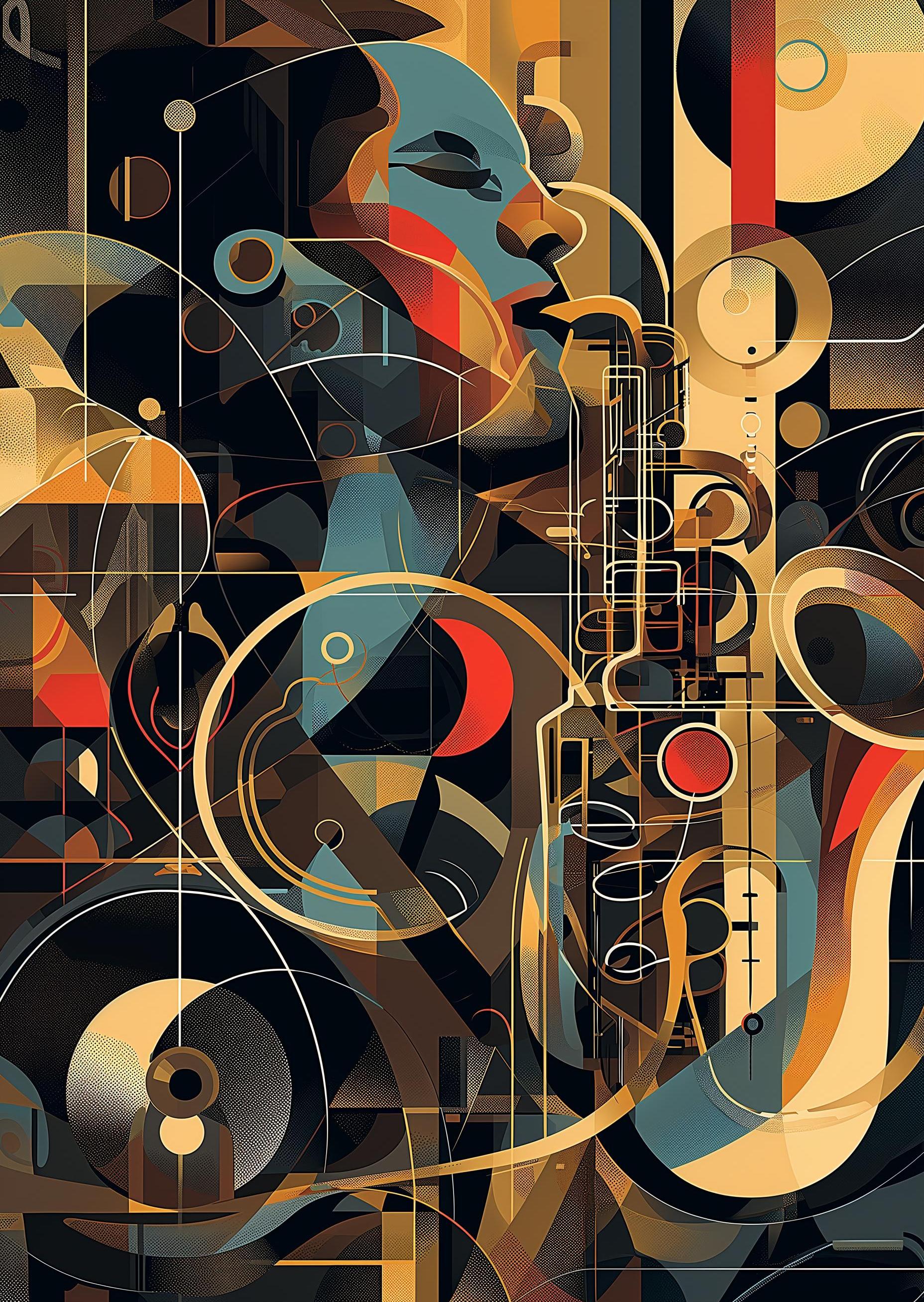 In a world where colors dance and lines flow, an image of a figure emerges. The face, layered with shades and shapes, tells a tale of music's power. It's as if each line curves with the rhythm, each hue pulses with the beats of a song. A saxophone, like a river of notes, streams from the mouth, releasing a cascade of soulful sounds. This artistic creation captures the essence of melody, showing how it moves through us, shaping our emotions and painting our moments with vibrant sound.