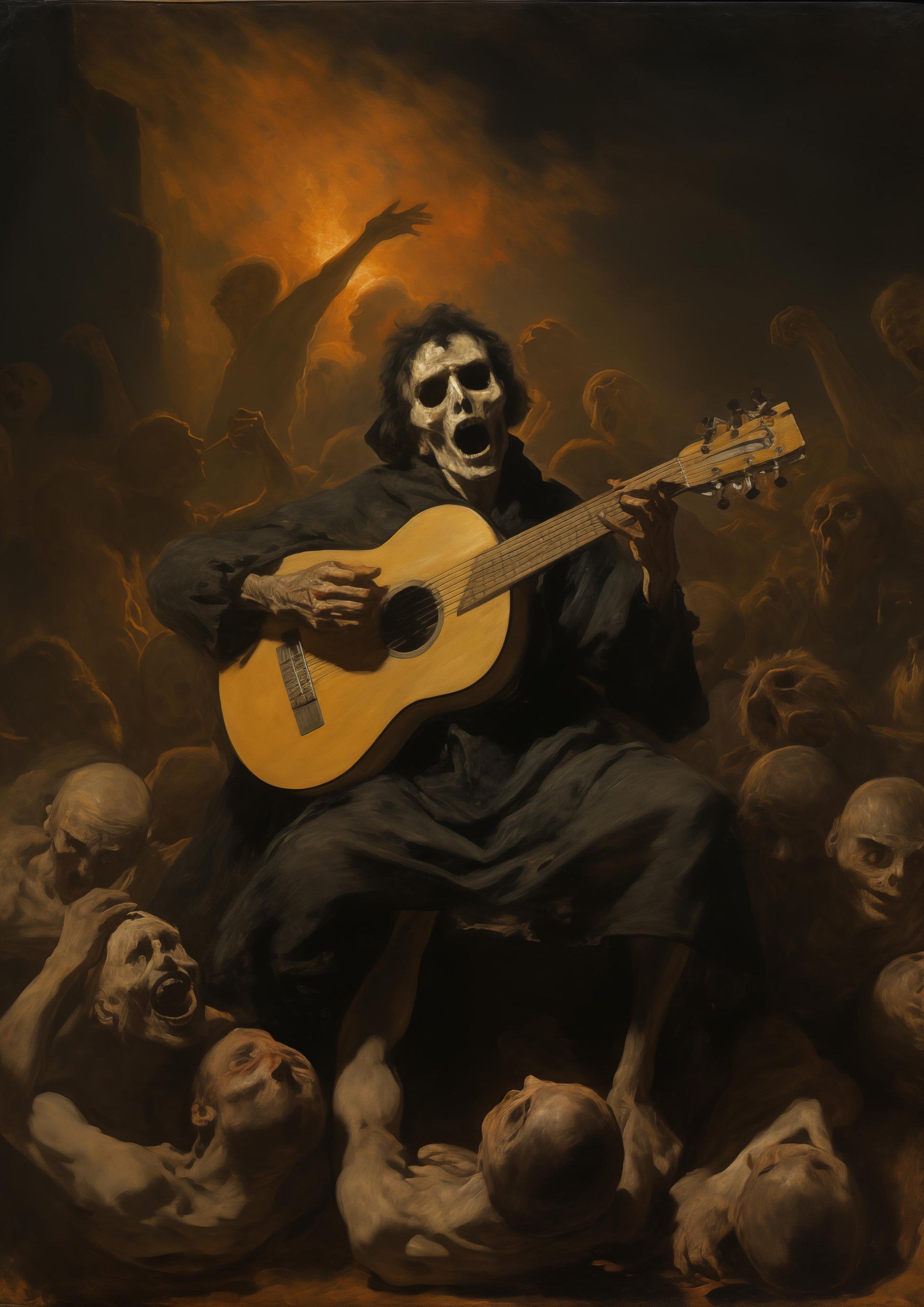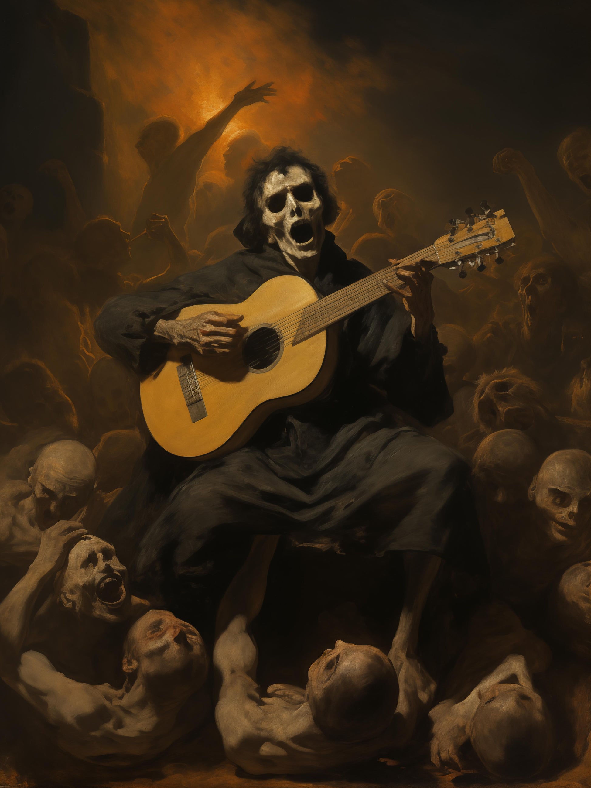 In a realm shrouded in darkness, a skeletal musician holds court among the lost souls, plucking at guitar strings and orchestrating a macabre concert. The fiery backdrop casts an ominous glow over the scene as the skeletal figure's eyes alight with fervor. The crowd of skulls and desolate faces emerge from the abyss, drawn toward the haunting melody. Each strum sends ripples through the gathered spirits, their anguished expressions reflecting the depth of their longing. In this underworld recital, the music is a powerful lament, echoing the tales of those gathered, forever captive to the guitarist's grim symphony.