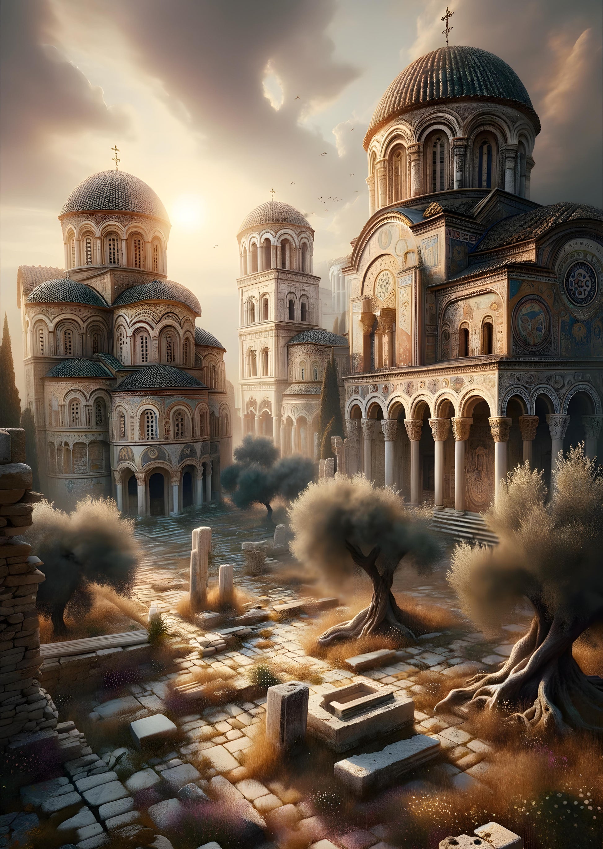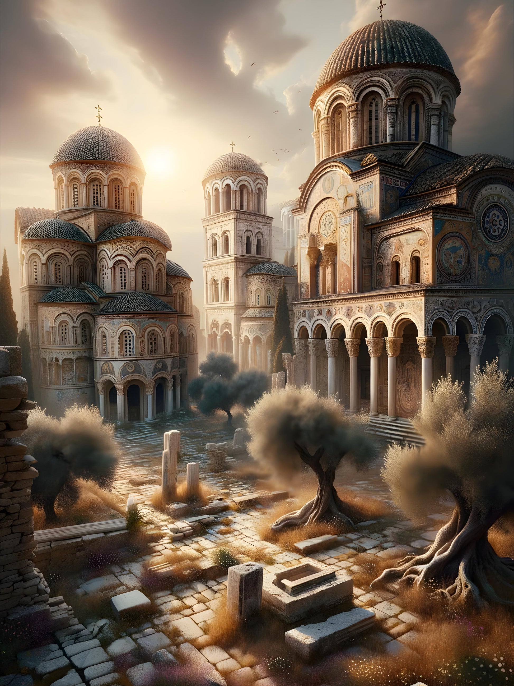 In a forgotten realm where history and future intertwine, the sun casts a golden glow on ancient domes and arches. Crumbling relics hint at untold narratives, as twisted olive trees stand as silent witnesses to the passage of time. A gentle breeze stirs up motes of dust, dancing like spirits among the timeworn stones. Each ornate pattern and faded mosaic on the monumental walls tells a story of faith and artistry long past, inviting the curious soul to ponder the lives that once roamed these sacred grounds. High above, birds glide across the sky, as if carrying the lost secrets of a bygone civilization. Here, in this place of beauty and decay, the past lingers, whispering tales of glory to those who pause to listen.