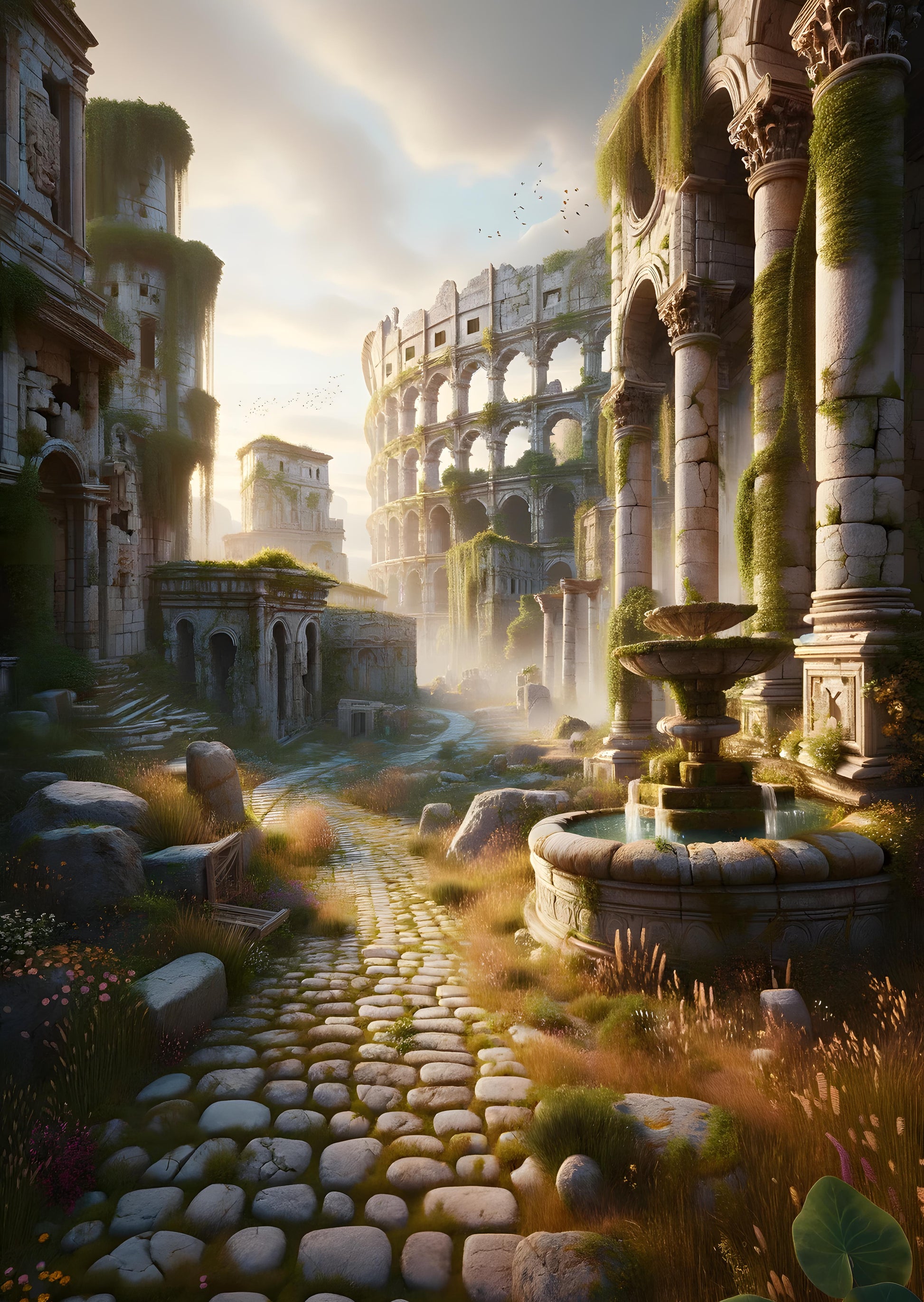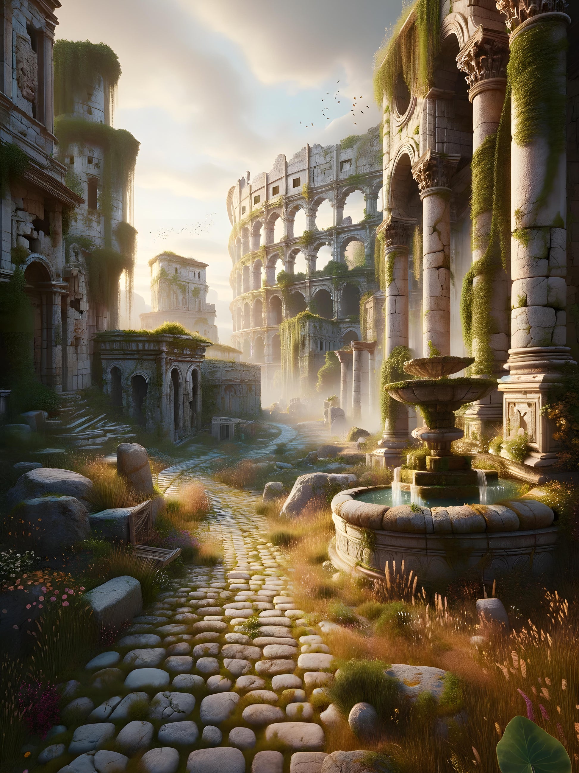 In a forgotten realm, where nature has claimed its dominion over the remnants of an ancient civilization, the morning sun bathes crumbling coliseums and ivy-draped arches in a soft golden light. A cobblestone path, scattered with wildflowers, invites the curious to wander among the historic splendors, where the fountain still murmurs tales of time-lost splendor. Birds take flight, their silhouettes adding to the tapestry of life that persists amidst these noble ruins. The scene is a poignant reminder of the past's grandeur, and of nature's unwavering persistence, intertwining to create a landscape both poignant and beautiful.