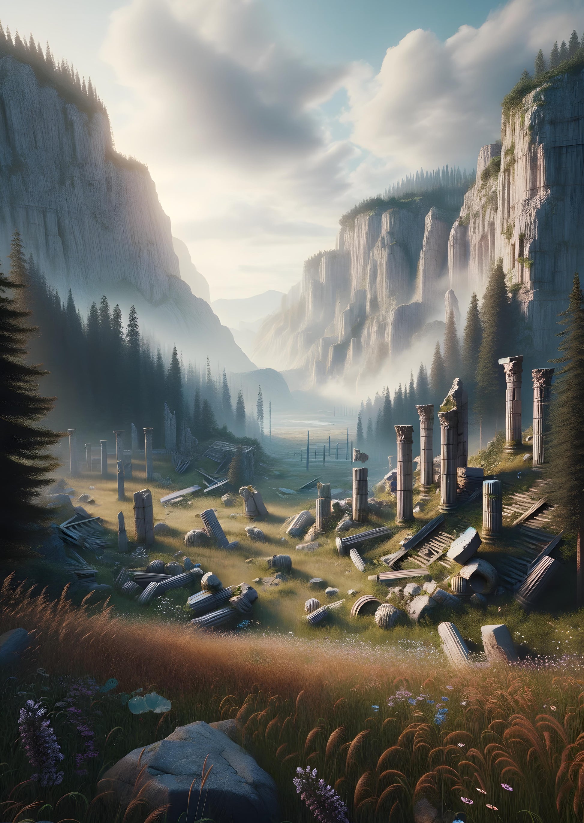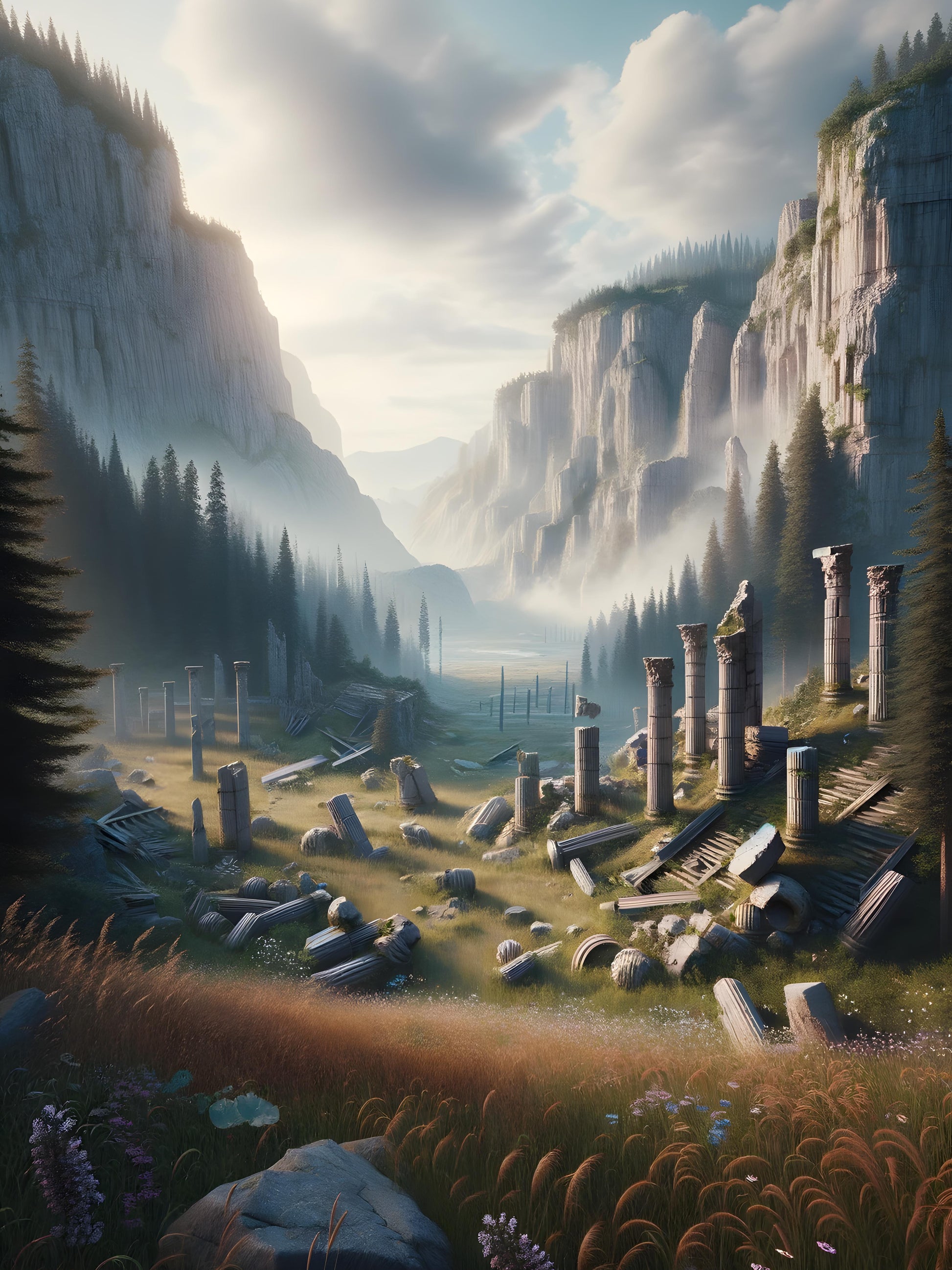 Amidst a valley flanked by towering cliffs, the remains of an ancient civilization stand defiant against time. Sunlight filters through the clouds, illuminating the broken columns and scattered stones that once formed grand structures. Nature has begun to reclaim the ruins, with verdant grass and wildflowers carpeting the ground and trees stretching their branches towards the sky. The early morning mist hints at the valley's concealed secrets, inviting the curious to explore its rich history. This place holds the echoes of a bygone era, a silent testament to the enduring legacy of its creators. It is a realm where every stone tells a story, and the air is thick with the allure of the past.