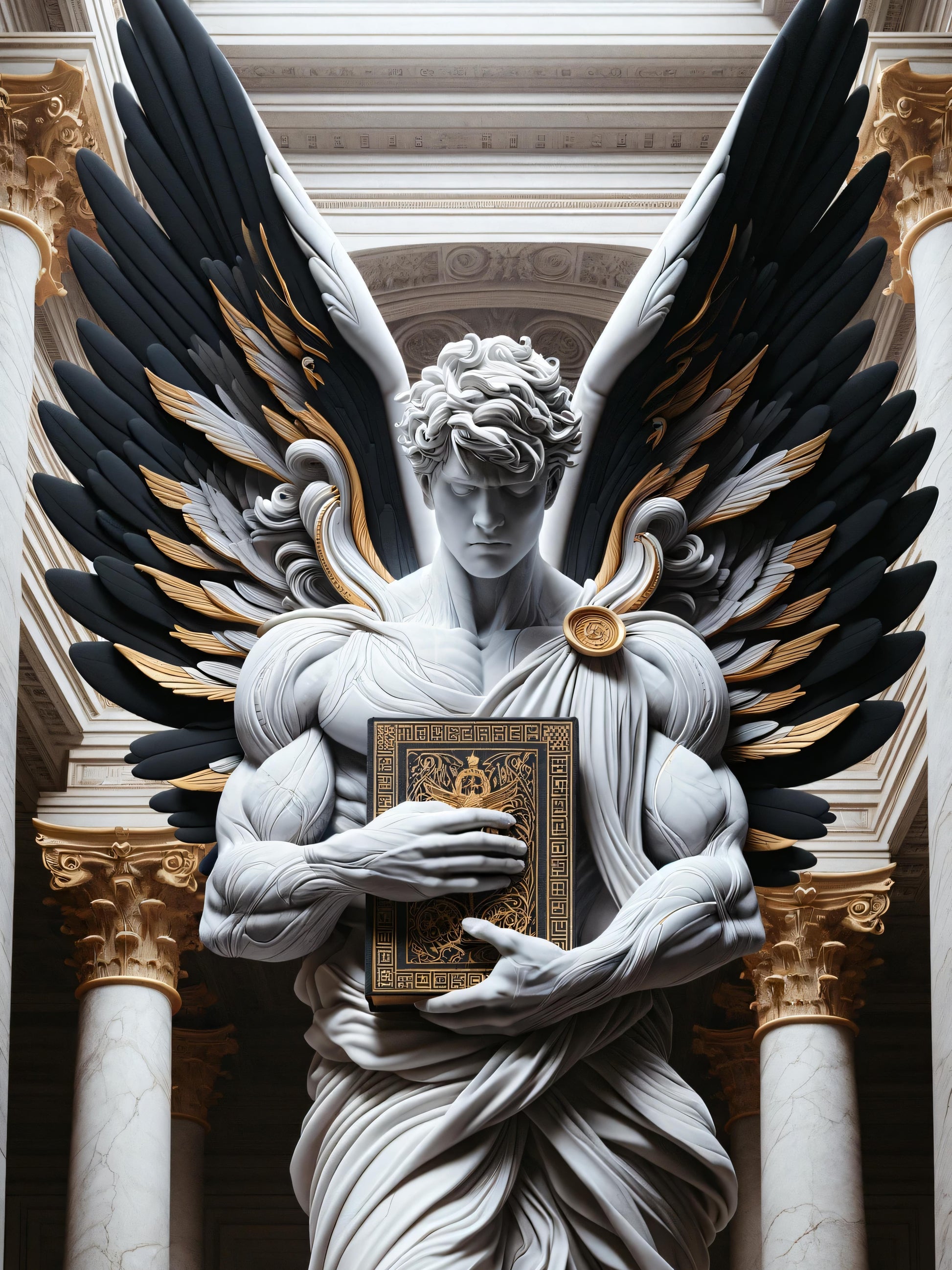 Behold the majestic visage of an angelic being, sculpted to perfection amidst the marbled halls of divine wisdom. With wings that eclipse even the sun's grandeur, this figure stands guard over ancient texts and untold secrets. The intricate details of each feather seem to whisper tales of celestial flights and heavenly decrees. As the keeper of sacred knowledge, the ethereal being radiates an aura of solemnity and enigmatic power, inviting onlookers to ponder the mysteries of the universe contained within the gilded tome cradled in its grasp. This image, a testament to the sublime artistry of the sculptor, captures the essence of the divine messenger, inspiring awe and reverence in every observer.