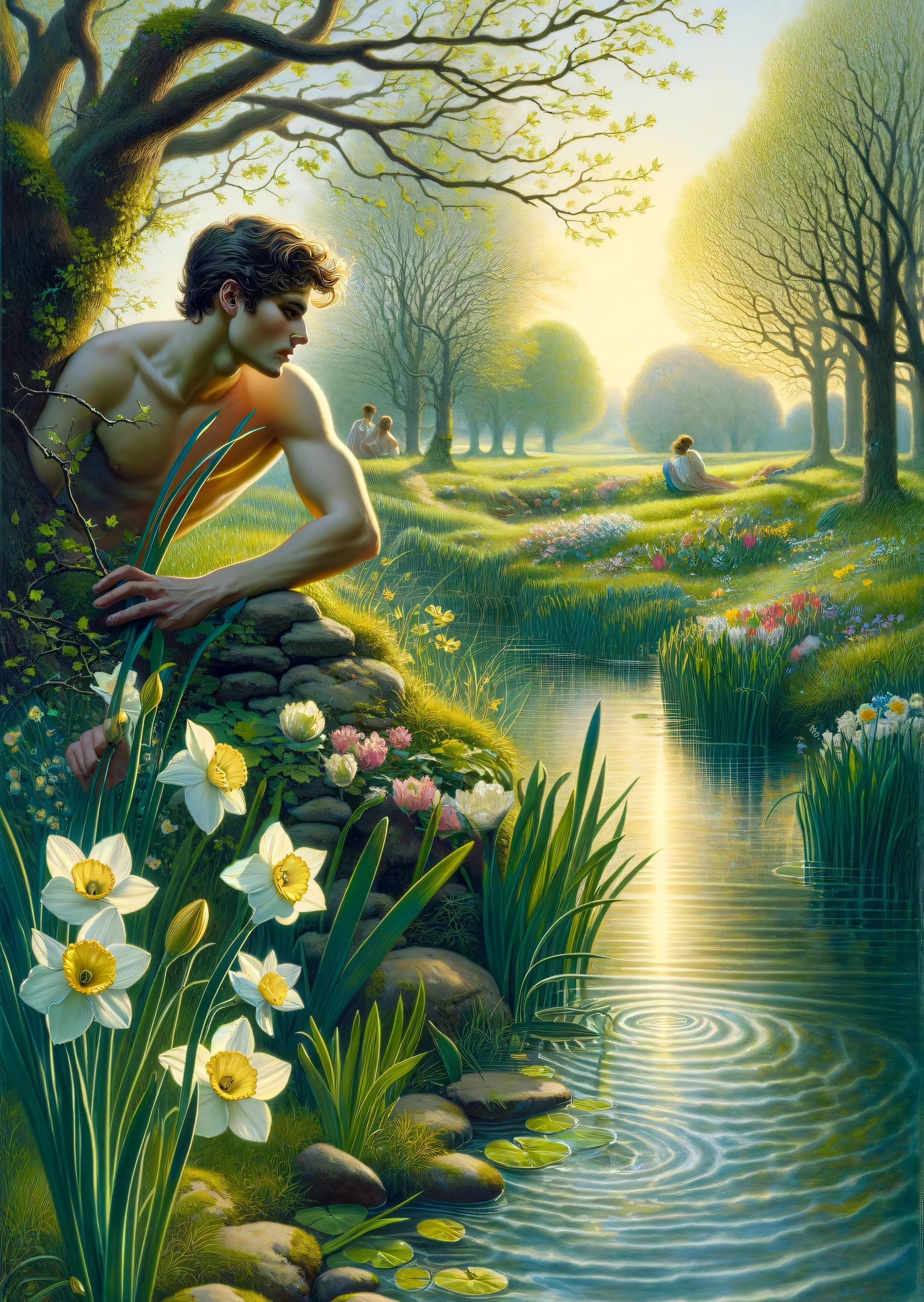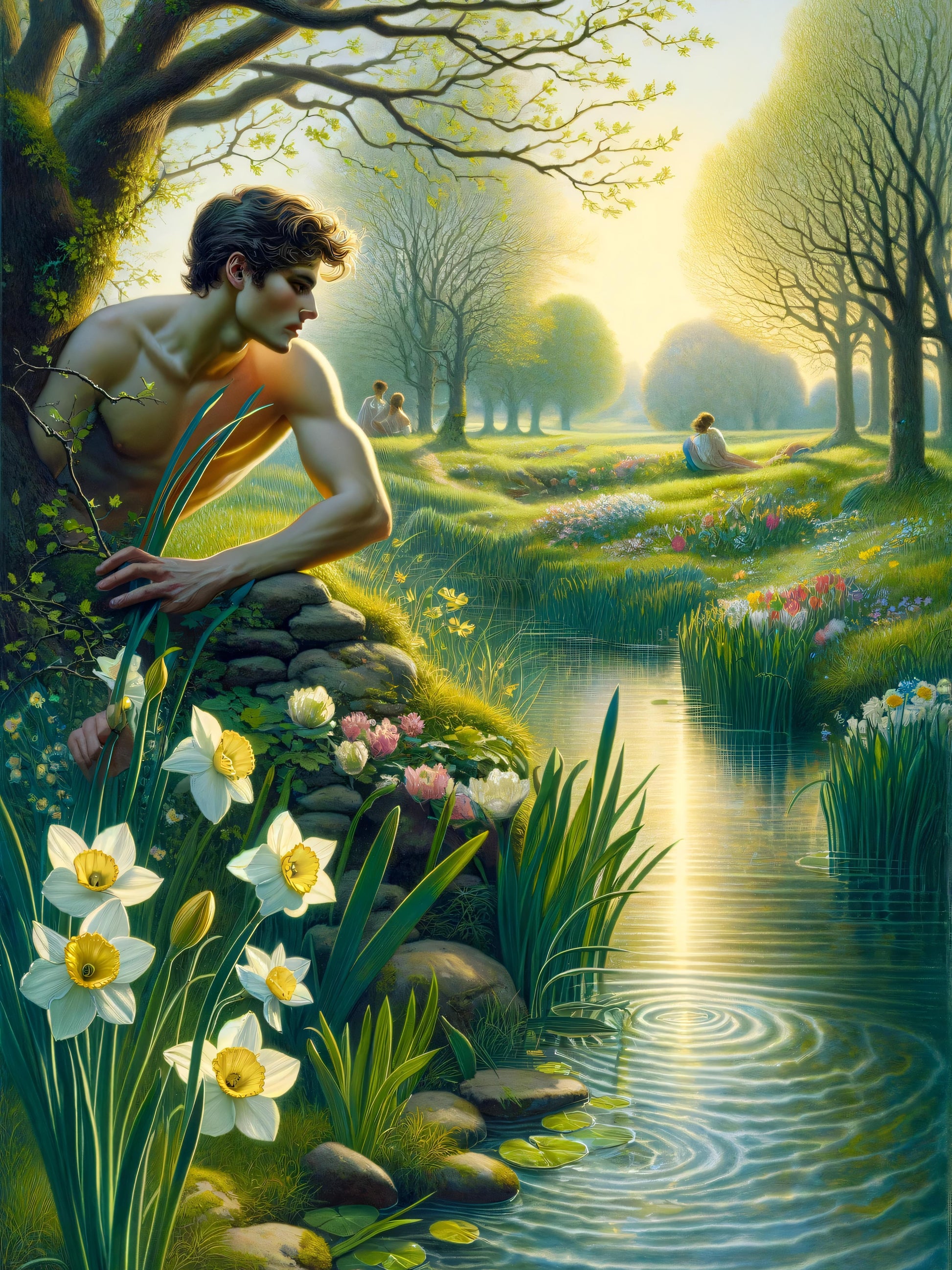Behold the serene embrace of nature as Apollo the god of sun, light, and poetry takes refuge in a tranquil garden, his presence synonymous with the warmth of the sun that bathes the landscape. Here, the deity's youthful radiance echoes in the soft glow of dawn that illuminates the flower-strewn earth, symbolizing renewal and enlightenment. Amidst the blossoming daffodils and lush greenery, Apollo's contemplative gaze pierces the tranquility, reflecting his role as an oracle and visionary. The idyllic scene continues into the distance where figures leisurely wander, oblivious to the divine company. As the guardian of the arts, Apollo's legacy lives on in the eternal balance of the natural world, whispering tales of ancient myths through the whispering leaves and the gentle ripple of the stream.