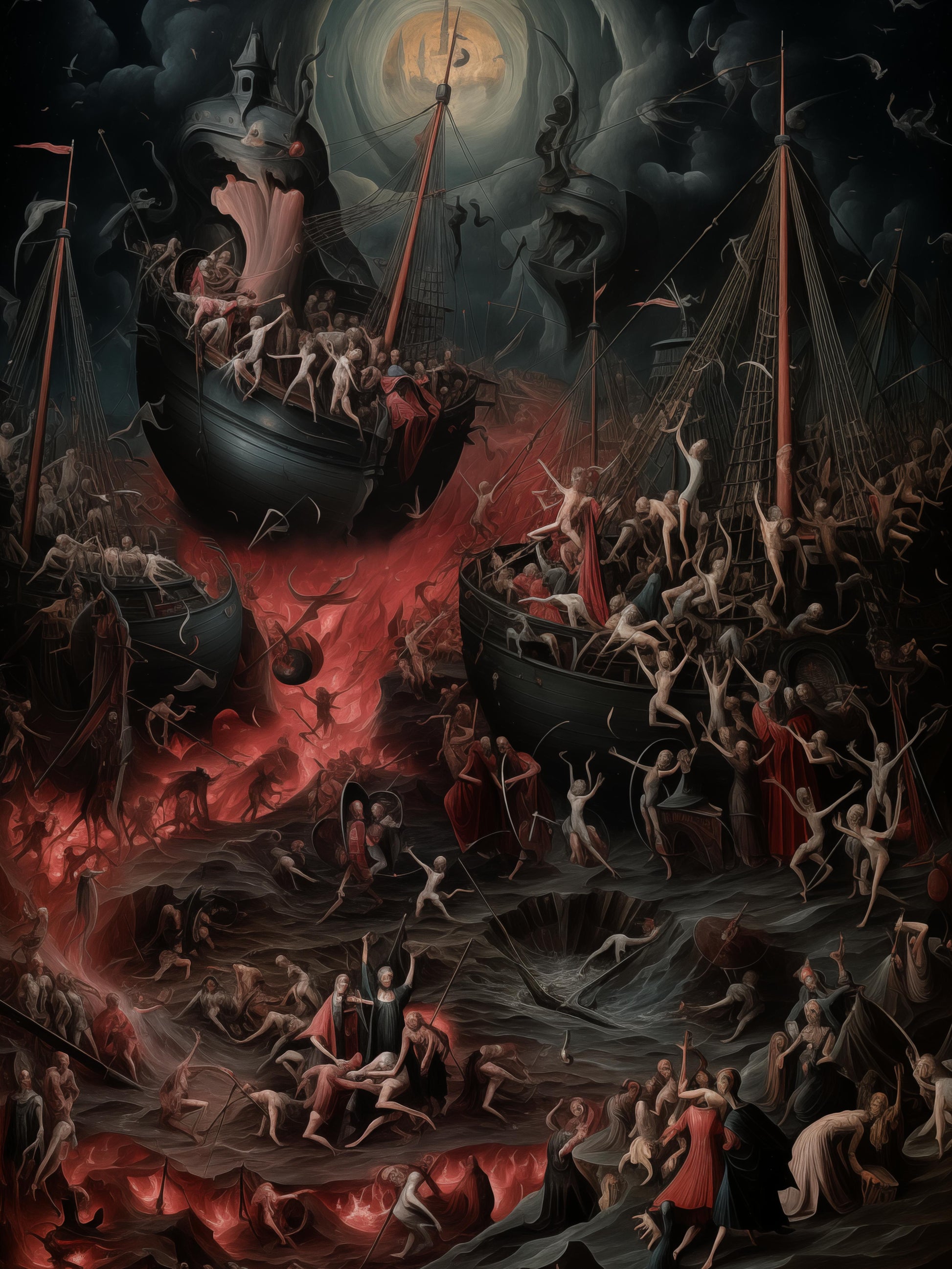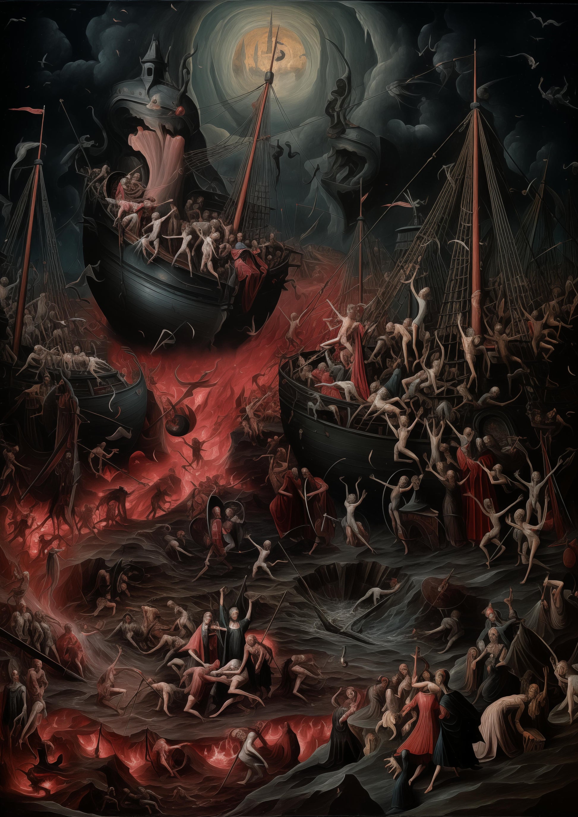 In a realm where the sea glowed like fire, ships brimmed with souls sailed through the night. Under an uncanny moon, amidst a chaos of limbs and faces, the voyage spoke of life's struggle. The sea, boiling with emotion and turmoil, held figures striving for salvation from their plight. The eternal battle between light and dark played out, as individuals climbed, reached out, and grappled with their fate. Above it all, the moon cast a silent glow, an impartial witness to the human condition unfolding below. In this painting, life's voyage is depicted not as a journey of peace, but as a fervent dance of resilience against overwhelming odds, with the glowing orb reflecting the duality of hope and despair.