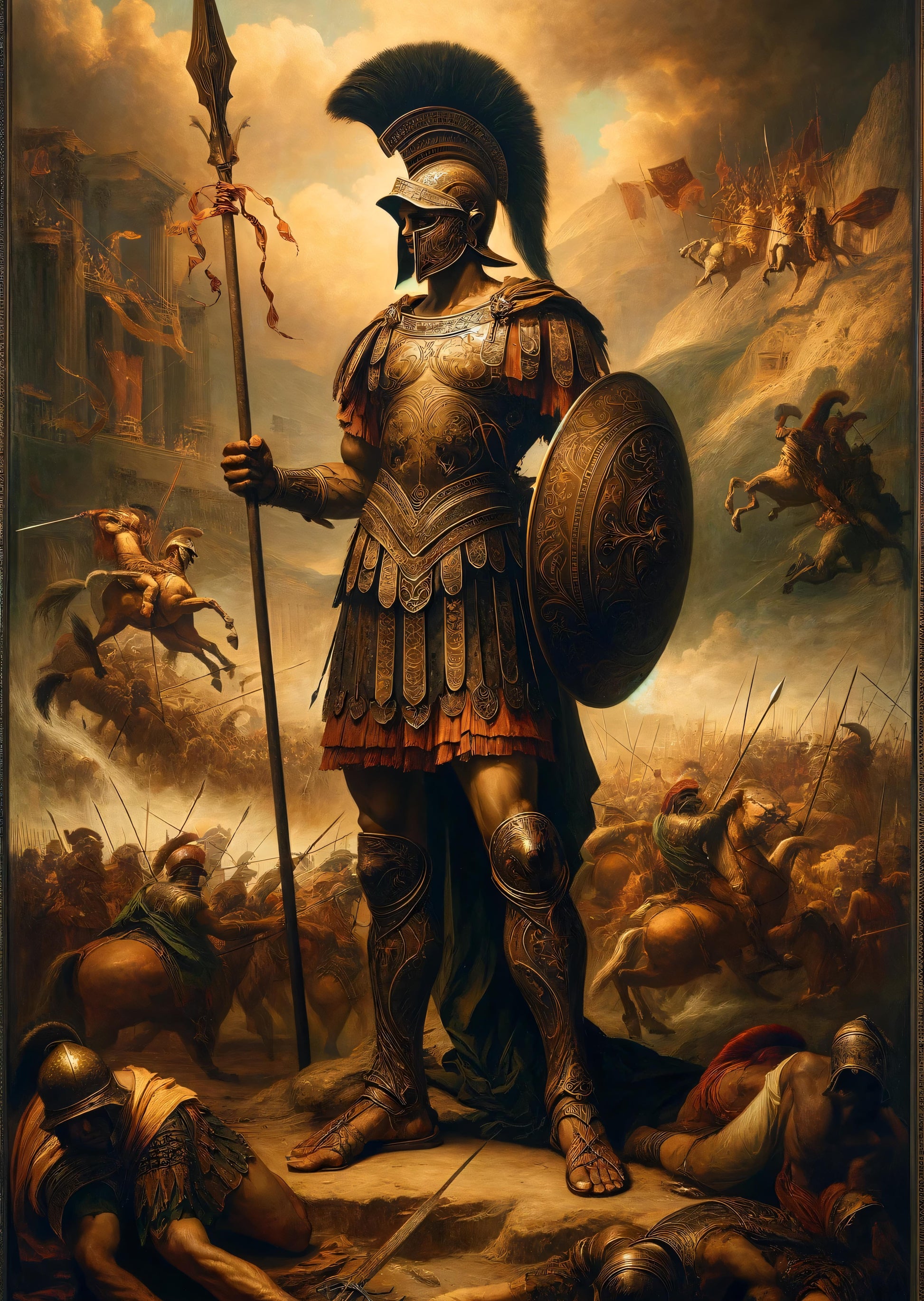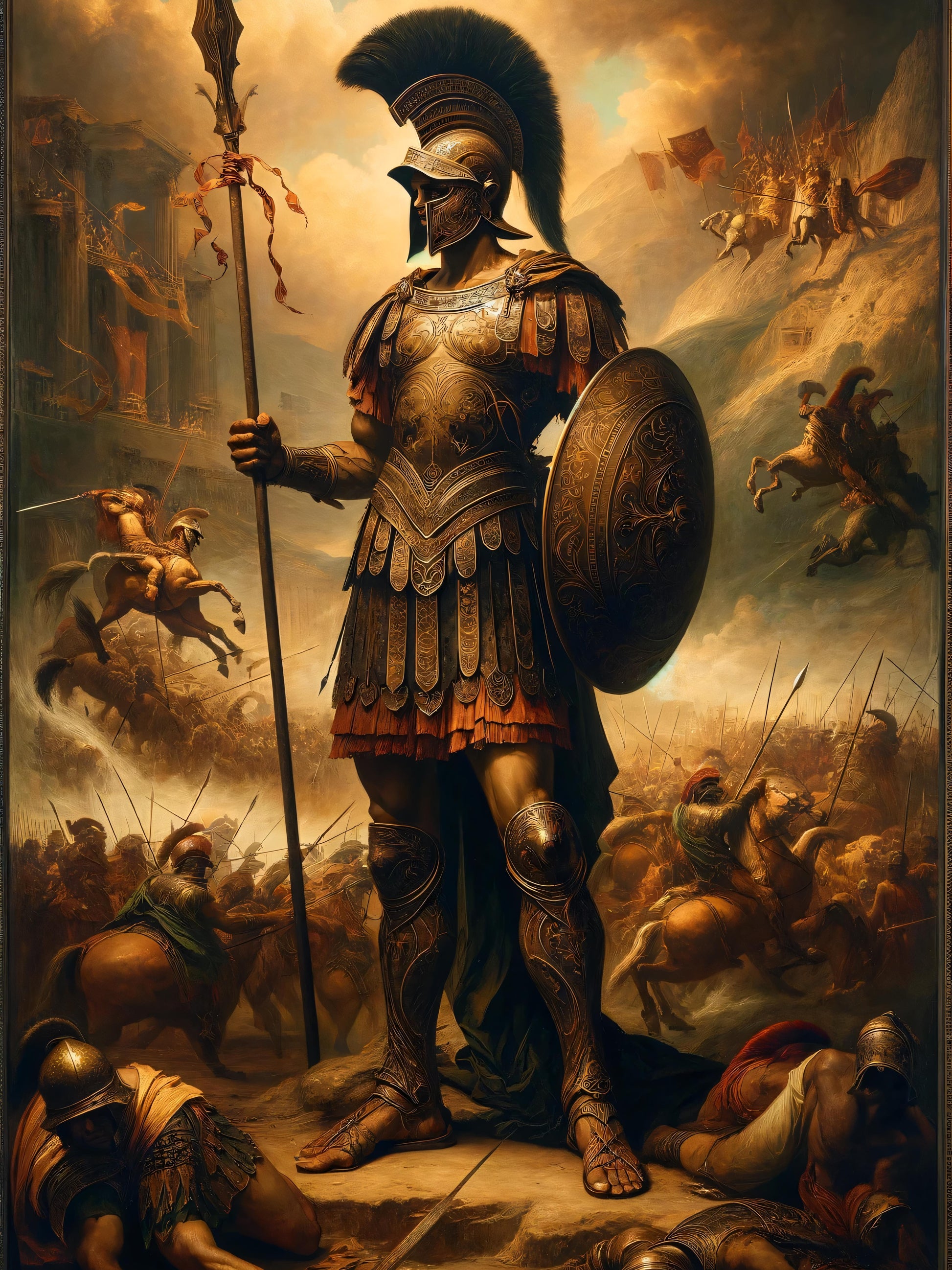 Behold Ares the embodiment of war and aggression Standing amidst chaos and carnage this ancient deity is revered and feared in equal measure A fierce warrior clad in ornate armor he wields a mighty spear as the battle rages around him His plumed helmet shadows his visage a symbol of authority and prowess As gods above vie for power Ares' influence is felt on the mortal battlefield where the clashing of swords and cries of the fallen echo his name with every heart-pounding moment His presence alone inspires soldiers to unparalleled ferocity in pursuit of victory at any cost