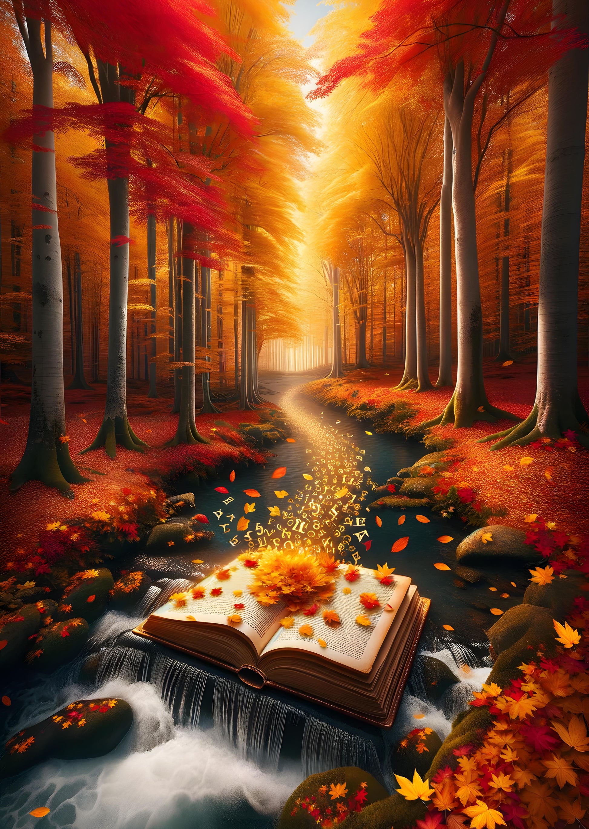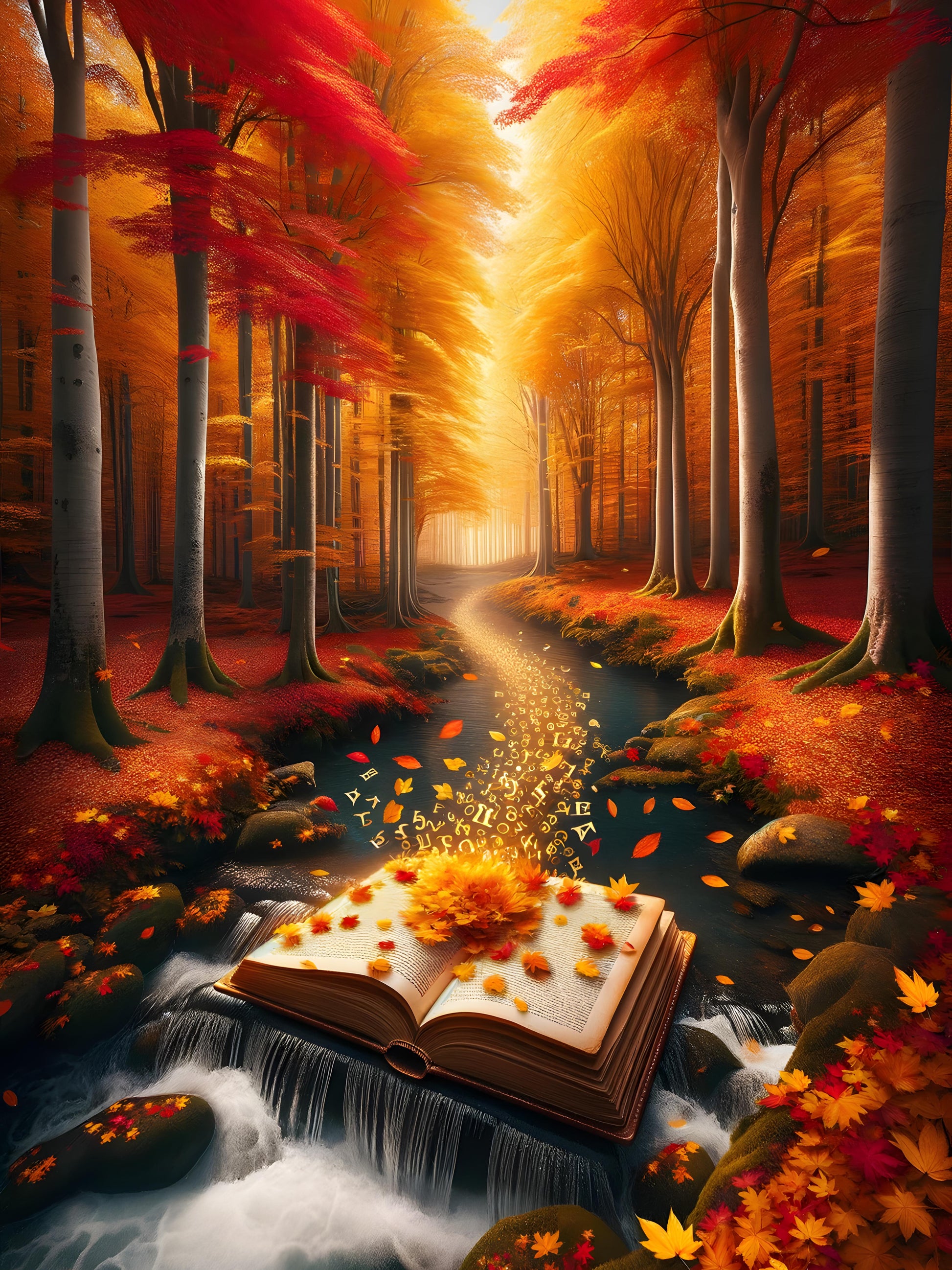 In an autumn-kissed forest, a mystical stream carries whispers of adventure, its waters dancing around a book perched on the rocks. Letters and symbols leap from the pages, emboldened by the glow of the golden canopy above, as they join the flow of knowledge and tales untold. The fiery red leaves form a natural gateway, promising a path laden with discovery for those who dare to walk it. Amidst this vivid cascade of color and light, nature writes her own spellbinding narrative—a beautiful fusion of the fantastic and the tangible, where stories come to life and the world is aflame with the vibrant breath of fall.