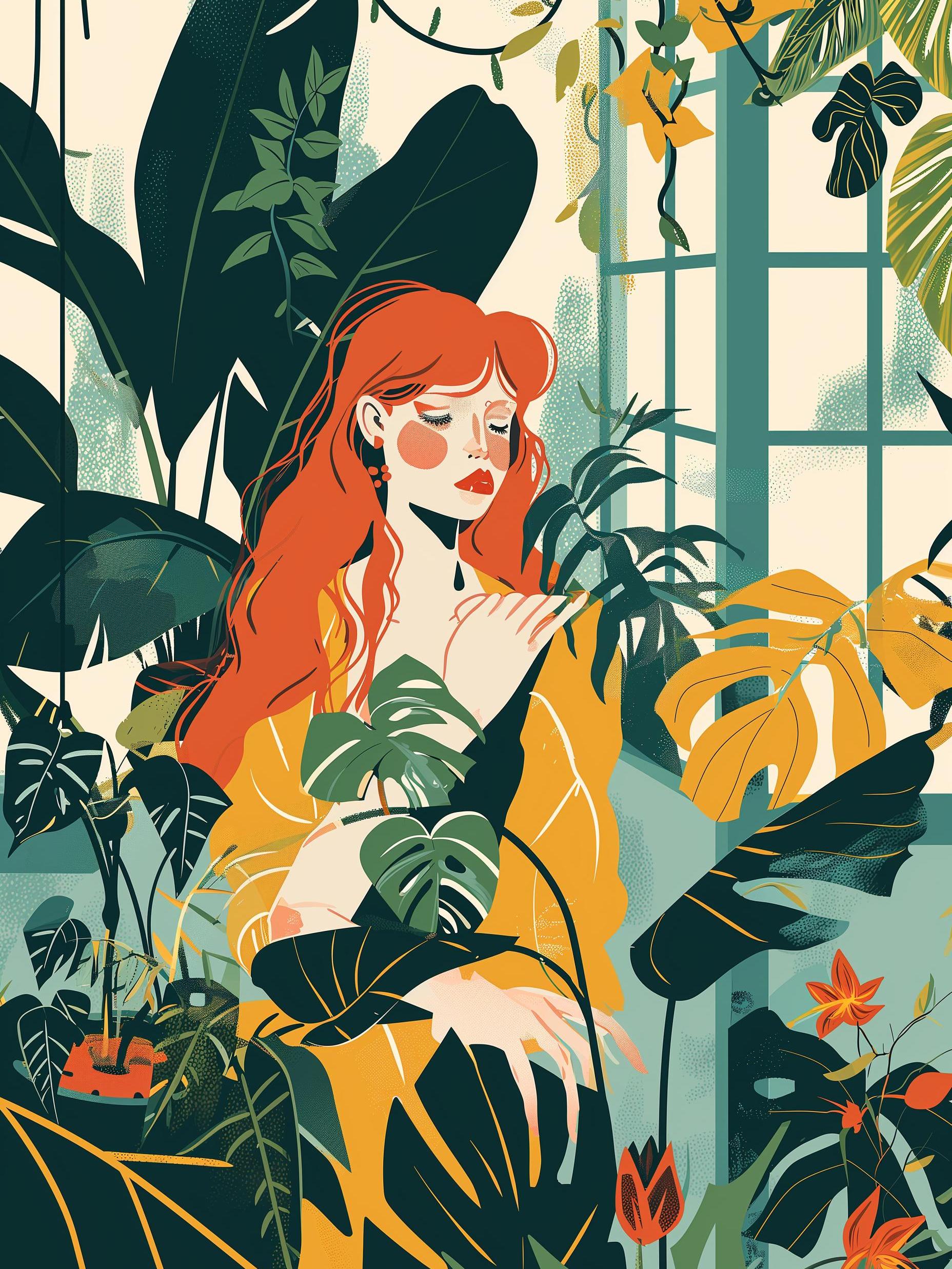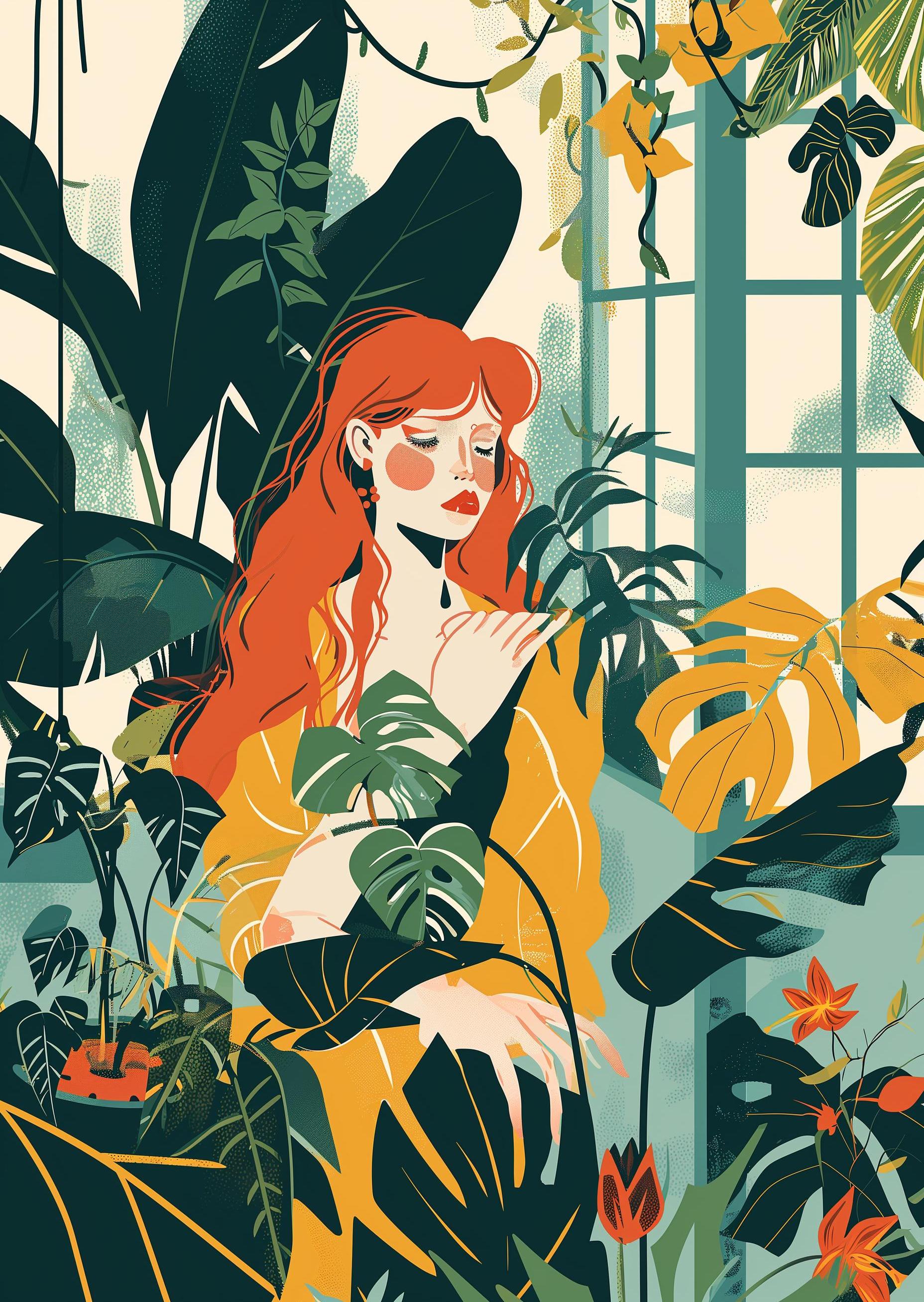 In a lush garden, a woman with fiery red hair stands as a colorful contrast against the leafy backdrop. She is lost in thought, her eyes closed, feeling the world around her without seeing it. A touch of sunlight filters through the foliage, painting her skin with a warm glow. Surrounded by vibrant greenery, she becomes one with nature, her breath syncing with the rustle of leaves. Her peaceful pose tells a story of a moment captured, where everything else fades, leaving just the woman, the plants, and the soft dance of light and shadow.