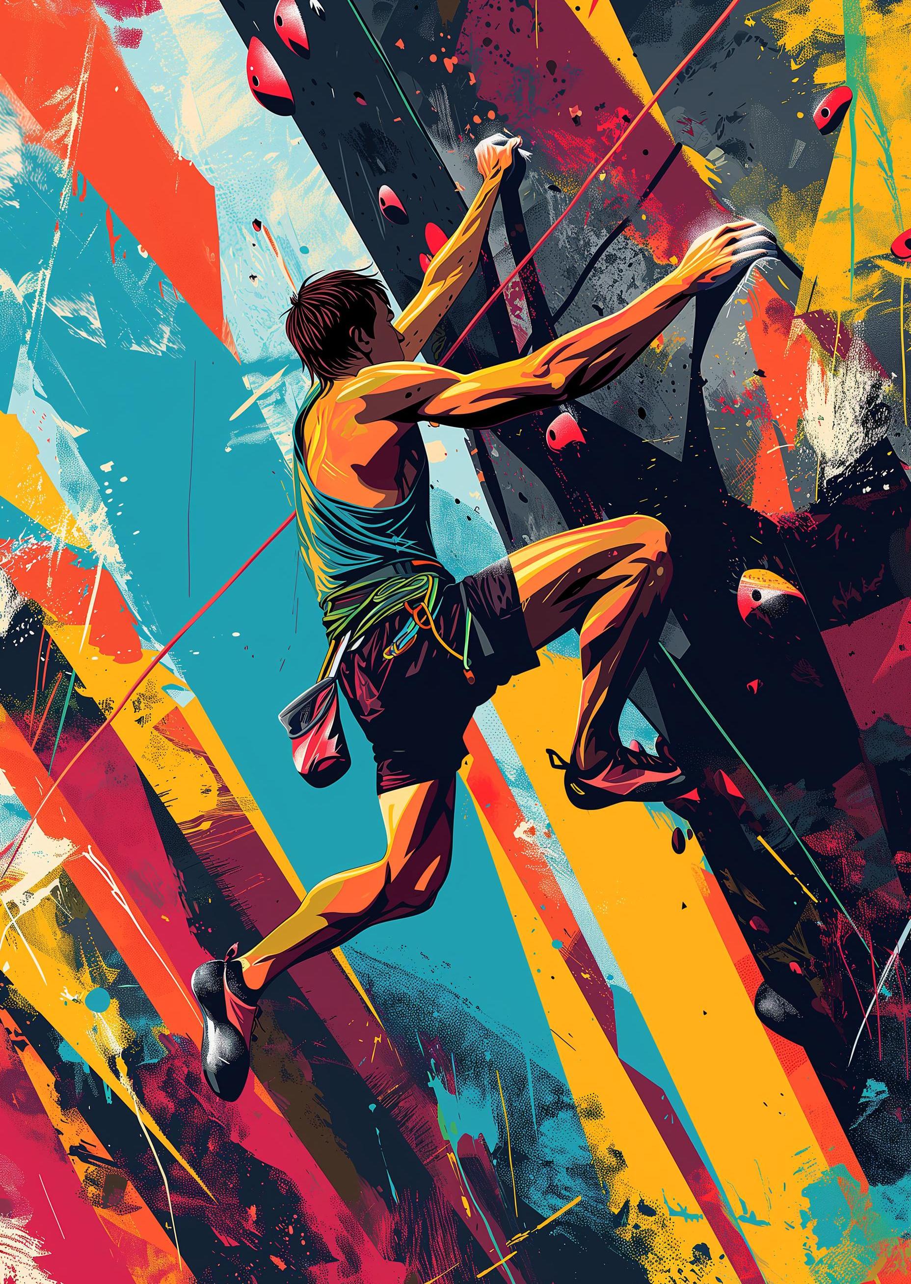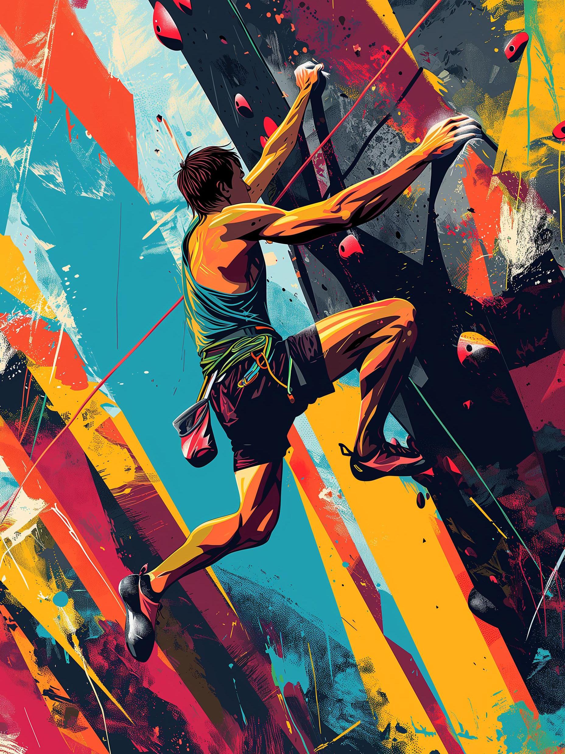 In a colorful arena, a climber faces the vertical challenge. Muscles tense, the athlete reaches up, gripping firmly onto a hold. Each move is a battle against gravity. Below, eyes are locked on this daring ascent, hearts race as the climber defies a fall. Up and up, with skill and grit, they push closer to the summit. The crowd holds its breath, knowing one slip could end the climb. But with a final, powerful leap, victory is snatched. Cheers erupt as the climber triumphs, a mix of relief and joy in the air.