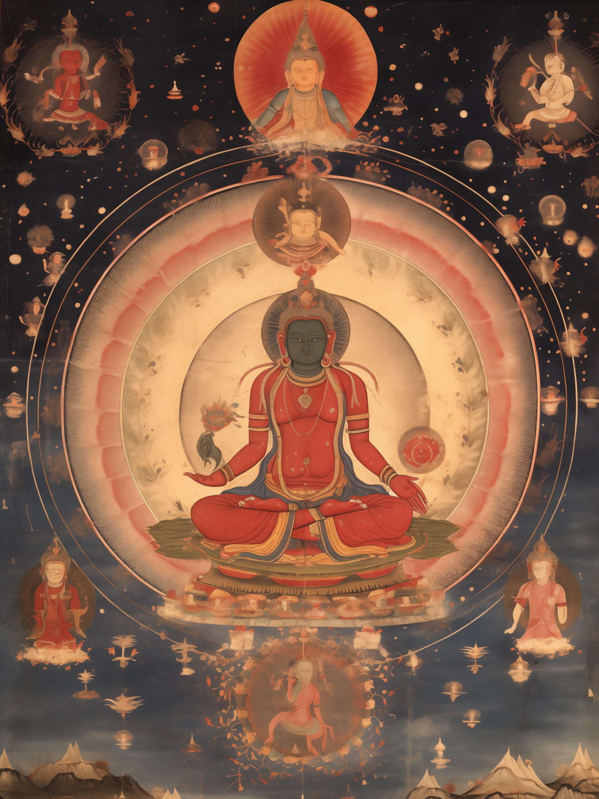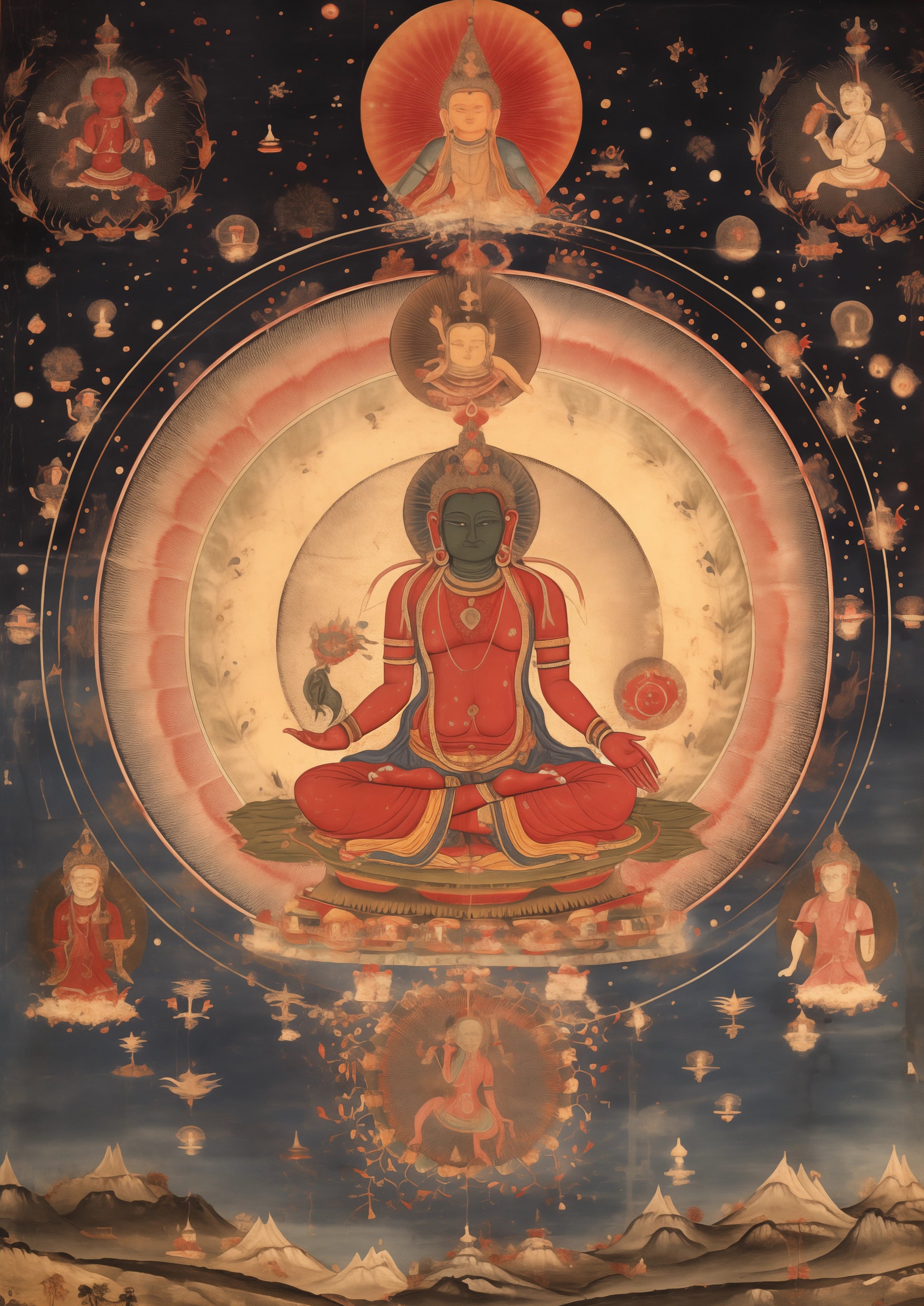 "Brahma’s Embrace" showcases an ancient Hindu depiction. At its center stands Brahma, the creator of the cosmos, encircled by a pantheon of spiritual figures. The intricate imagery captures the cosmic dance of creation and the interplay of divine energies. This poster invites contemplation of the boundless interconnectedness of the spiritual realm. It evokes a sense of reverence for the profound wisdom embedded in Hindu beliefs.