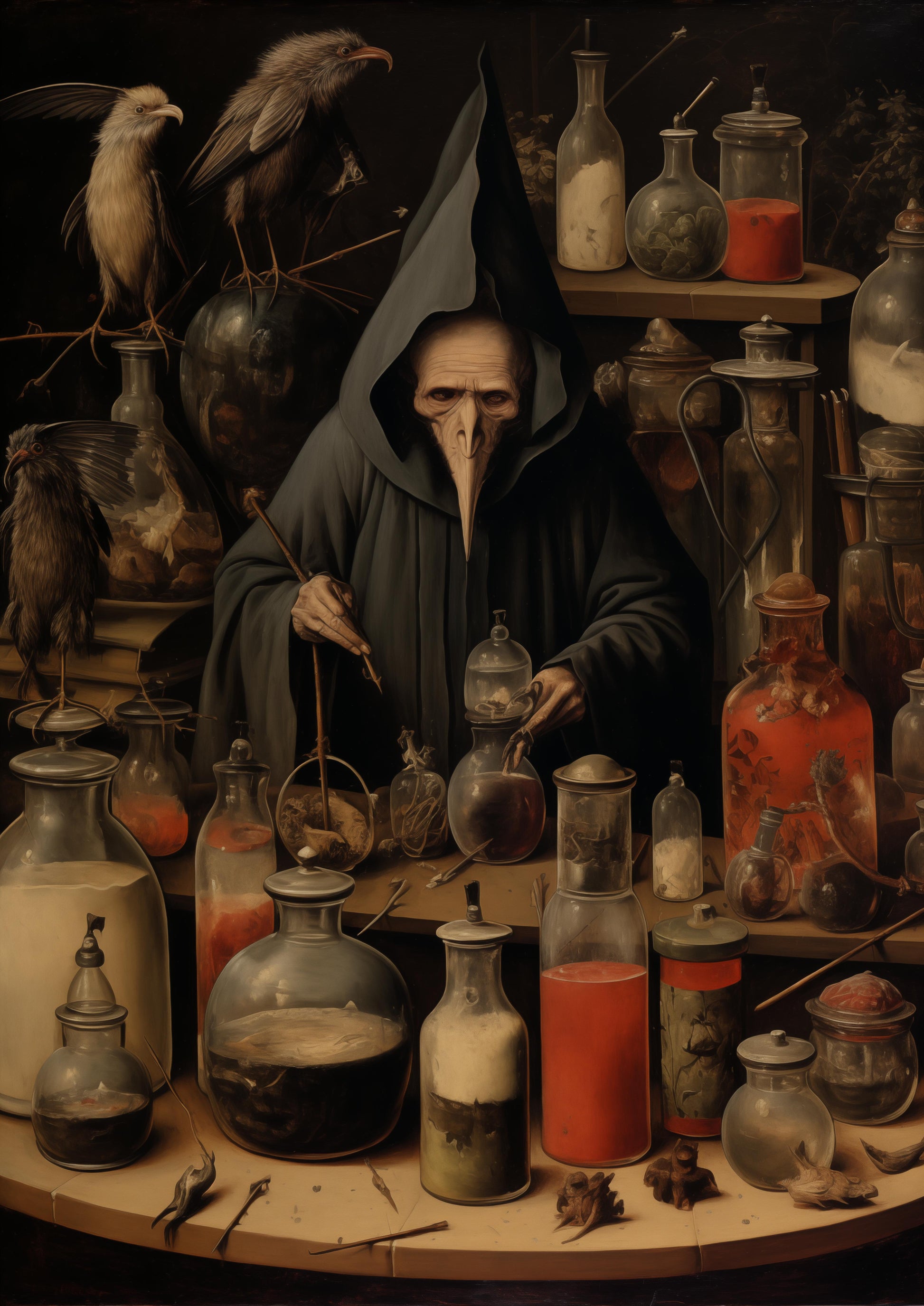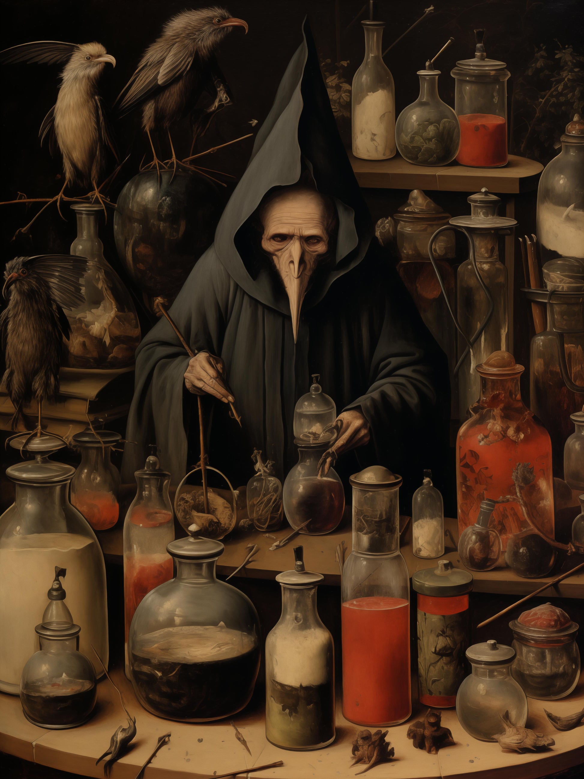 In a dim, dusty corner, an alchemist labors amidst forgotten secrets. Veiled in shadow, their eyes betray a tireless quest for knowledge, gripping vials that hold nature's most cryptic recipes. Feathered onlookers, proud yet curious, stand silent guard over the ancient dance of liquid mingling with liquid. The room pulses with the quiet promise of discovery, where each jar brims with potential, seeming to cradle the fragile essence of life itself. The alchemist, a timeless seeker of wisdom, toils in obscurity, ever searching for the pure elixir that will unlock the world's hidden truths.