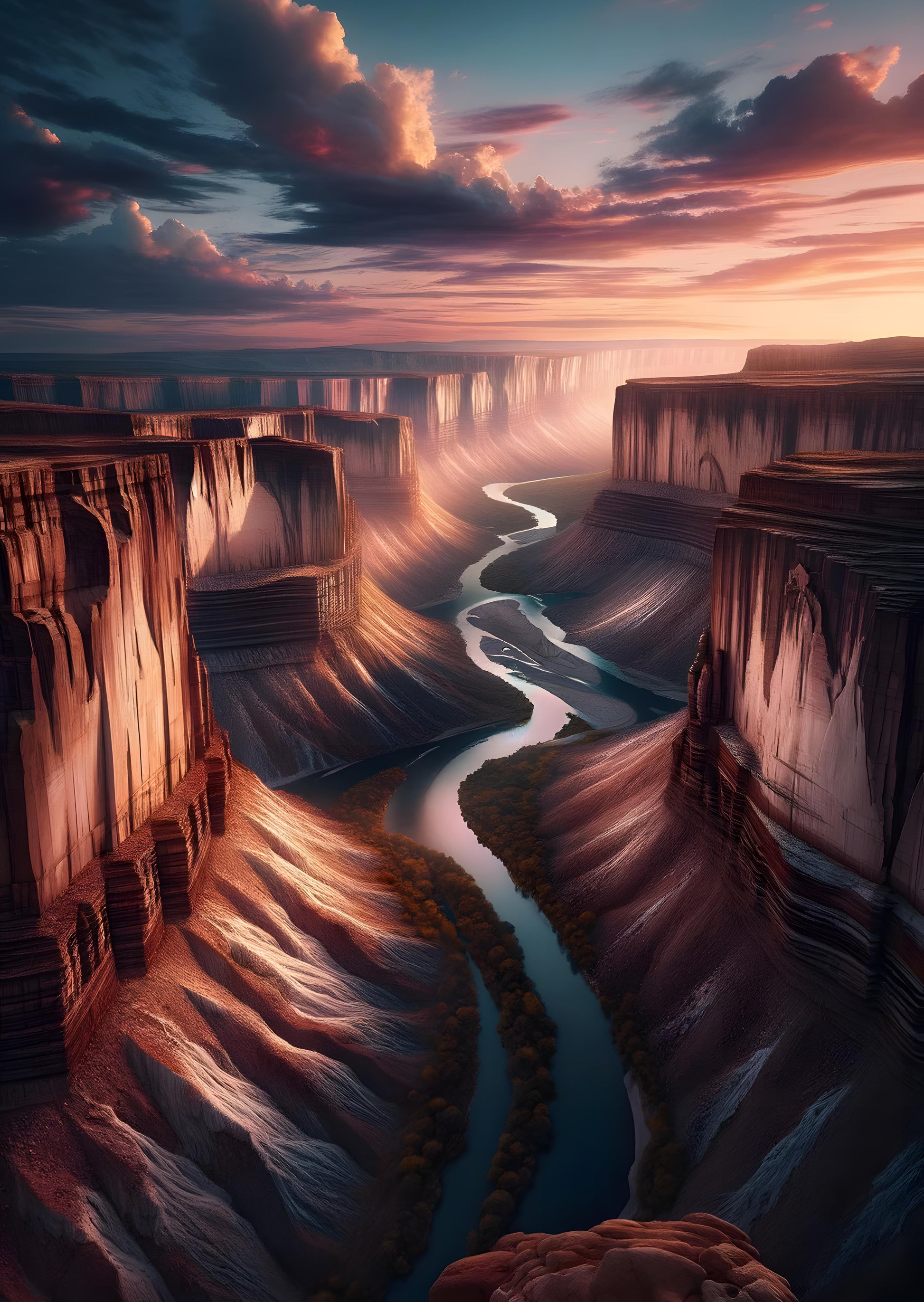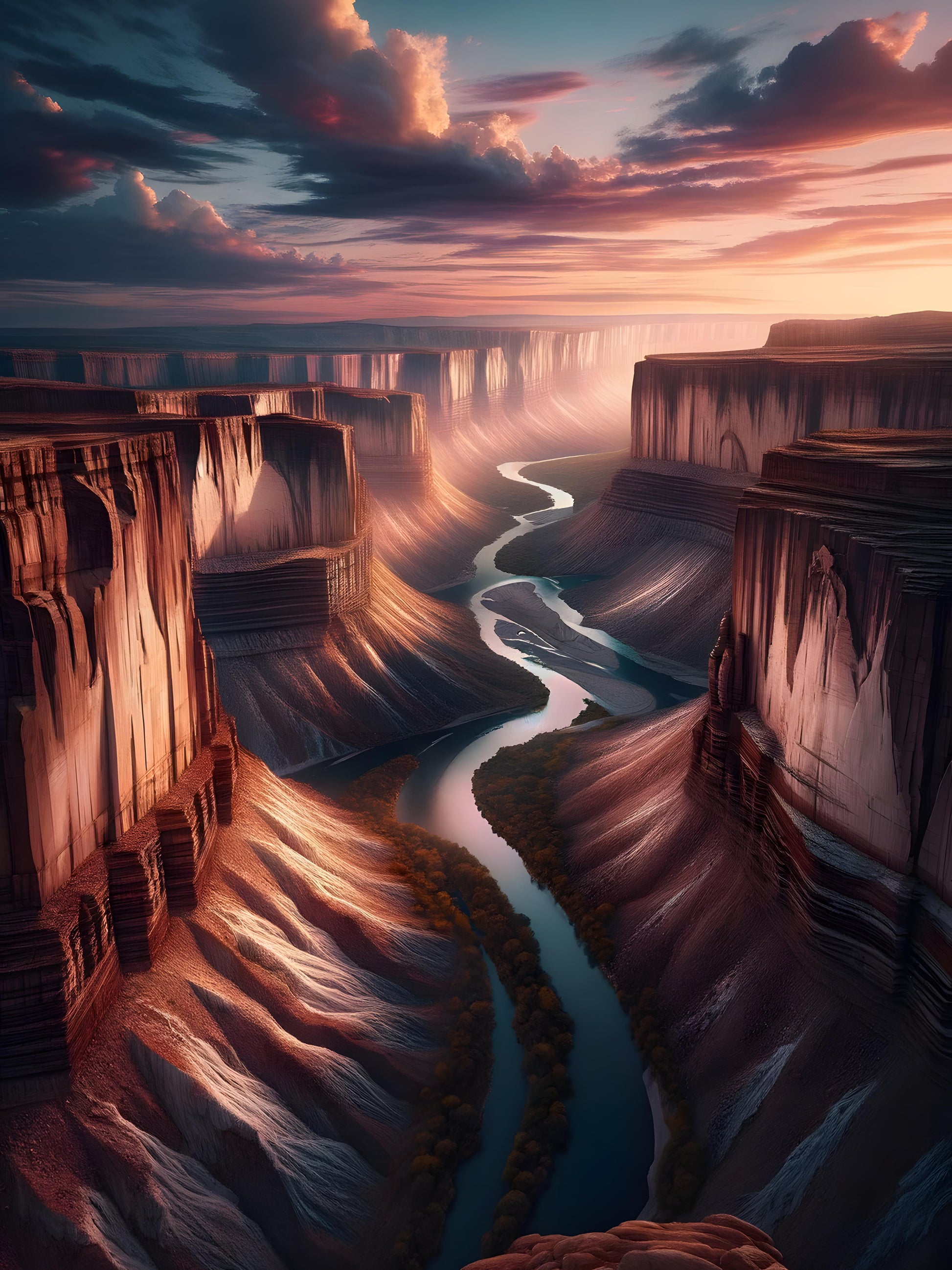In a land where the sky blushes at dawn, there lies a canyon of staggering heights. Carved by time, winding rivers snake through its deep chasms, uniting the colossal cliffs that rise like ancient sentinels guarding forgotten secrets. The soft glow of the sun bathes the landscape in a warm embrace, casting shadows that dance delicately with the day's retreat. This magnificent terrain is a testament to nature's artistry, sculpting grandeur out of rock and water, a canvas where light and shade play in boundless splendor.