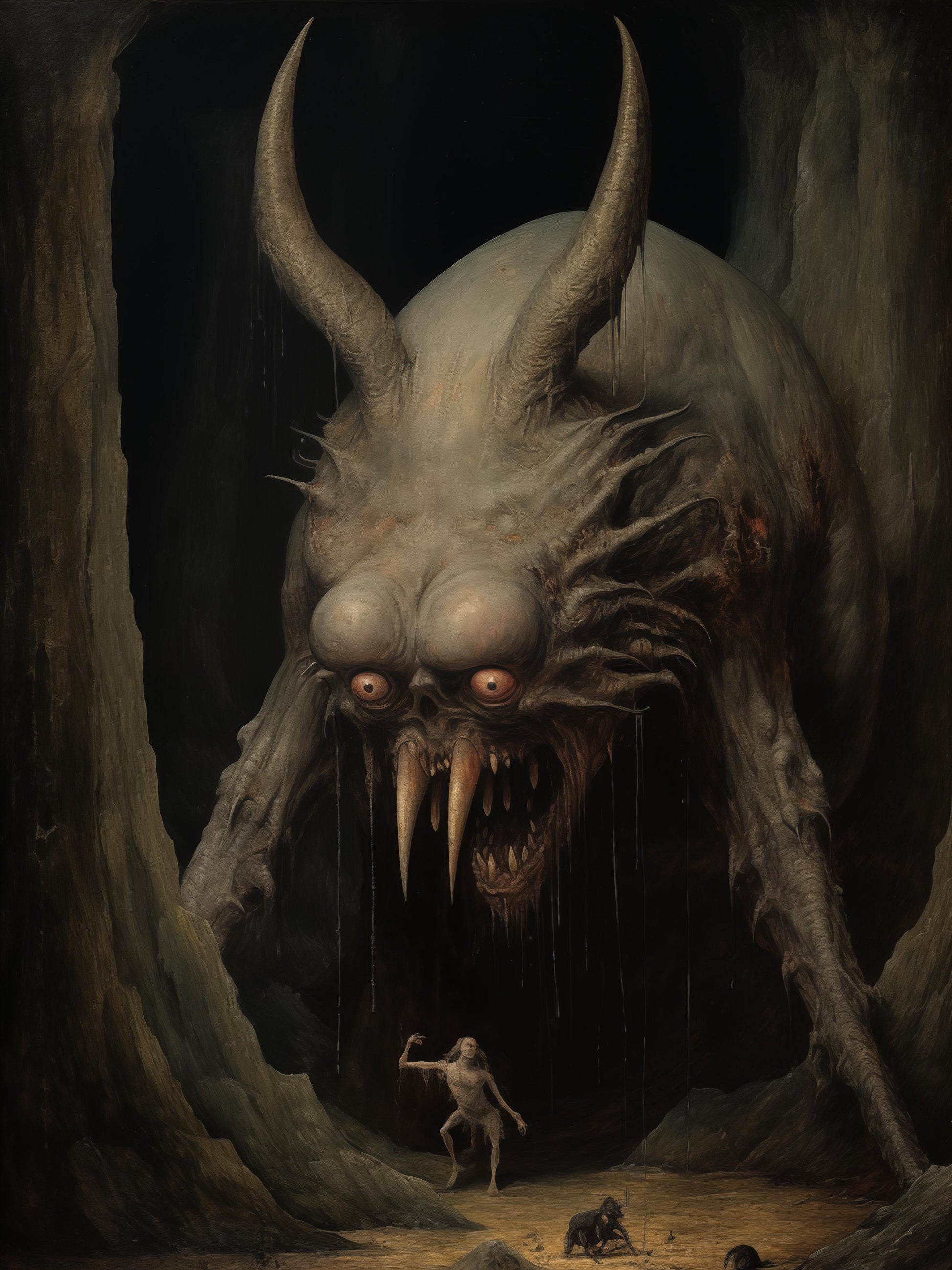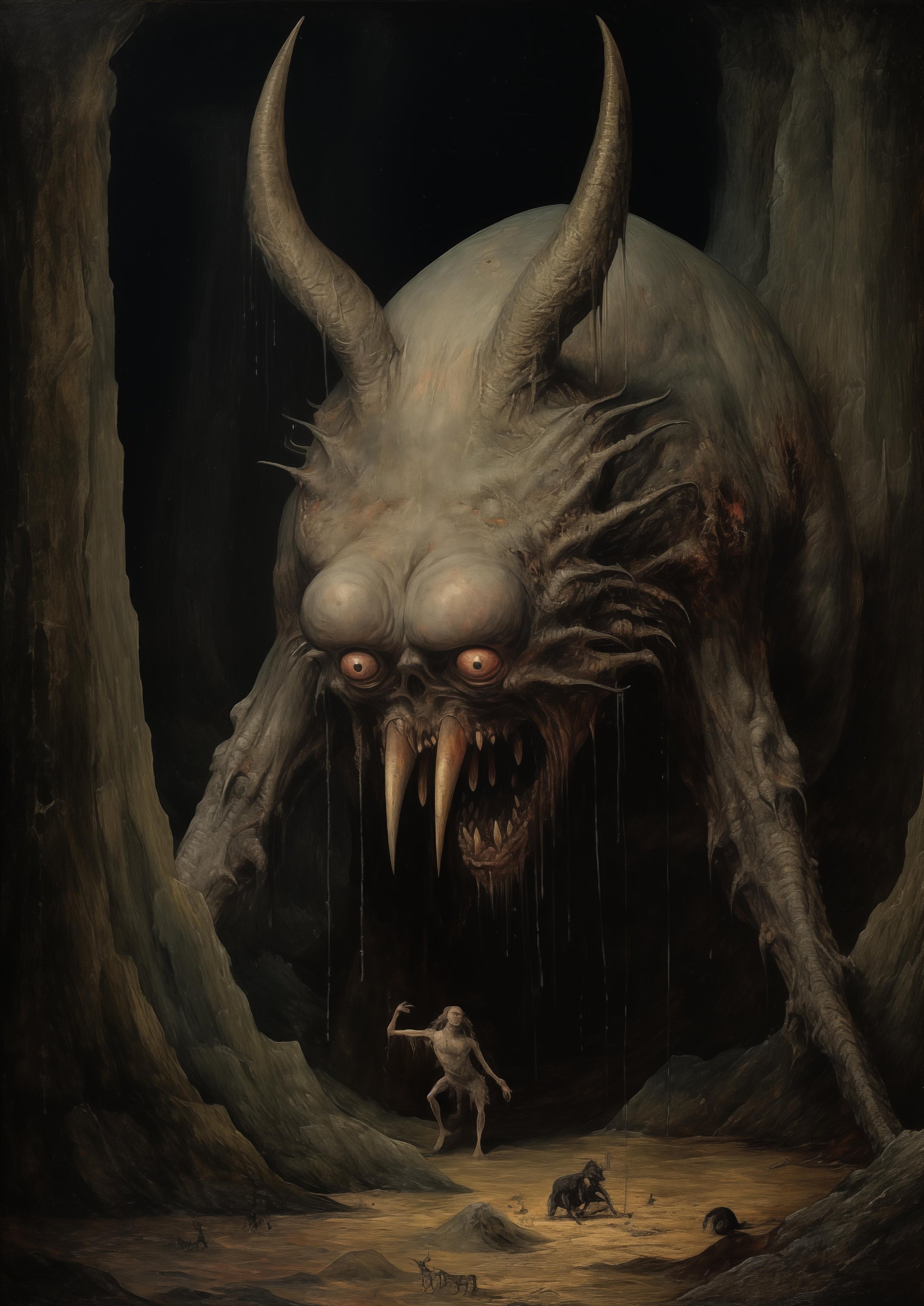 In a dark cavernous realm, an insidious creature dominates the scene, dwarfing the figures below. Its horns stretch toward the enclosed space, eyes protruding with an unsettling gaze that seems fixed beyond the canvas. Sharp fangs drip with a viscous fluid, adding a macabre moisture to the atmosphere. Below the beast, tiny personages enact a silent drama; one stands upright, limbs haphazardly arranged as if caught in a moment of fright or revelation. Around this central figure, other entities engage in unclear activities on the bleak floor, a stark contrast to the imposing figure that looms above. The foreboding presence of the creature and the tableau of beings below conjure a narrative ripe with dark fantasy and the quiet tension of a realm unbound by the comfortable laws of nature.