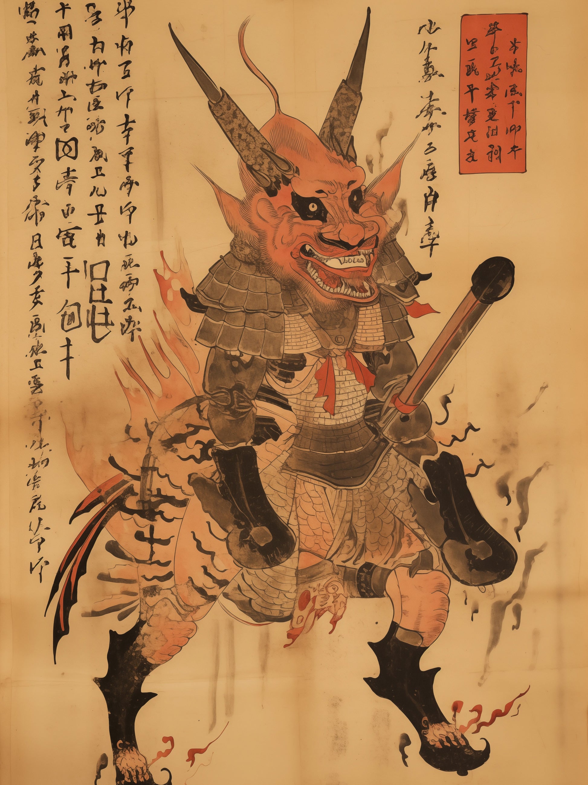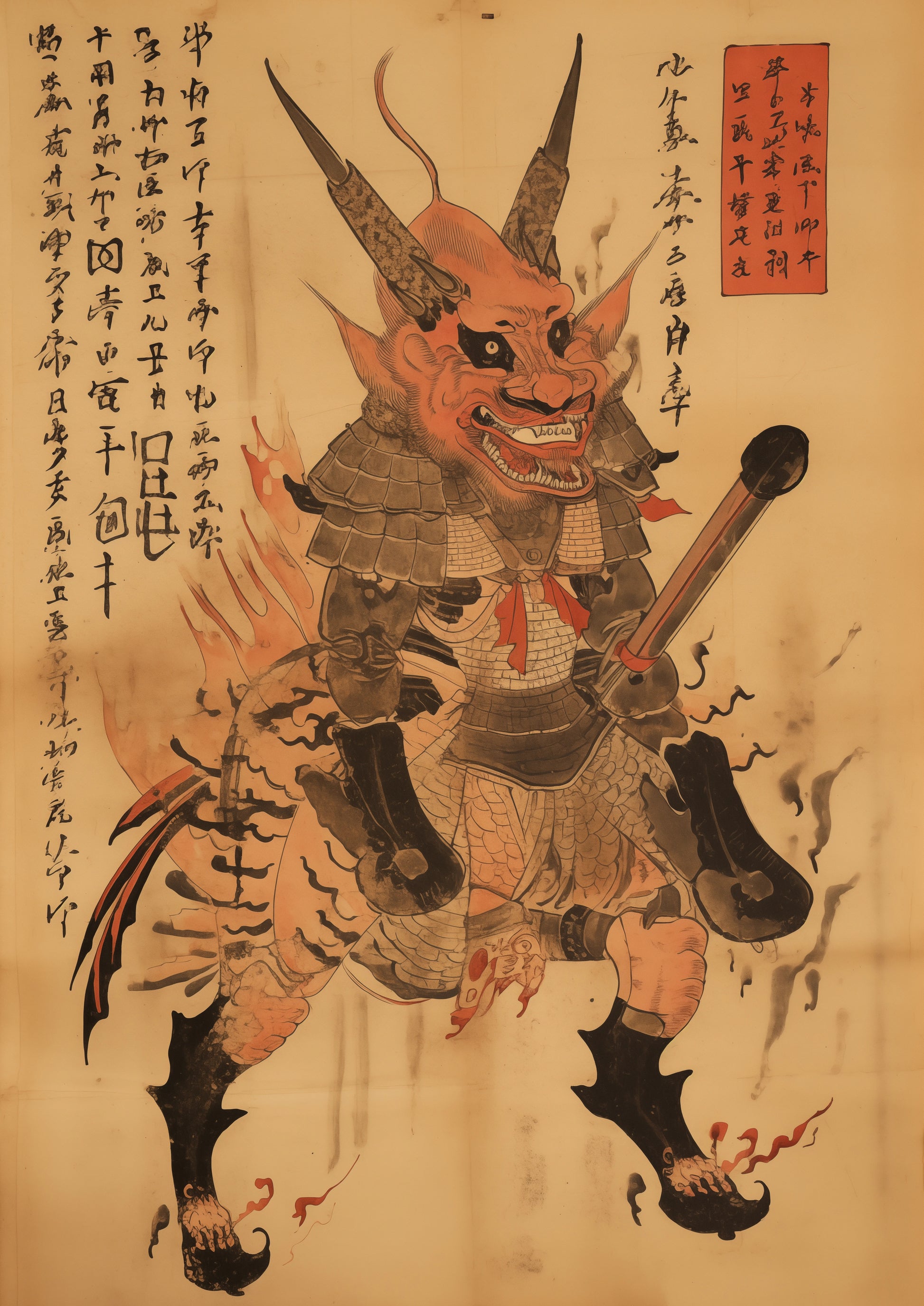 Journey through ancient realms with 'Celestial Guardian,' a captivating poster fusing Chinese mythology and samurai legend. A powerful celestial beast, symbolizing strength and protection, described with Chinese symbols. Explore the rich tapestry of myth and legend in this mesmerizing artwork.