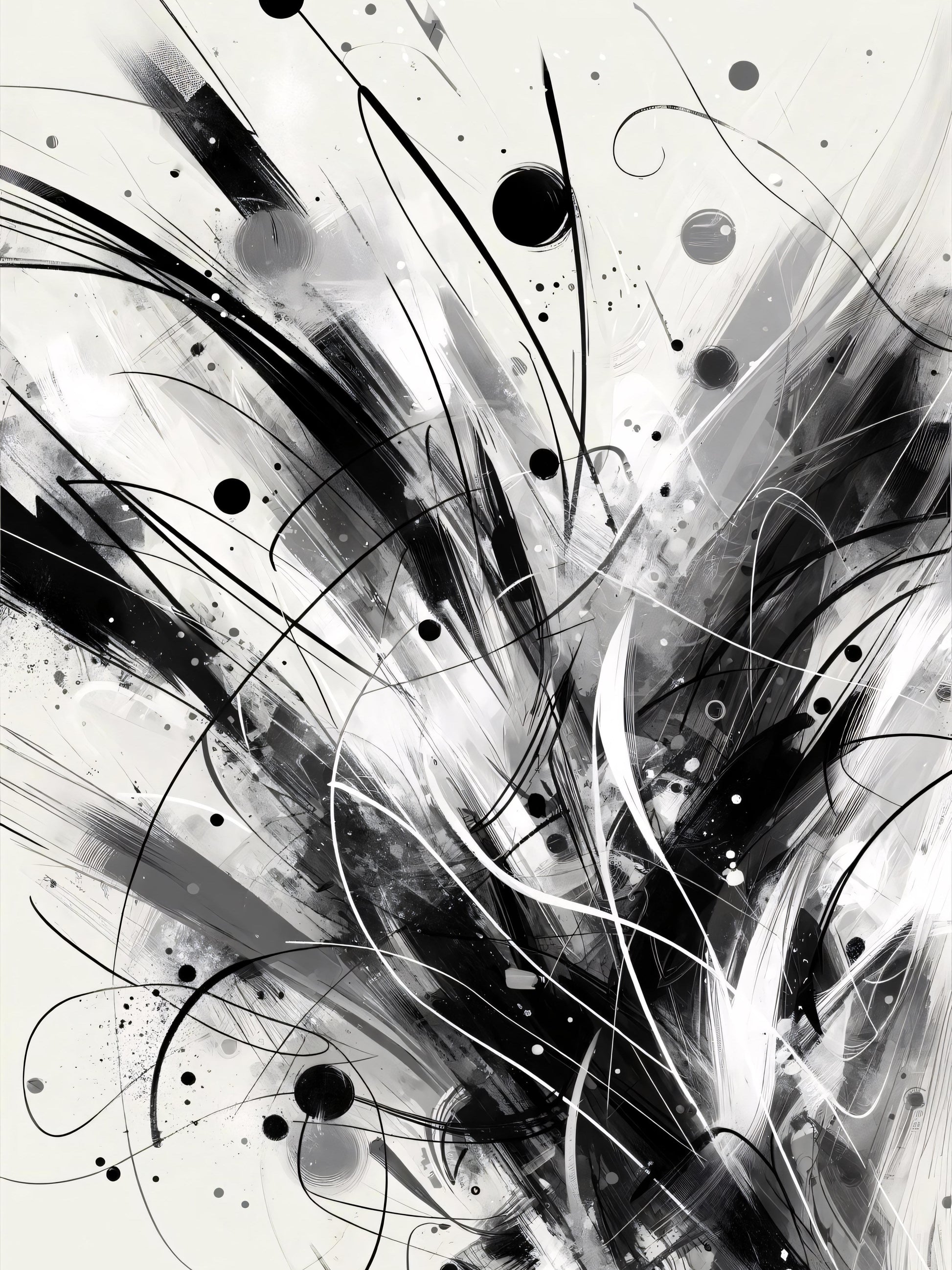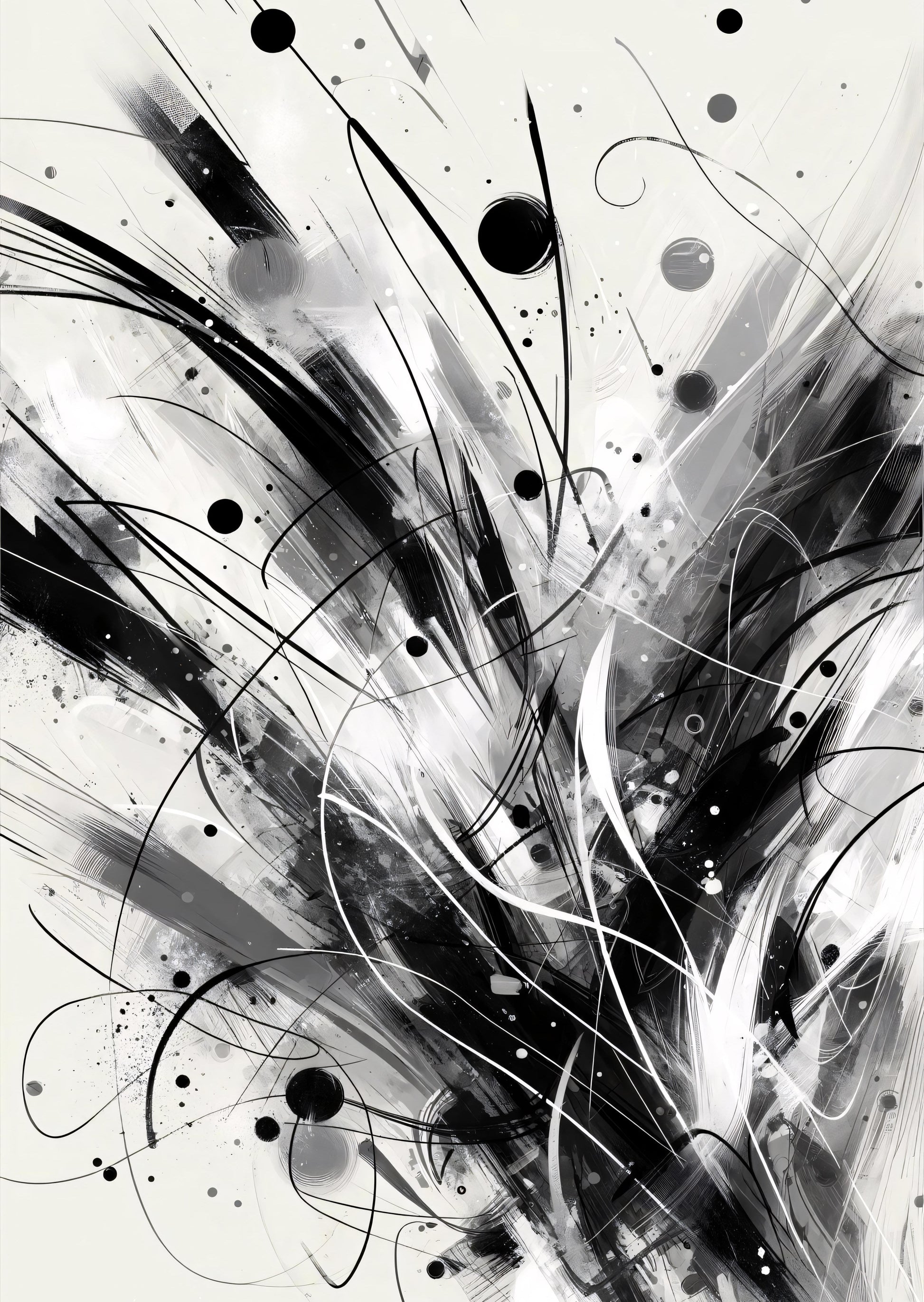 In a world marked by contrast and change, the dance of light and dark shapes creates a story. Like thoughts racing in a busy mind, the swirls and lines clash and intertwine. Amid the chaos, the small dots linger, like precious moments of clarity, reminding us to find meaning in the rush of life. Out of the disorder, one can see a tapestry of life's beauty and complexity, urging us to embrace both the struggles and joys, for they compose the balance of existence. This image's dance is a silent reminder of life's ever-moving, ever-mingling dance.