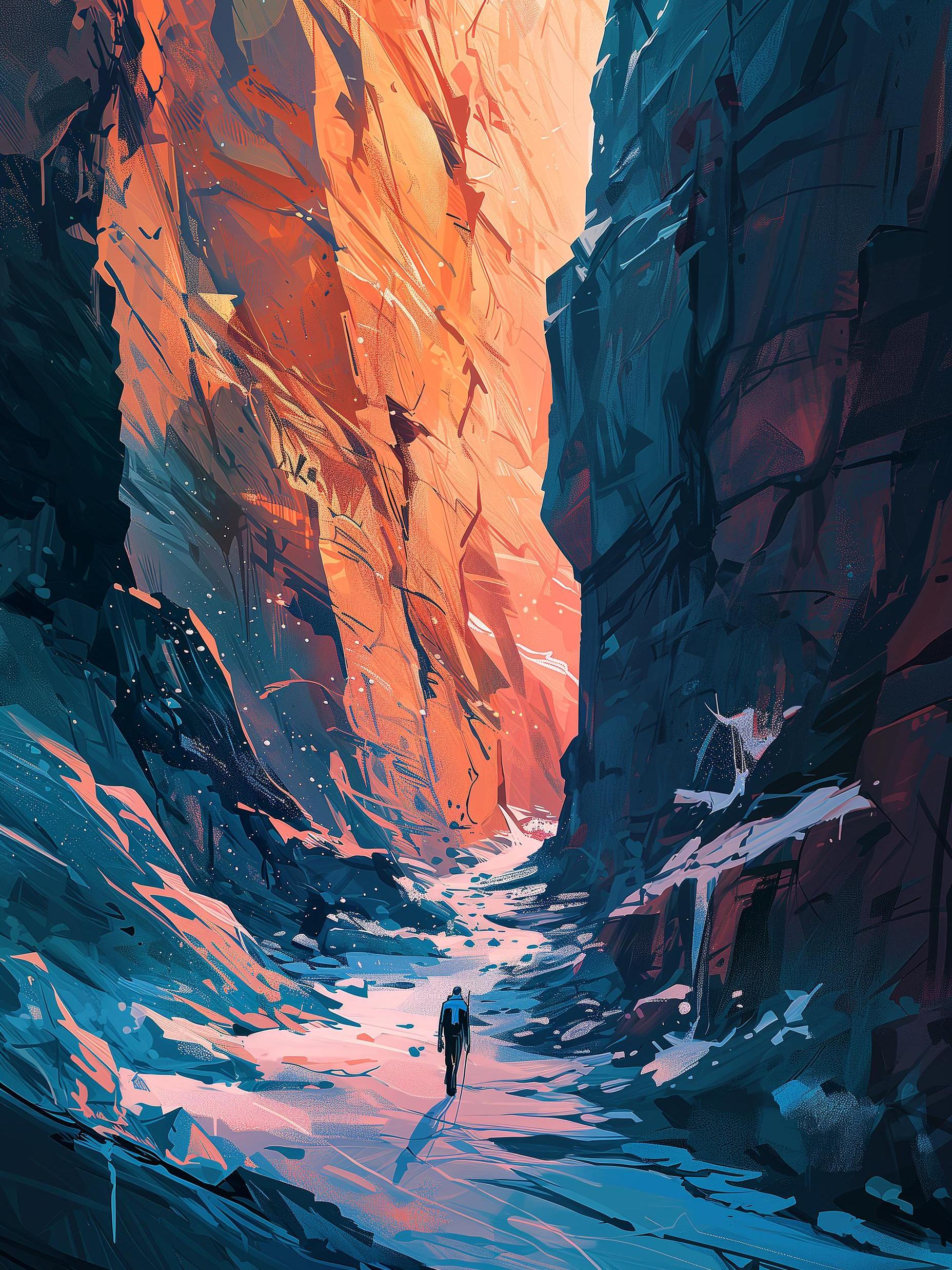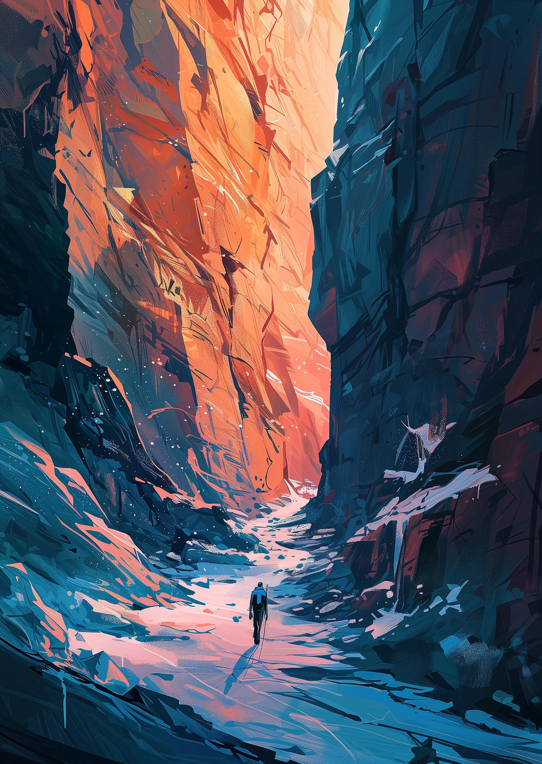 In a world brushed with bold strokes of oranges and blues, a lone figure explores a vast canyon. Gigantic rock walls tower on either side, casting their grand shadows. The light dances through the peaks, setting the air ablaze with color. Our traveler, small against the sprawling canvas of nature, moves forward with purpose. This journey is one of heart and courage, a path towards the unknown, a testament to the adventurer’s spirit within us all. Their silhouette is a quiet statement against the roaring beauty, a single story in the universe’s grand gallery.