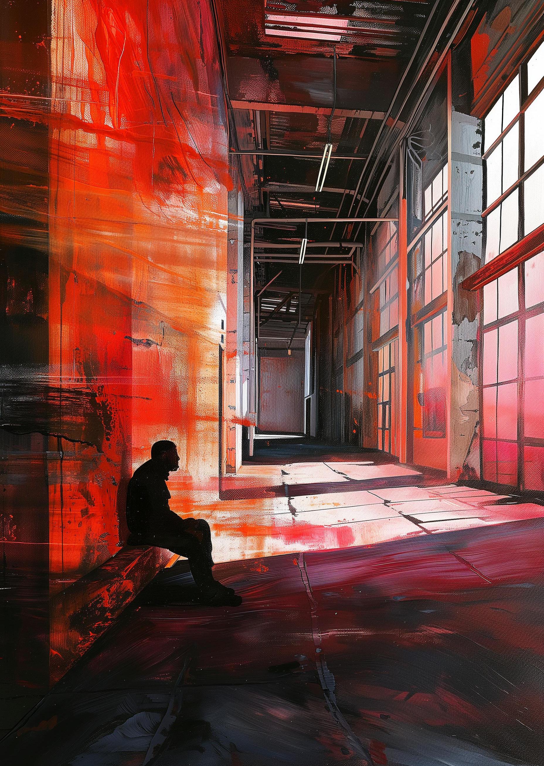 In a place where light and shadow play, a man sits alone, soaked in thoughts beneath crimson hues. The once busy hallway now silent but for the echo of his own breath. Steel and glass frame a dance of red and black, painting his contemplation with bold strokes of solitude. It's an everyday stage turned into a canvas of reflection, where each color tells a piece of his silent tale.