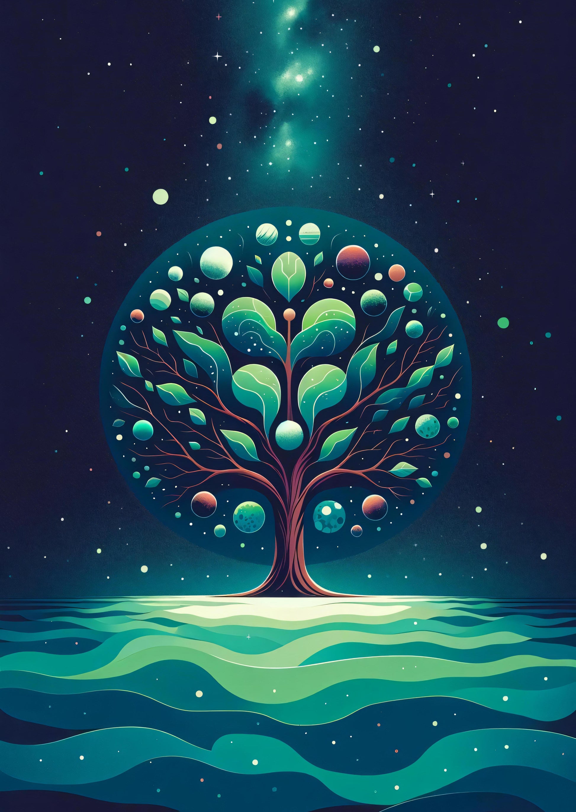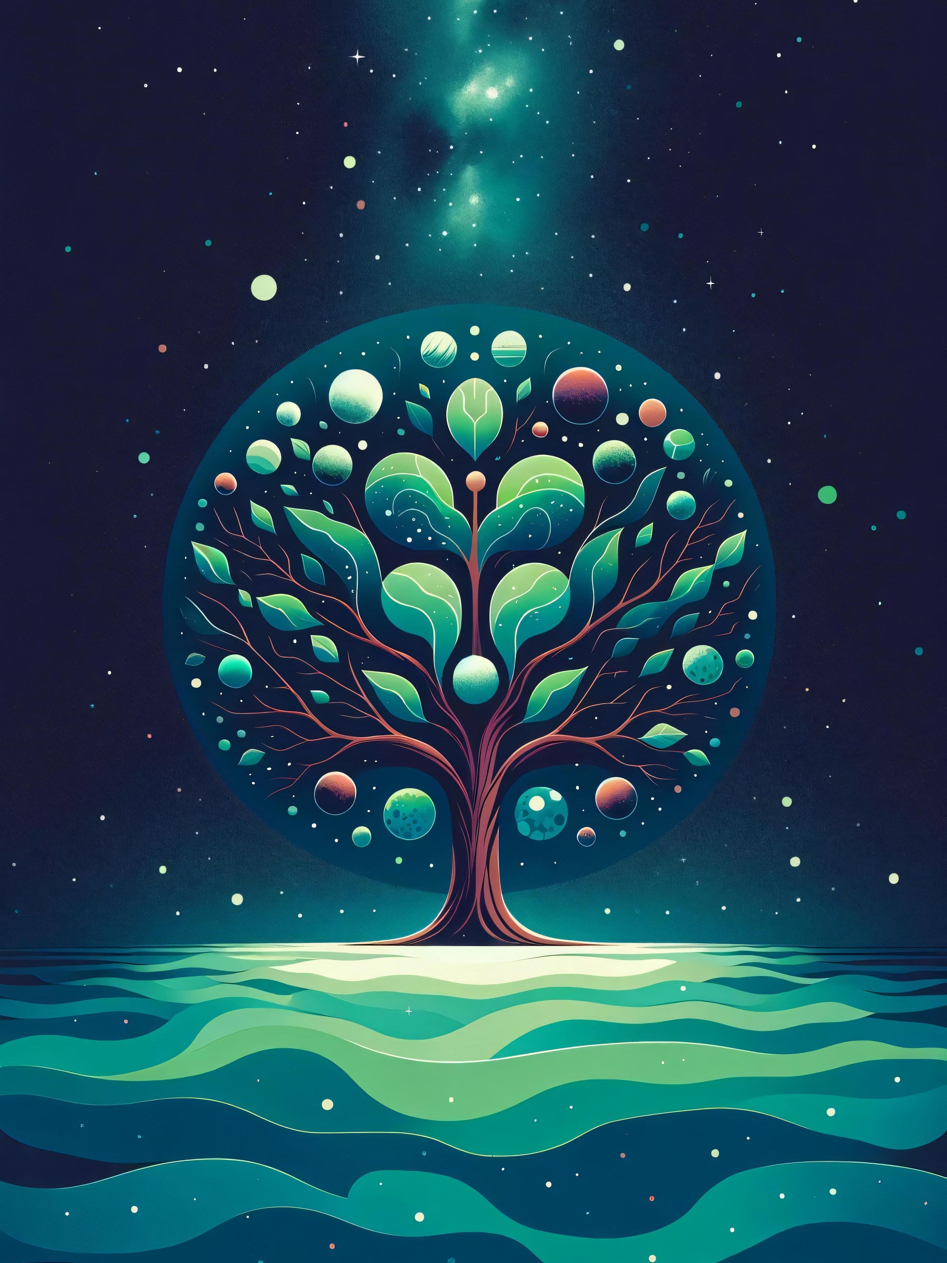 In a realm where the night sky kissed the calm sea, there grew a unique tree. Its leaves were like orbs of different worlds, each glowing with its own light and shade. The tree, deeply rooted in the earth, stretched its branches high into the cosmos, connecting the water below to the stars above. This tree reminded one of the unity between earth and the heavens, a bridge between varied worlds. It was a symbol of life's diversity and the interconnected nature of all things, big and small, earthly and celestial. This was a place to ponder the vastness of existence and the intricate tapestry of life that weaves everything together.