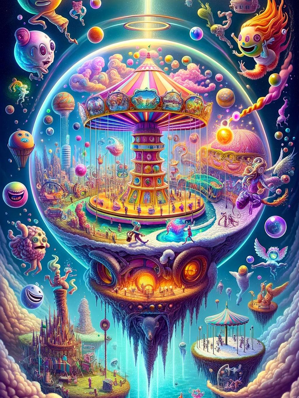 In a world where gravity bowed to joy, a carousel spun, not just with horses but dreams. Around it, creatures floated like balloons, each a story, a hope, a secret. Below, a city teetered on a rock, its very foundation an illusion, light as ideas, strong as belief. Up above, planets aligned, sending beams that danced with life. This was a reality woven from thoughts, where the impossible laughed at limits and potential bloomed like flowers in the sky. In this fantastical dance of existence, the true importance wasn’t in the logic of the ground, but in the boundless skies of imagination.