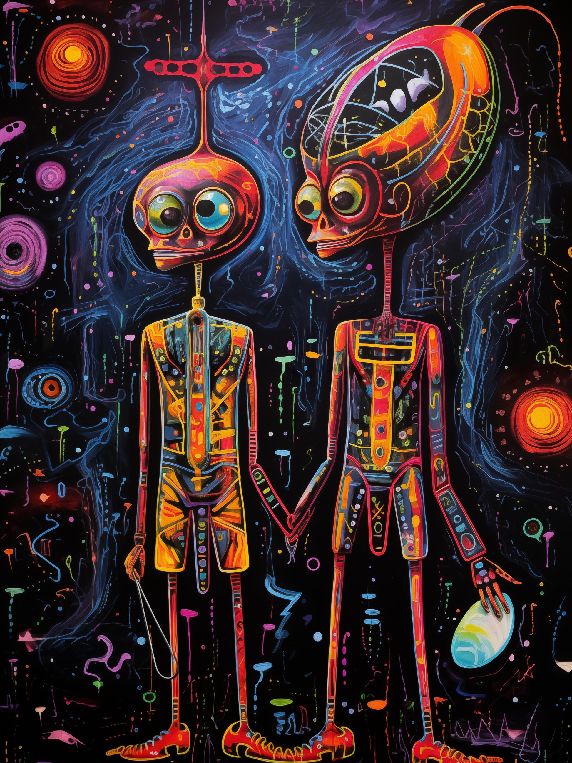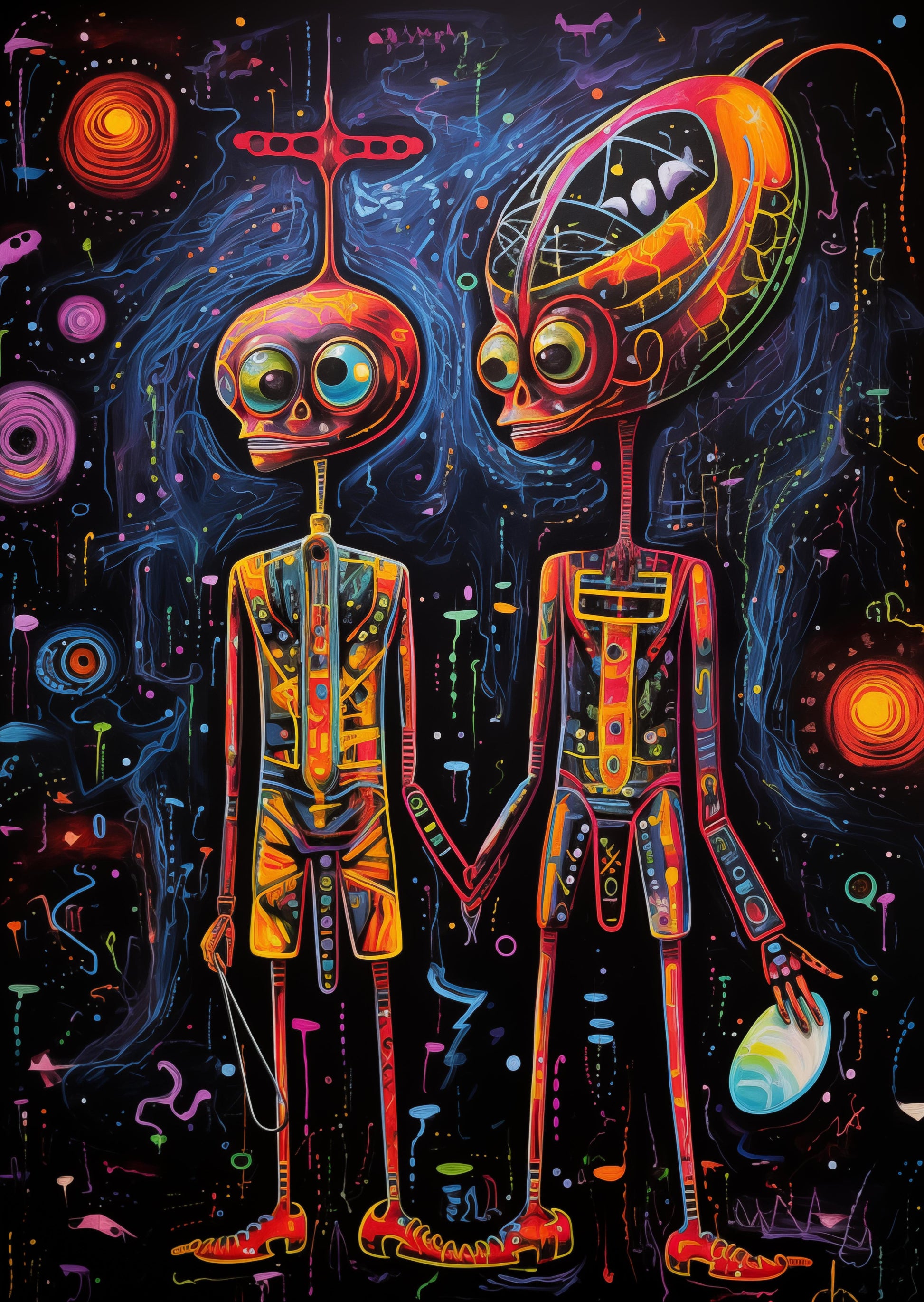 In a cosmic dance of vibrant hues, two extraterrestrial beings find connection amidst the interstellar abyss. Their oversized eyes gaze into the unknown while they stand hand-in-hand, a testament to companionship beyond earthly bounds. In a universe speckled with celestial bodies, from swirling galaxies to radiant stars, their forms are illuminated in neon, a stark contrast to the deep darkness of space. They hold not only each other but also the secrets of distant worlds, standing as colorful guardians against a tapestry of cosmic wonder, their unity a beacon in the vastness of the cosmos.