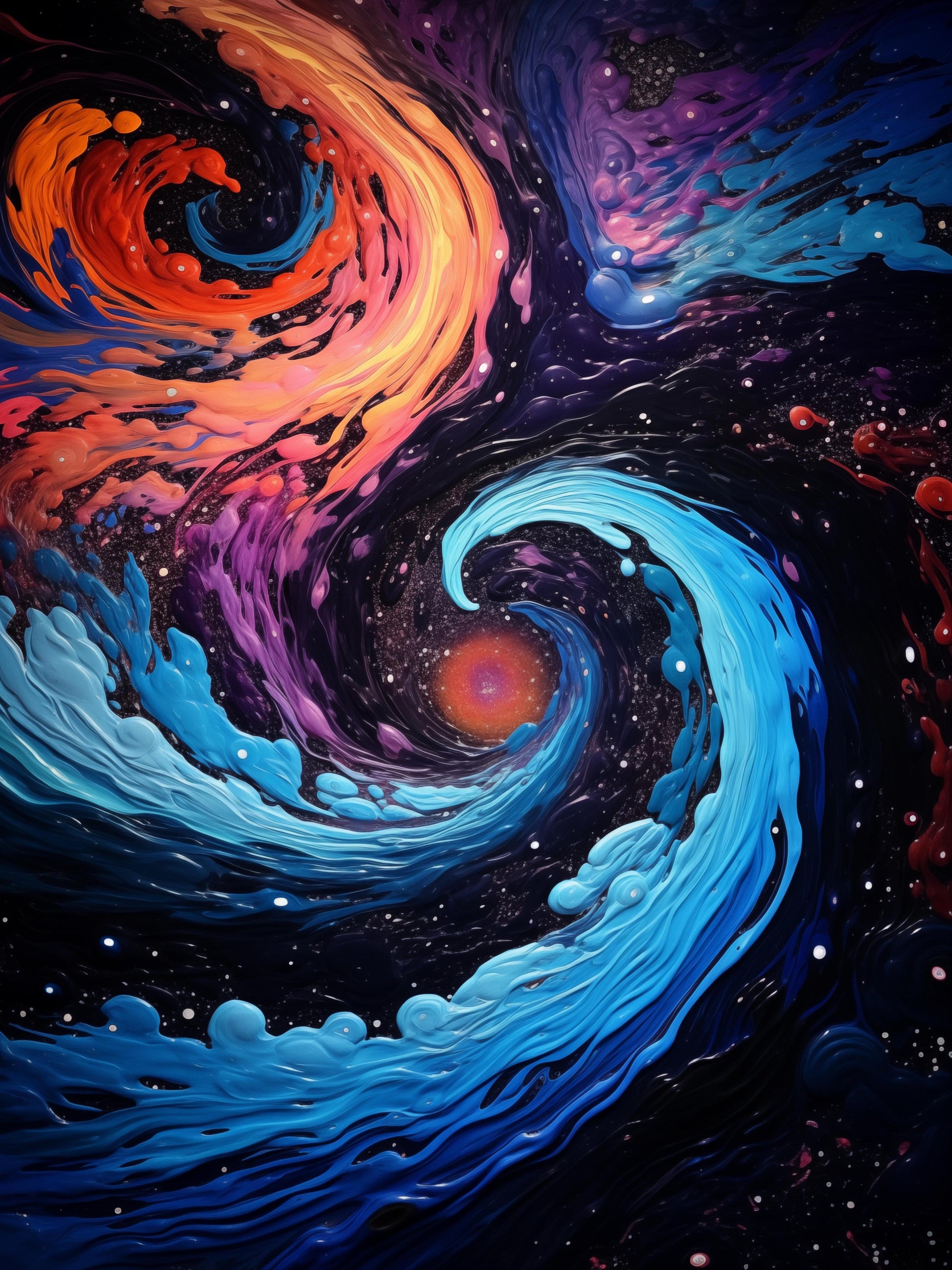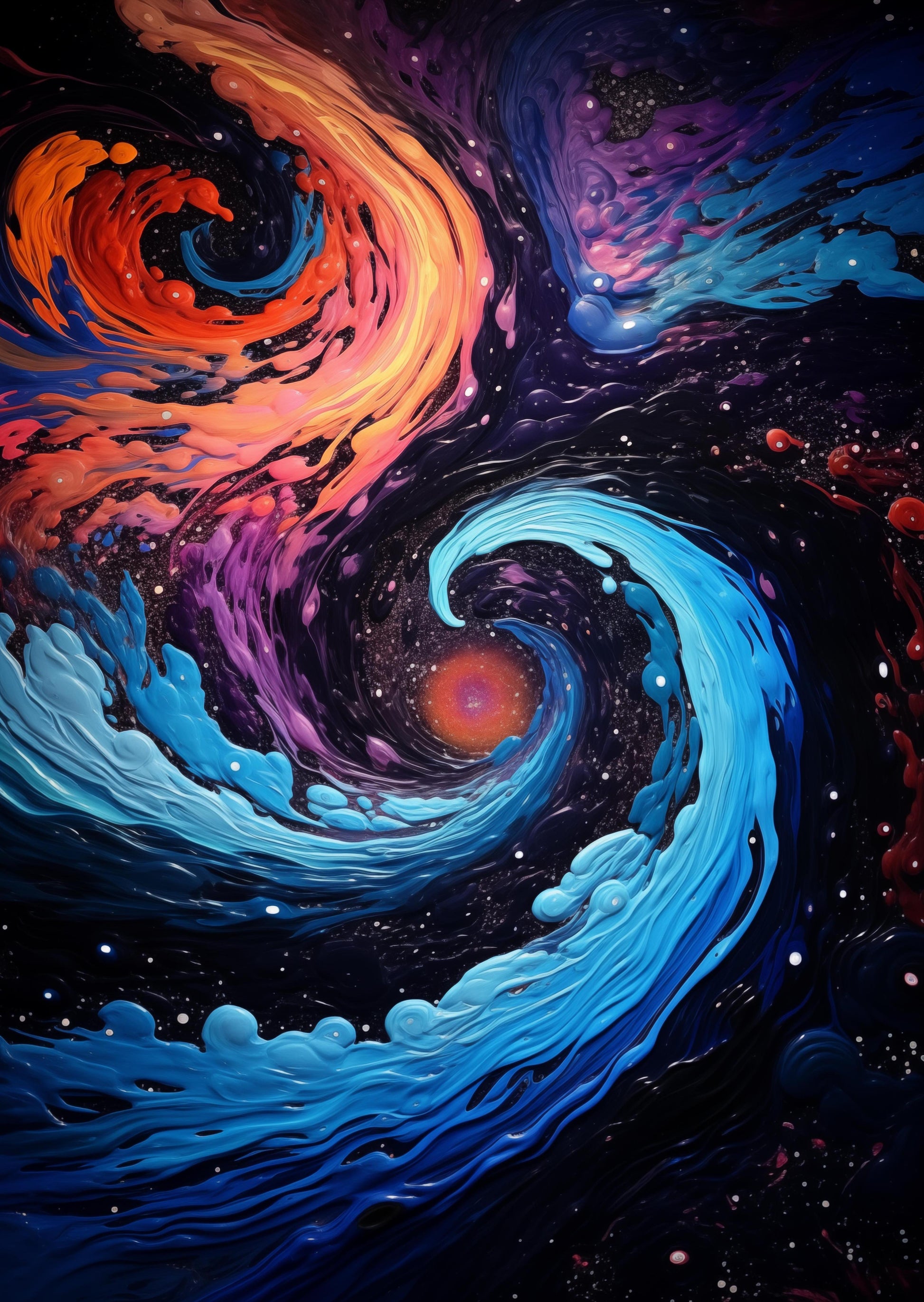 In this vibrant tapestry of colors, a cosmic dance unfolds, revealing the dynamic forces that shape the universe. Swirling hues of fiery orange clash with the deep indigo and cool azure, while specks of light dot the swirling abyss, reminiscent of distant stars scattered across the fabric of space. At the eye of this swirling vortex, a radiant orb pulsates with the warm glow of a nascent star, the promise of new worlds in the making. The image captures a moment of creative chaos, where the primal forces of creation and destruction intertwine in an epic spectacle.