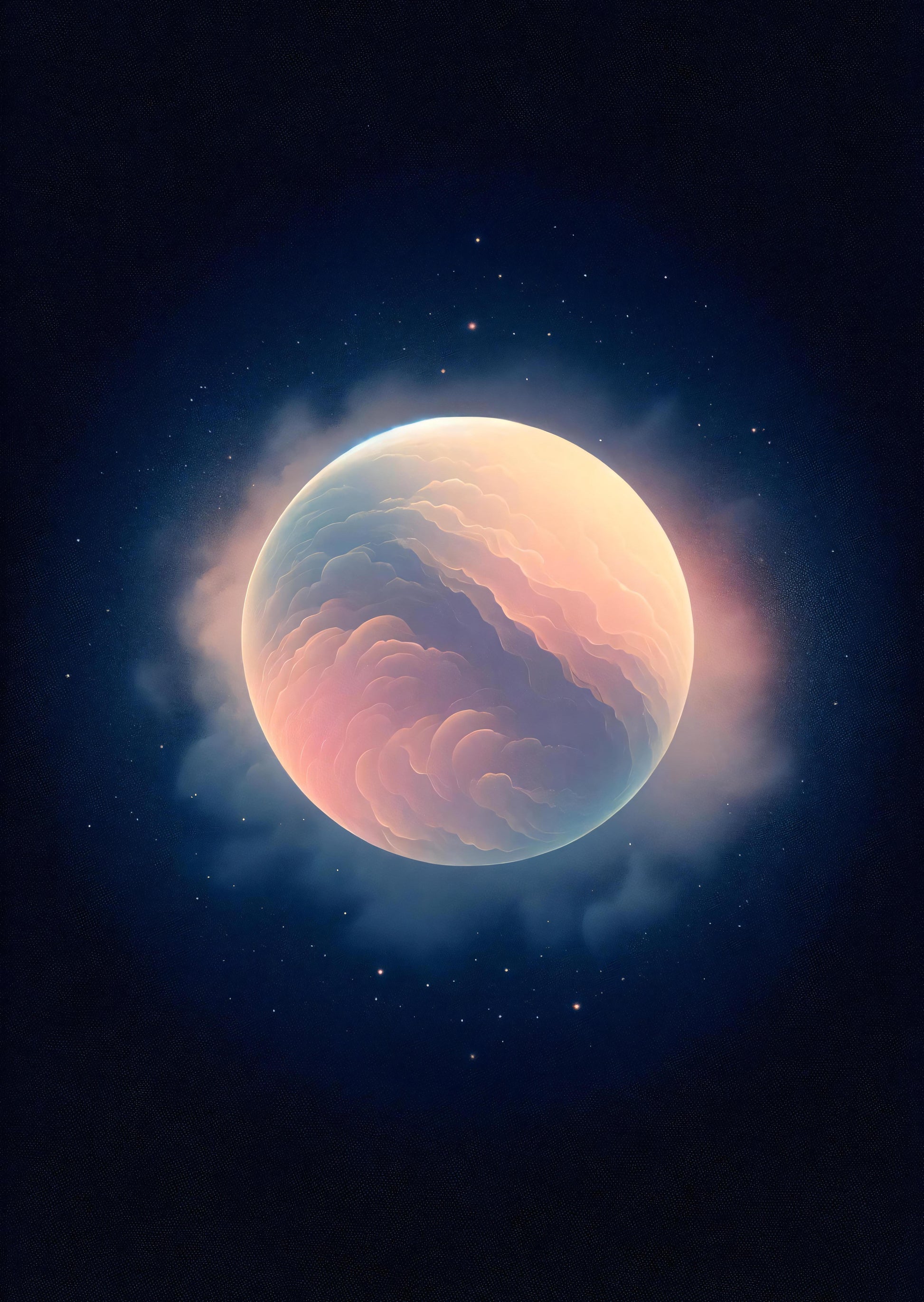 In the endless dance of the cosmos, a lone planet glows, a quiet testament to the vastness around it. Its clouds swirl in a slow, silent waltz, shades of pink and blue reflecting the unseen light of a distant sun. Around this gentle giant, stars twinkle like tiny guides, each a story untold, a life unseen. This image captures the beauty of the universe, reminding us that in the cosmic expanse, we are but small observers of an unfathomable show. It teaches us humility and ignites curiosity, inviting us to ponder what lies beyond our own world. In the vast, dark space, this bright orb speaks to the explorer in us all, daring us to dream and discover.