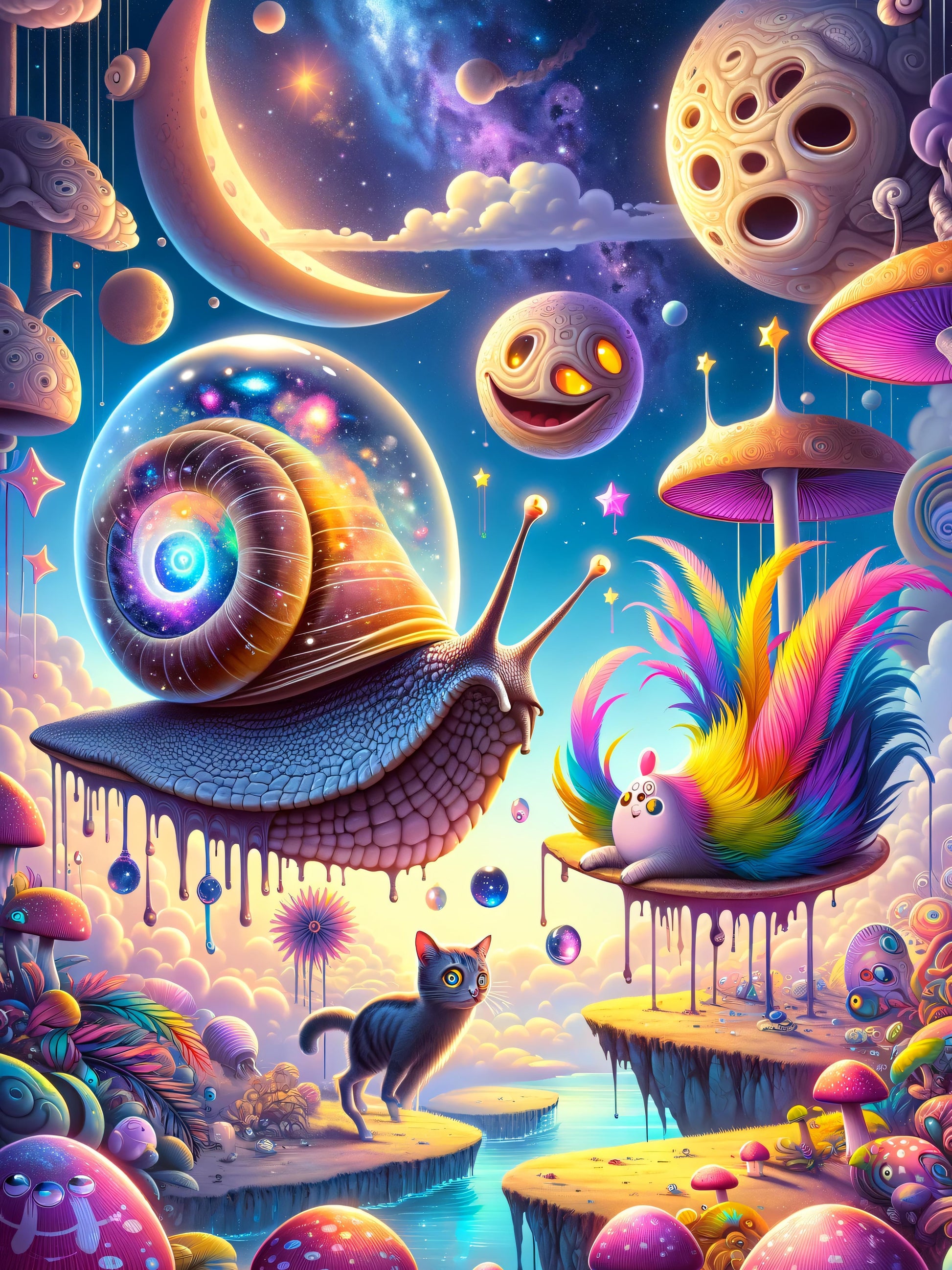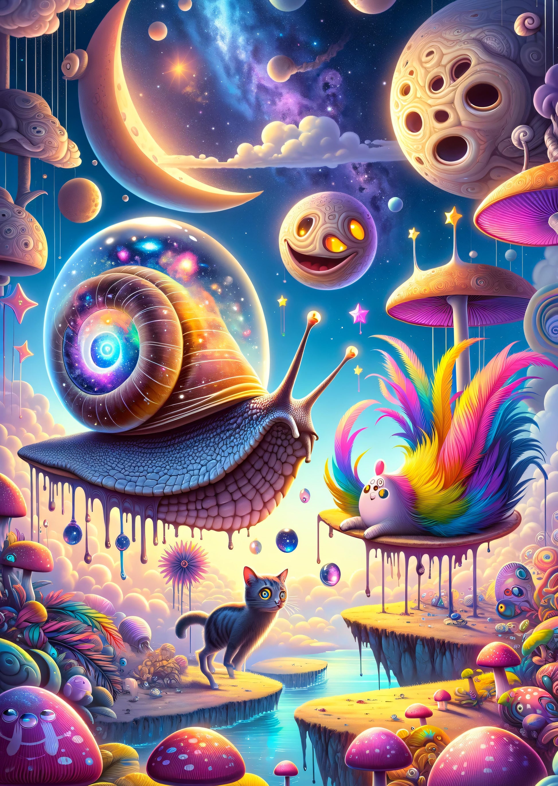 In a land where the sky blooms with cosmic wonders, a snail carries a universe on its back, reminding us that every creature, big or small, holds a world within. A cat gazes out, curious and bright-eyed, symbolizing the quest for knowledge and the courage to explore. Nearby, a creature rests among colorful plumes, a beacon of creativity and the joy found in imagination. The moons grin widely, the stars twinkle in delight, and every element coexists in a playful dance, teaching us that life's beauty lies in diversity and the unexpected magic around us.