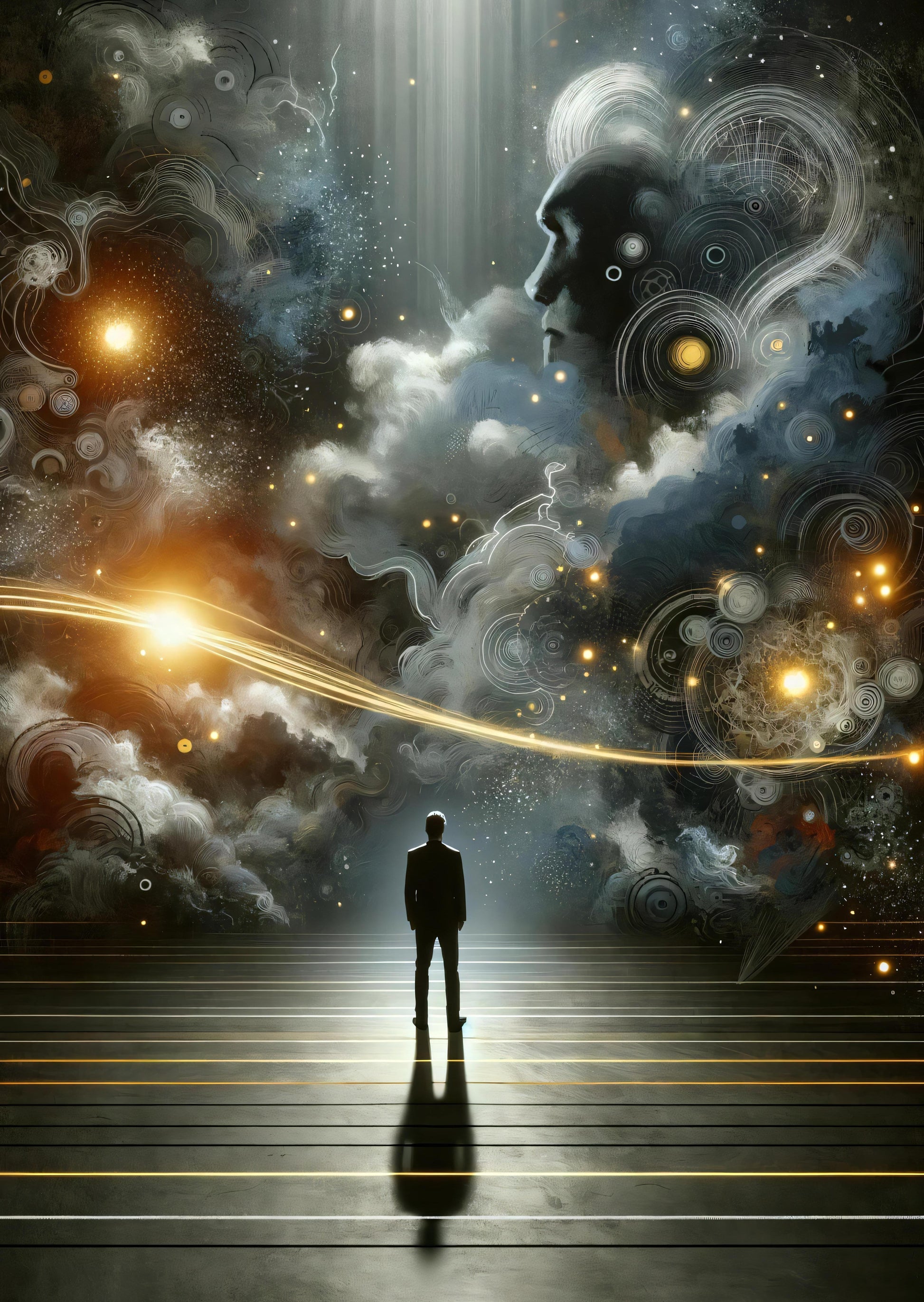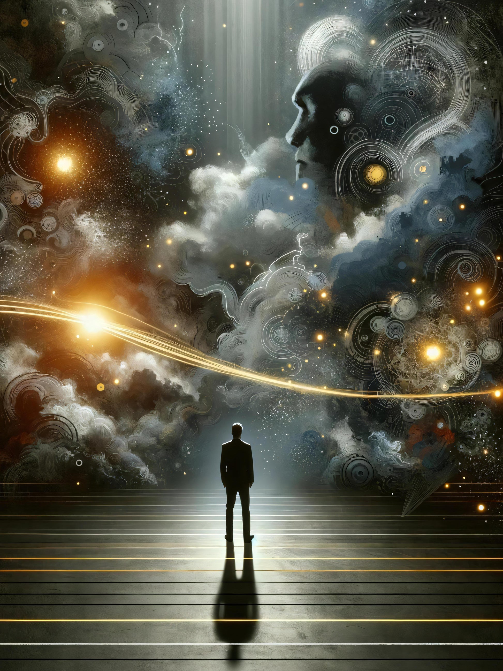 Delve into the depths of the subconscious as this image invites viewers on a journey through the human psyche With a lone figure standing at the threshold of an ethereal landscape, the scene encapsulates the complexity of thoughts, dreams, and inner chaos that intertwine within our minds The swirls of darkness and bursts of light symbolize the contrasting forces of the id, ego, and superego, battling for dominance in an ever-flowing psychological narrative This portrayal is a visual representation of the mental maelstrom where the conscious and unconscious mind meet, presenting a striking analogy for the exploration of self and the untapped potential within.