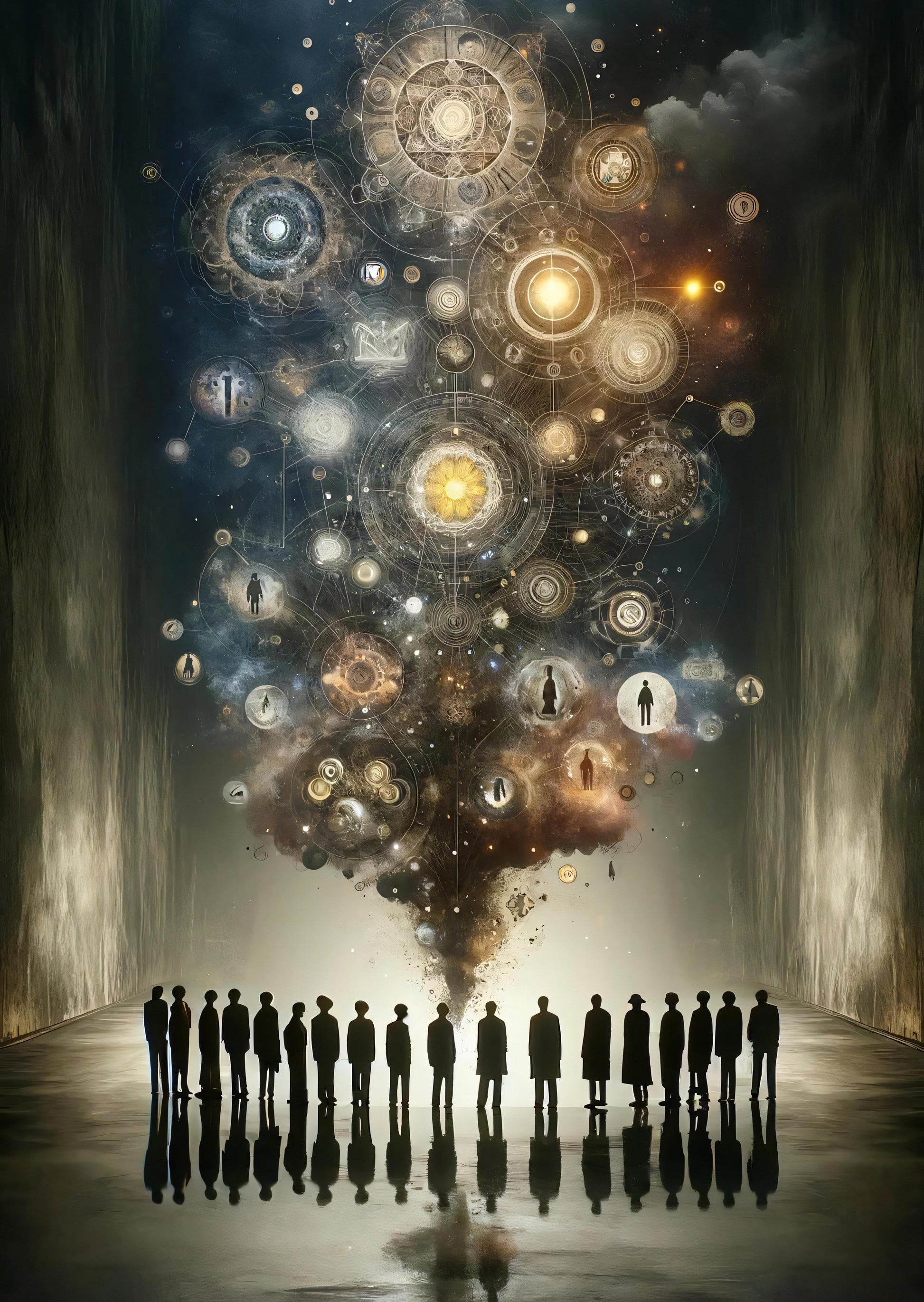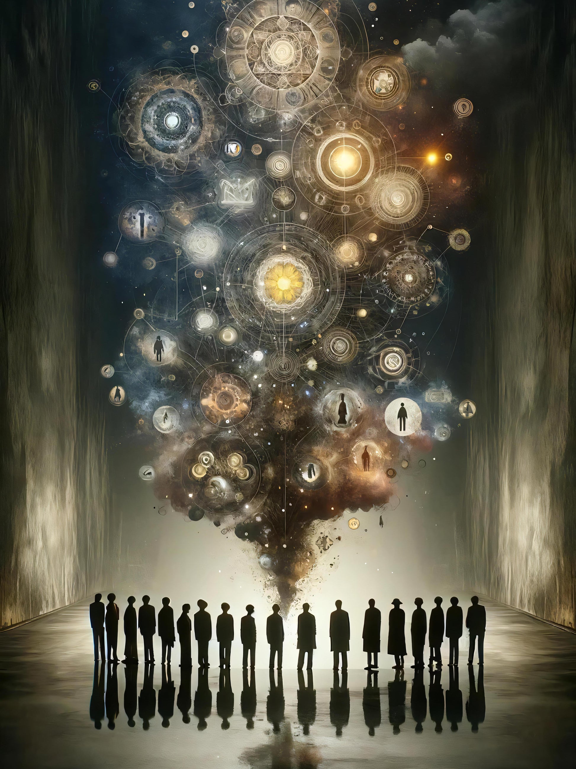 Embark on a journey through the mind's eye depicted in this evocative visual exploration. Subjects stand at the threshold, gazing into an expansive mindscape where thoughts, emotions, and consciousness converge into complex, interlocking patterns. This image illustrates psychological phenomena, mirroring processes such as cognition, perception, and the intricacies of human consciousness. Intertwined in the cosmic framework are symbols representing the components of the psyche, inviting viewers to reflect on the interplay between their inner worlds and the vastness of psychological understanding. This artistic representation captures the essence of mental processes and the collective human quest for self-awareness and knowledge.