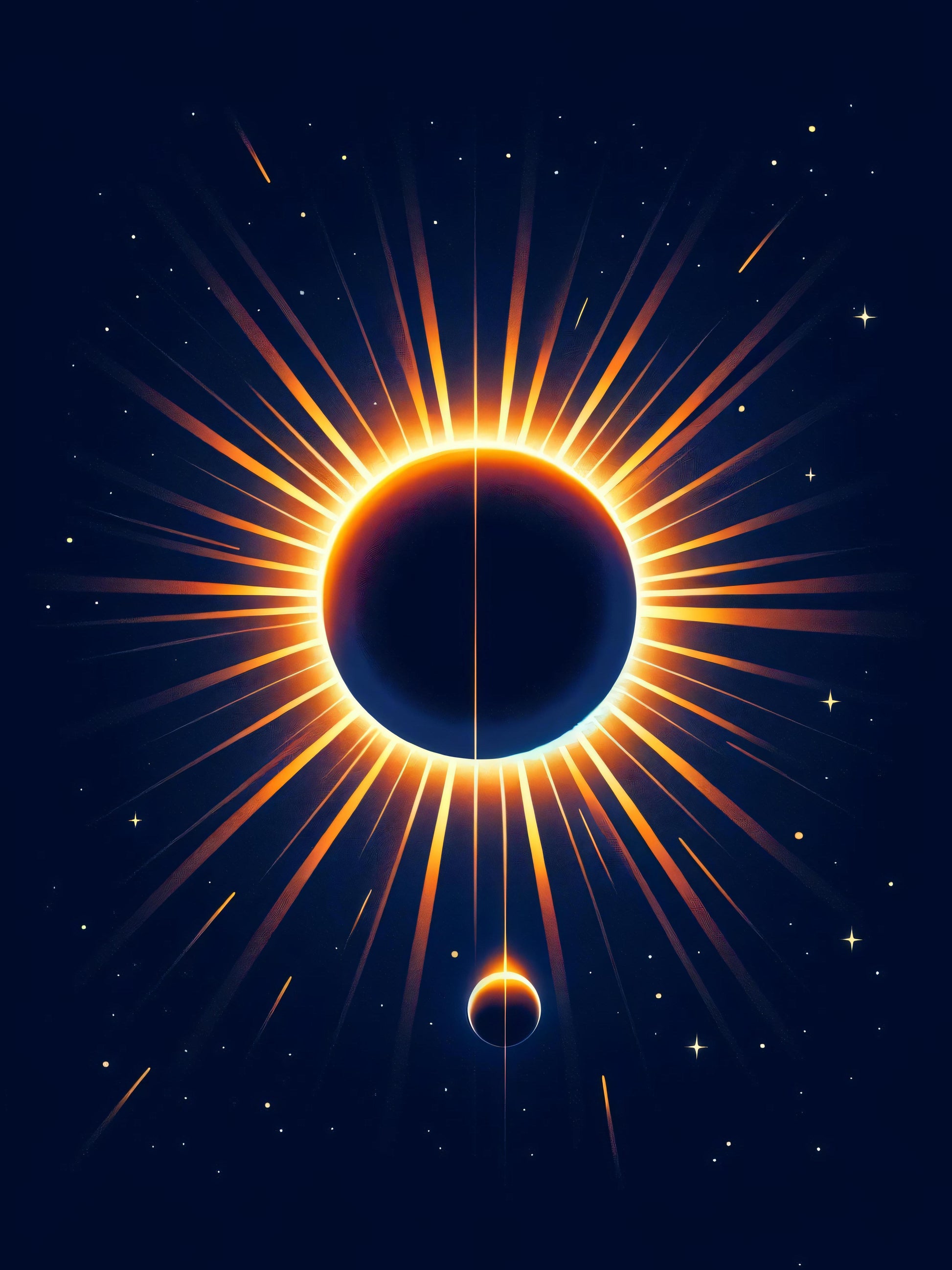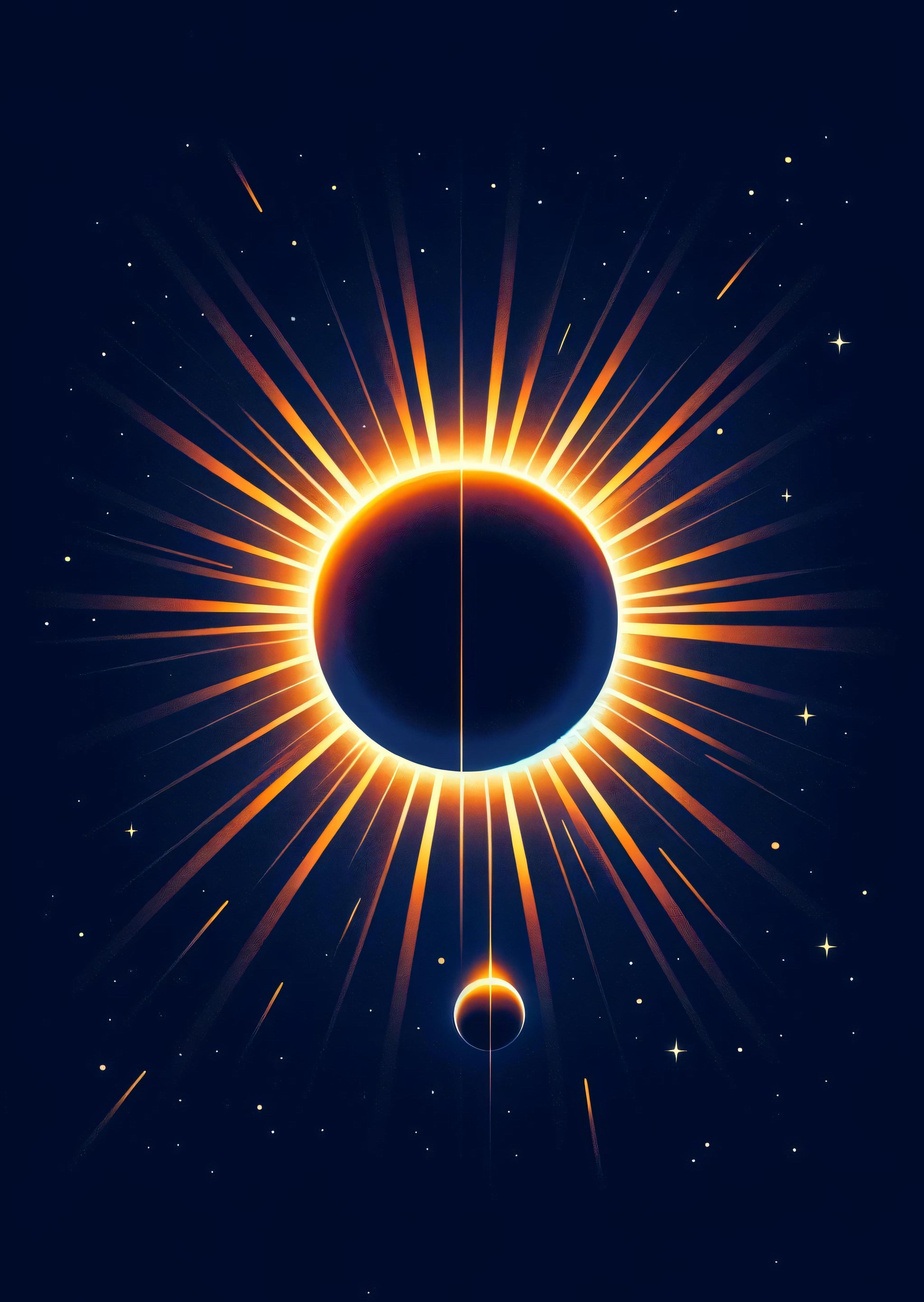 In a vast night sky, an eclipse unfolds, a dance of cosmic scale and beauty. Stars twinkle gently in the background, witnesses to this rare event. The sun's fiery circle peeks around the moon's dark silhouette, a powerful reminder that light persists even in shadows. This celestial story speaks of patience, for such spectacles are fleeting, yet their arrival is certain. It tells us about perspective; sometimes our small obstacles can block massive sources of energy and light, only if we let them. It's a tale of unity, how different entities can align perfectly, crafting a moment of awe for those watching from afar. This image, a snapshot of space's grandeur, encourages us to look beyond our daily struggles and find inspiration in the universe's boundless wonder.