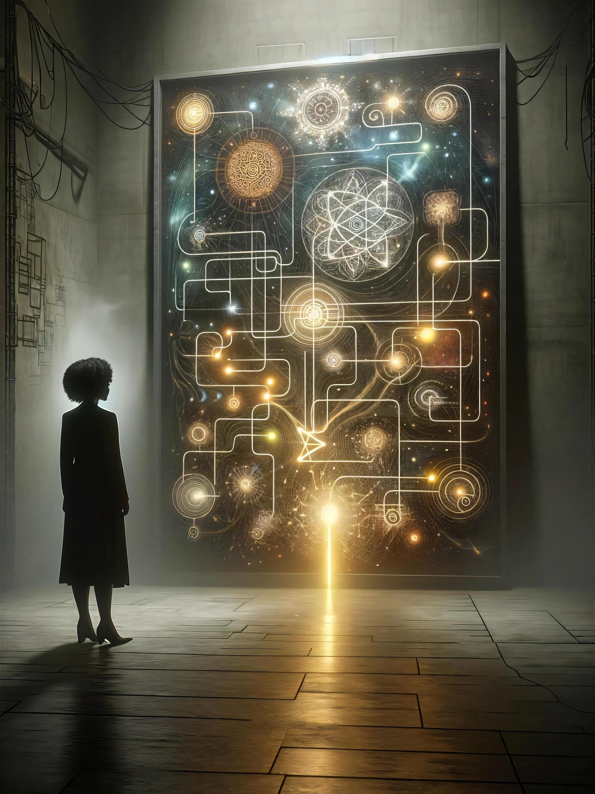 Explore the Depths of the Mind: Dive into the psyche's vast and intricate universe where thoughts, emotions, and memories intertwine. A lone observer stands at the threshold of subconscious exploration, gazing upon the glowing mural that symbolizes neural connections and mental constructs. This artistic representation invites contemplation of the cognitive processes that shape our perception of reality and the cosmic influence on human intellect. Unleash your curiosity and unravel the mysteries locked within.