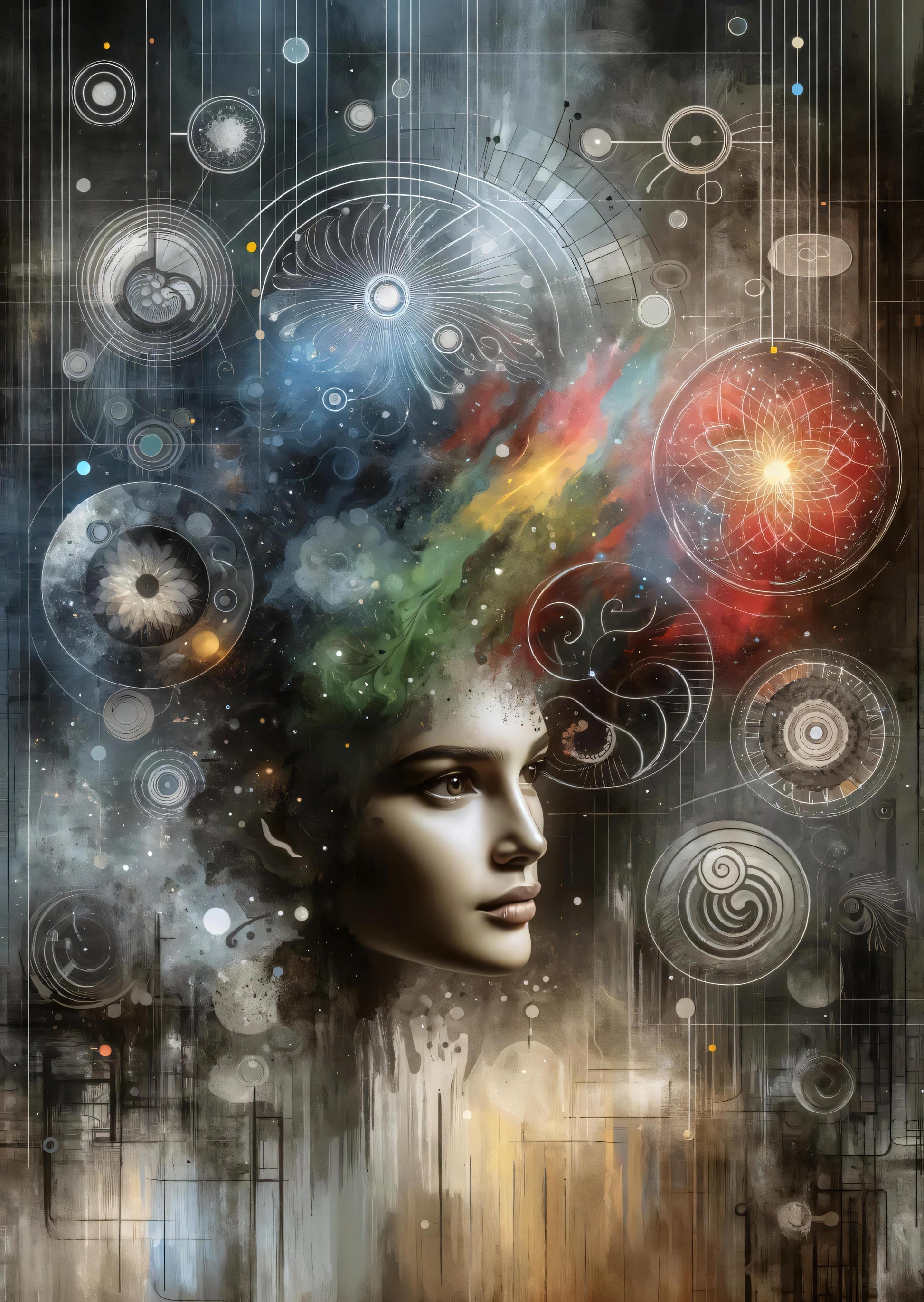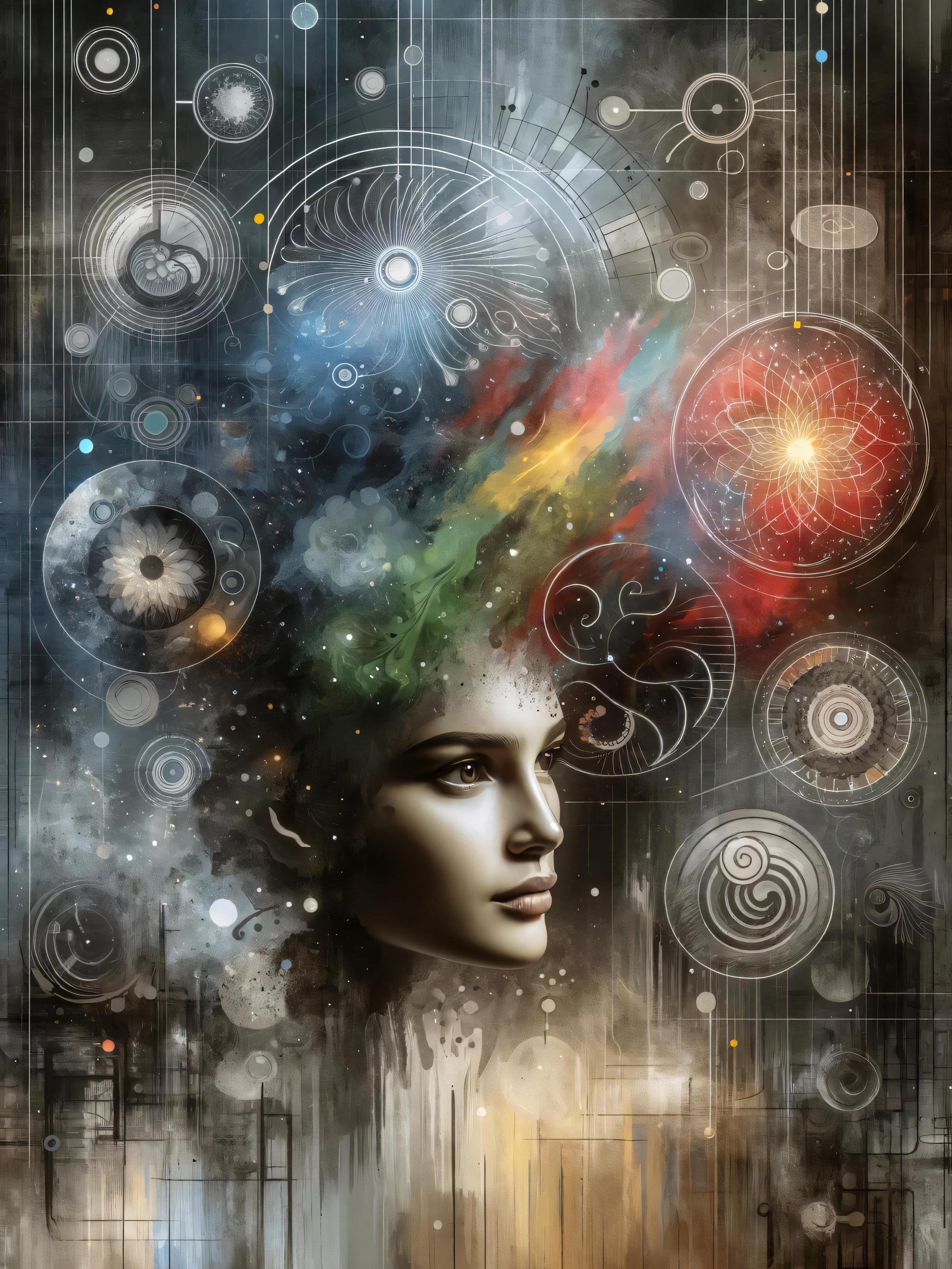 In this evocative poster, the subject, a visage of a human, becomes a canvas for the vibrant intersections of thought and emotion. Abstract elements intertwine, representing the complexity of the human psyche and the colorful bursts reflect cognitive fireworks. The geometric shapes and cosmic swirls symbolize the infinite potential of the mind, while the gradient from dark to vivid hues illustrates the flow from subconscious depths to conscious awareness. This image captivates with its visual representation of psychological theories such as the chaos and order in thoughts, emotional spectrum, and the fractal nature of human consciousness. Unravel the mind's enigma in an artful dance of colors and shapes.