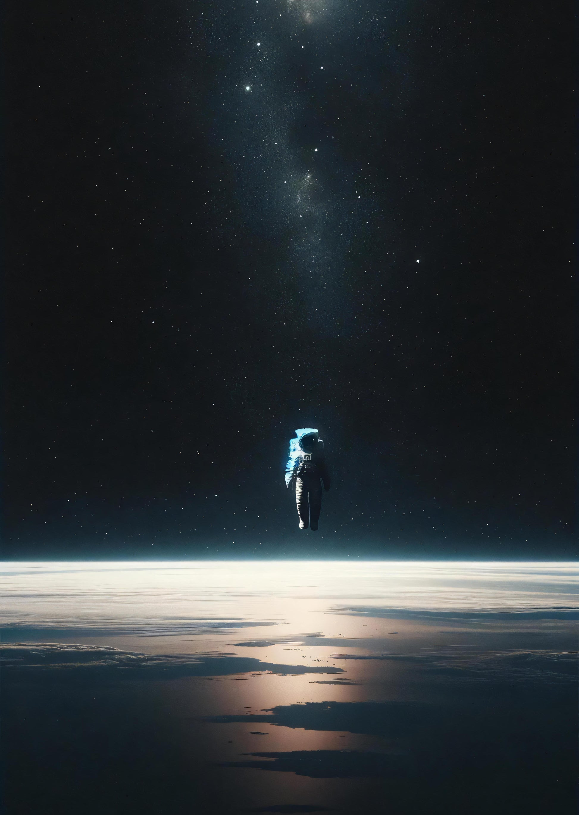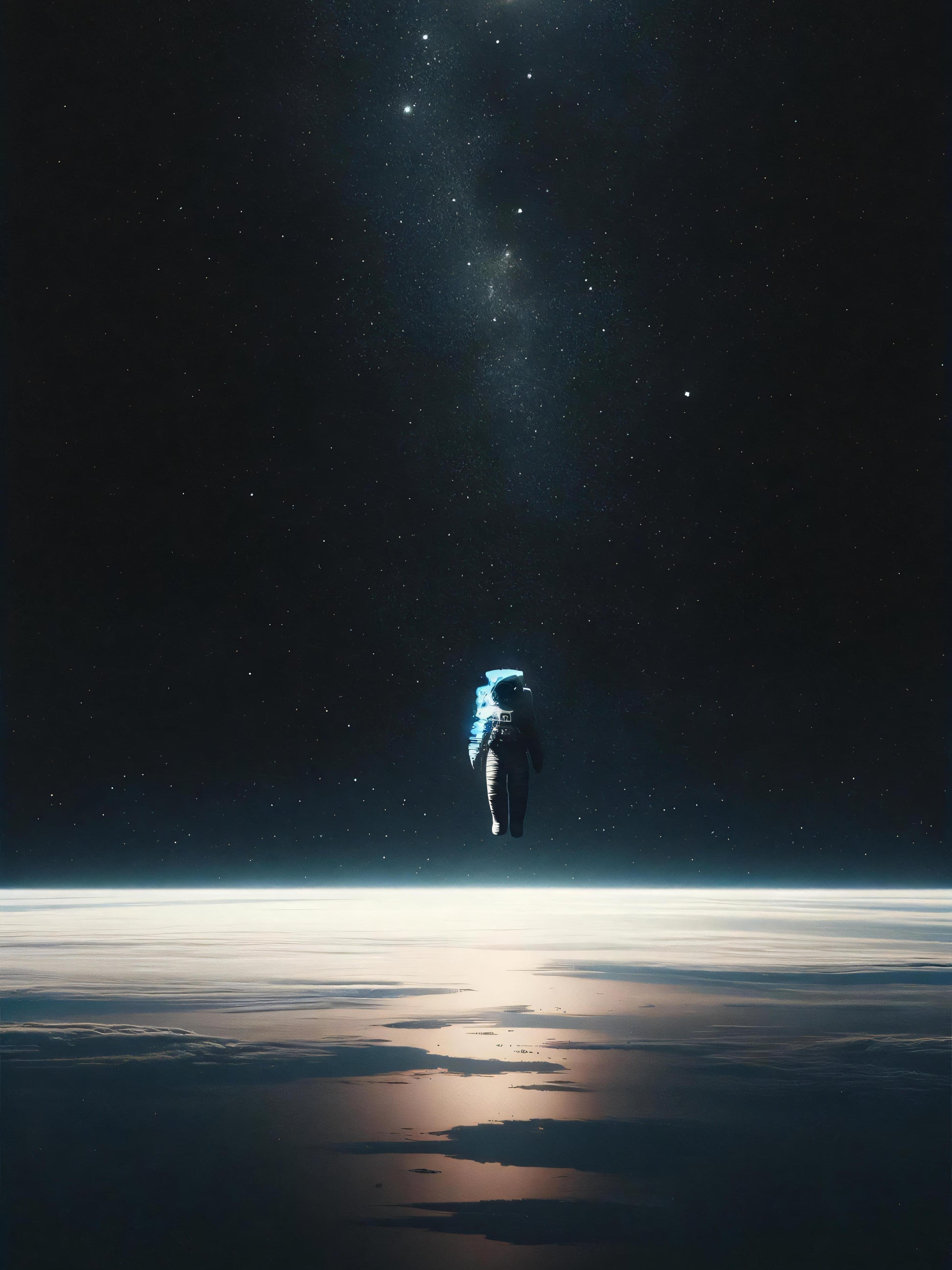 In the vast quiet of space, an astronaut floats above a glowing planet, alone yet connected to everything. The stars stretch out endlessly, a reminder that in the grand dance of the cosmos, each person is both small and infinite. Below, the reflected light on water links sky to land, thought to feeling. This image captures the profound stillness of the universe juxtaposed with the journey of one explorer, inviting contemplation of our place in this wide, mysterious expanse. It's a story of adventure, curiosity, and our timeless quest to understand our world and ourselves.