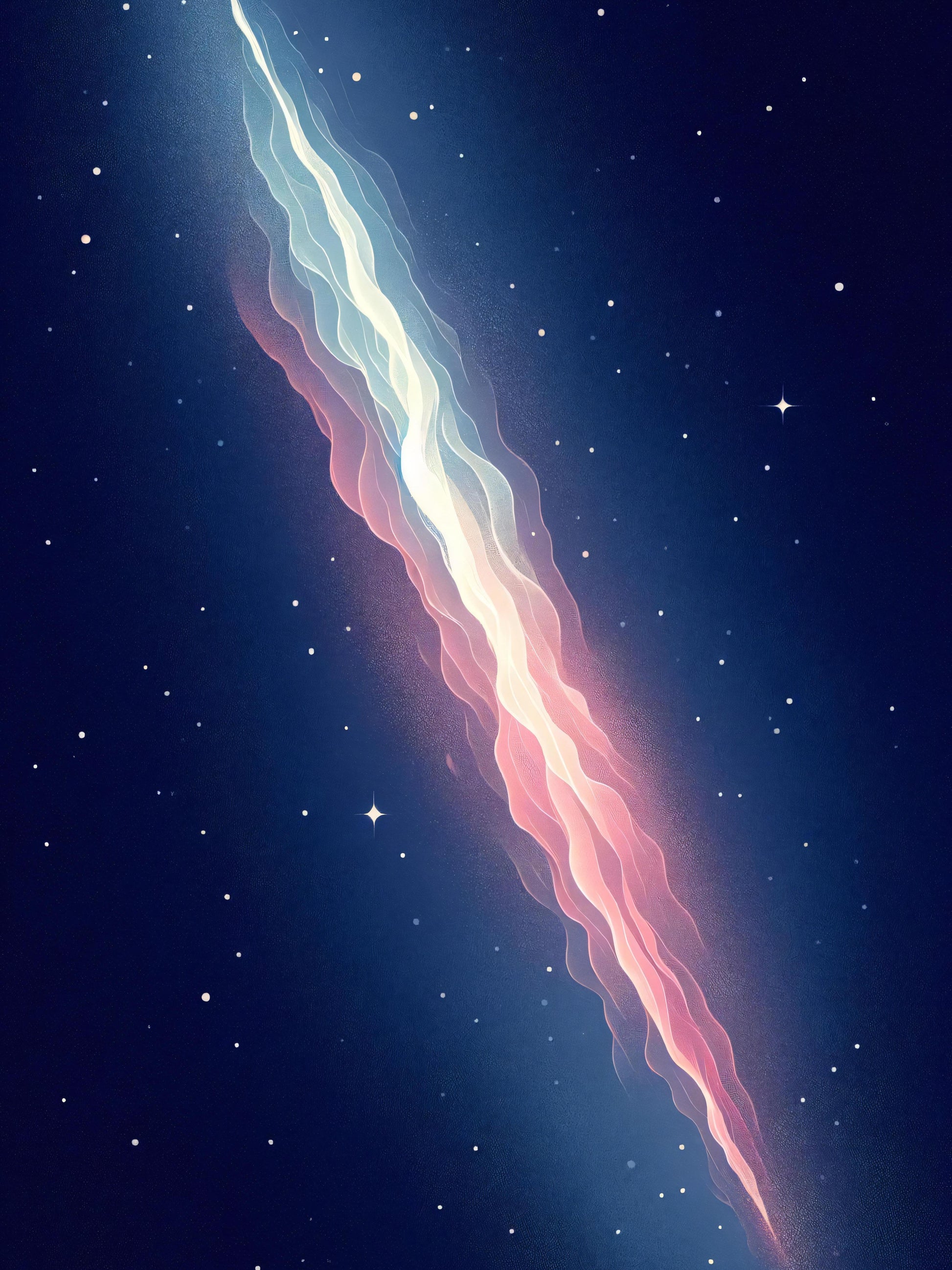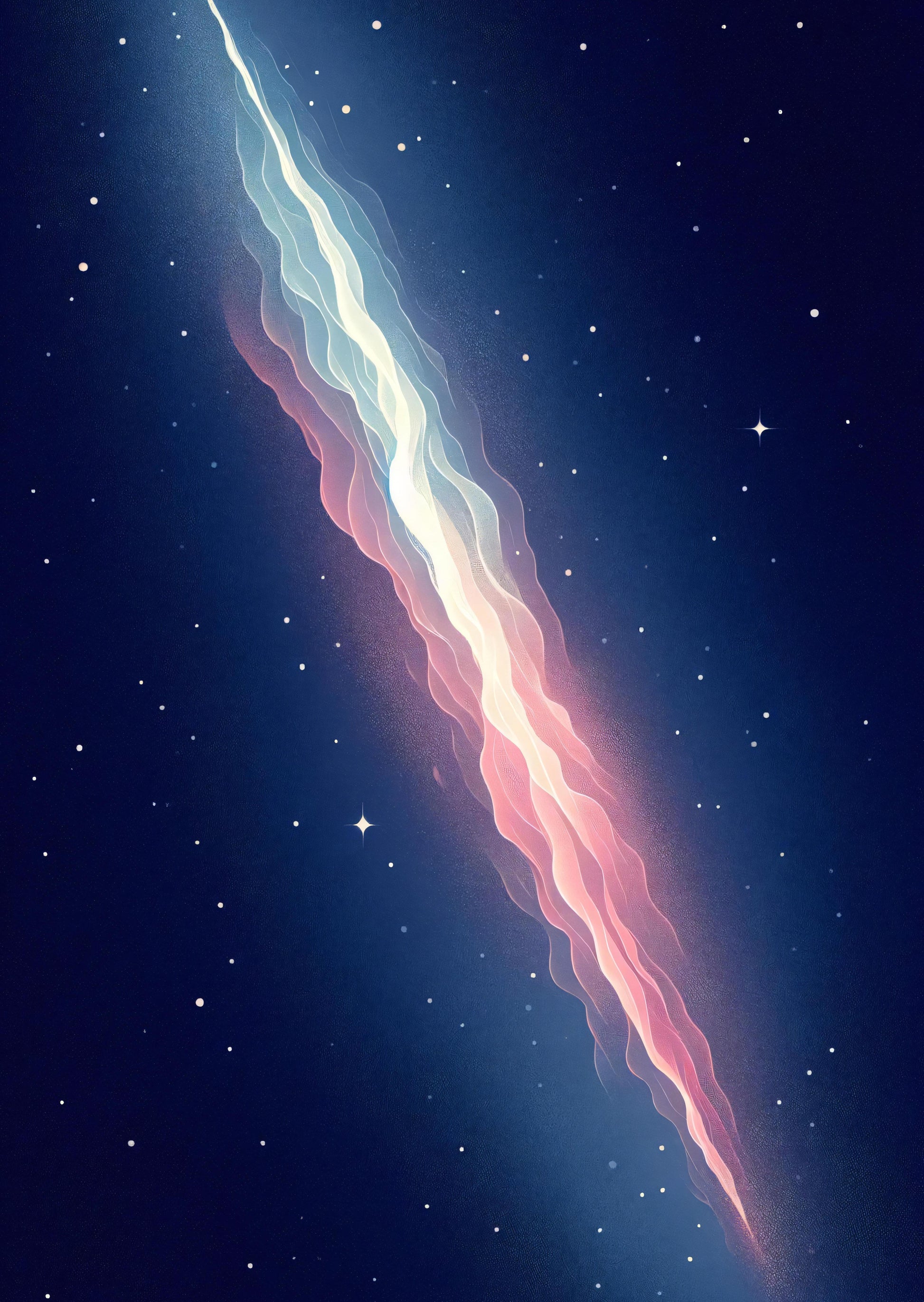 In a vast, dark sky, a comet blazes a path with a tail of luminous colors. This fleeting visitor from the cosmos reminds us that life’s moments, while brief, can be brilliant. Its journey, solitary and brief against the backdrop of the infinite, mirrors our own. We blaze through the fabric of time, leaving our mark in vivid memories and impactful deeds, no matter how small we seem among the stars. Its bright streak challenges us to make the most of our dash across the universe, to light our own way, and to appreciate the fleeting beauty of our existence.
