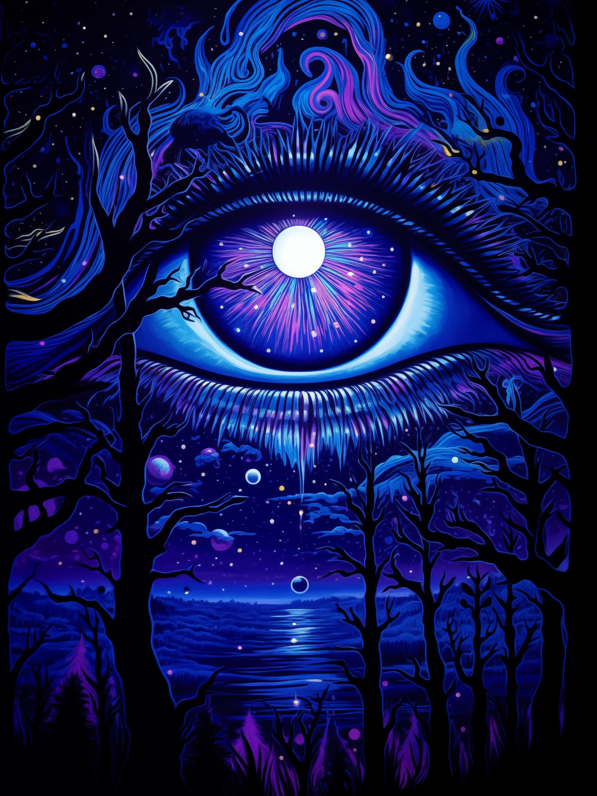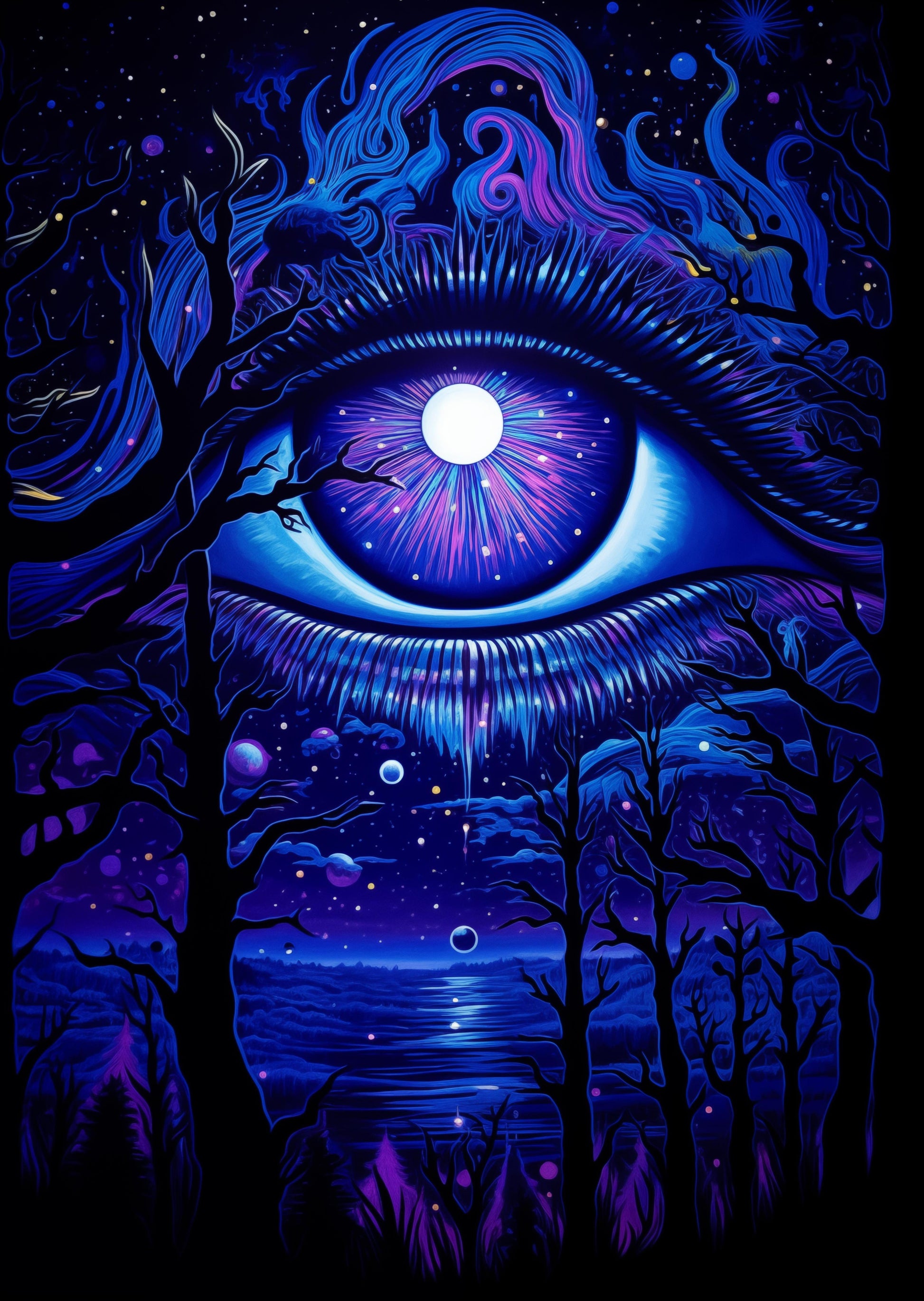In a realm where the night sky blooms with cosmic splendor, an all-seeing eye gazes across a surreal landscape. Shimmering rays burst forth from the pupil, illuminating the nocturnal tapestry. This celestial sentinel beholds an otherworldly forest, its trees silhouetted against a sky awash with celestial bodies. Below, a reflective body of water mirrors the wonders above, creating an uncanny illusion of depth and infinity. The vivid hues and intricate details of the image suggest a world imbued with mystery and the untold secrets of the universe, where nature and the cosmos are intertwined in a visual symphony of color and light.