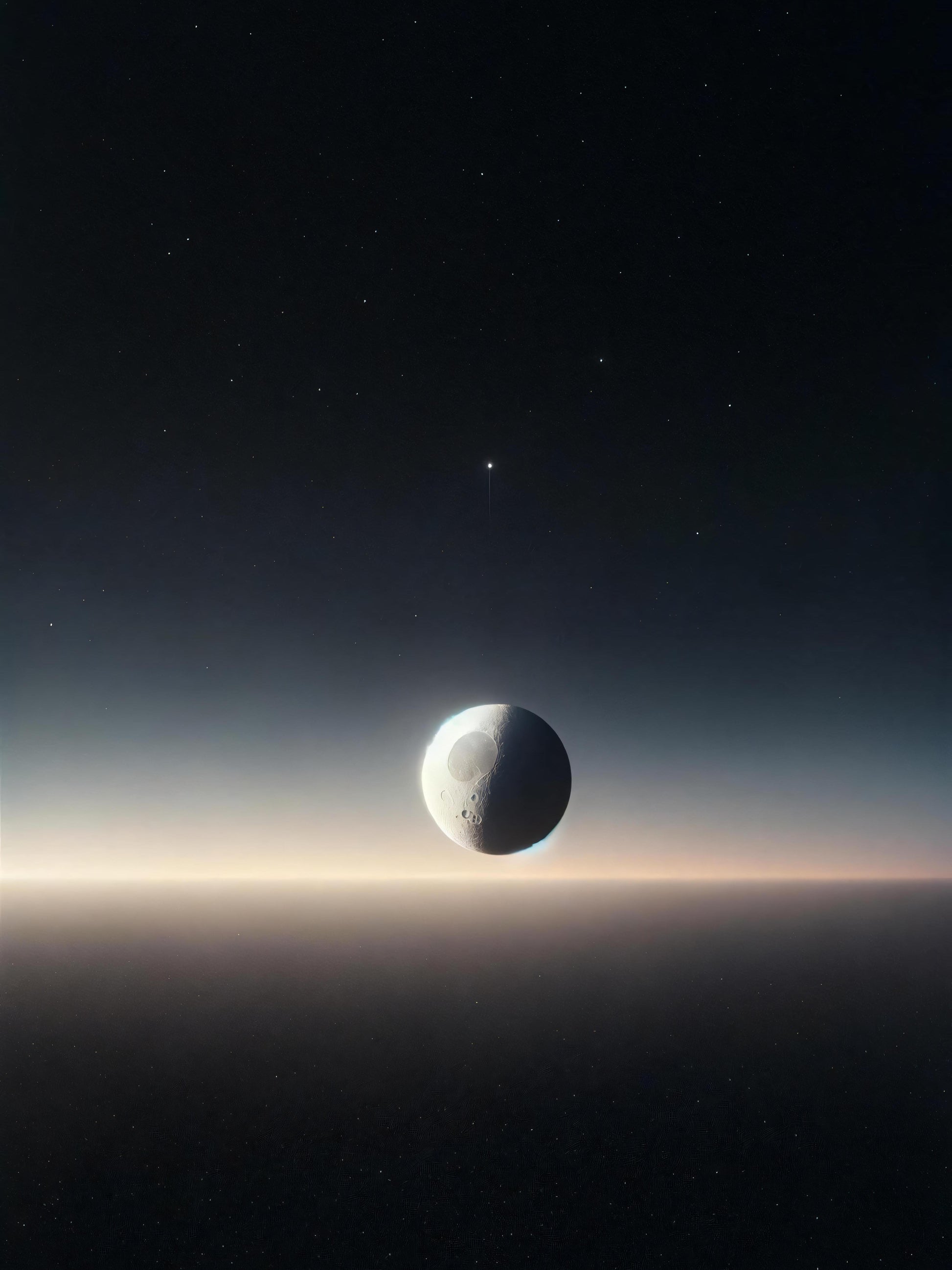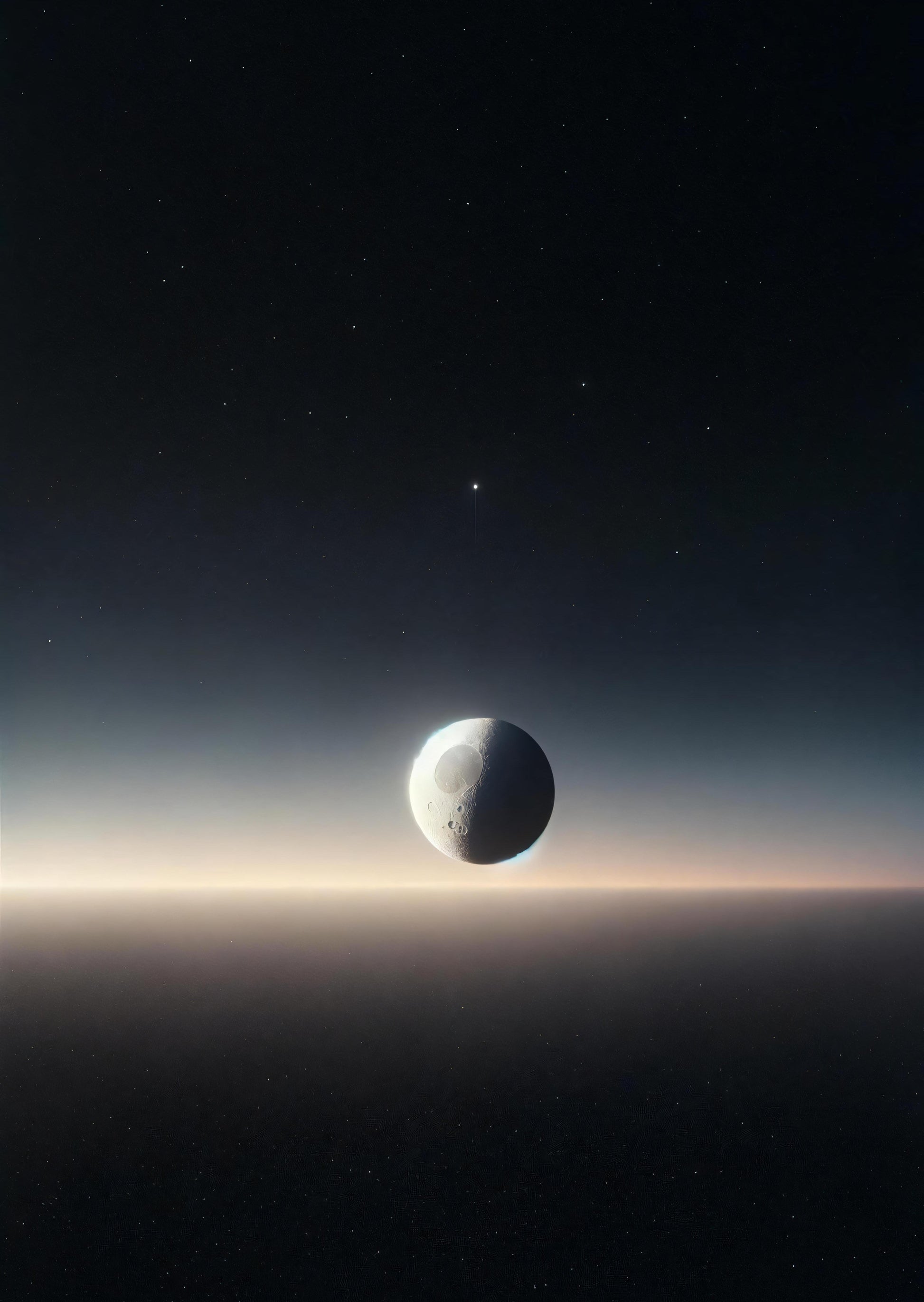 In the vast quiet of space, a lone planet floats, a beacon of light touching its curved edge. Stars speckle the darkness like distant fireflies, each a story, a world of its own. Here, above the hush of a planet's breath, we see how big and mysterious the universe really is. It teaches us that we, on our own big world, are part of something much bigger. It's a reminder to look up, to dream, and to remember that every tiny light in the night sky is a chance for new beginnings and endless possibilities.