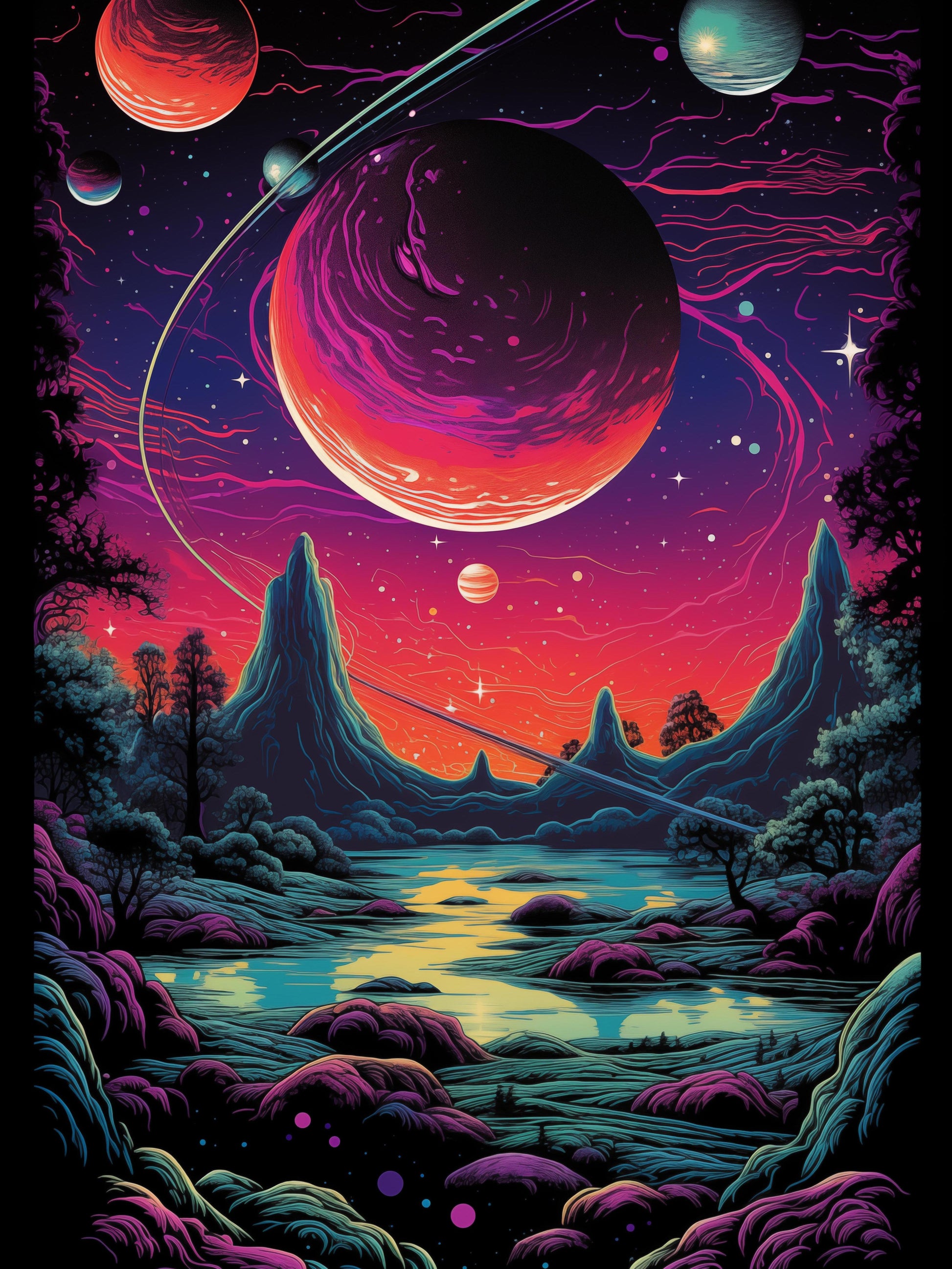 In a vibrant cosmos, multiple planets hang in the sky above a fantastical landscape. A vivid red and purple planet looms large, dominating the view, while smaller celestial bodies dot the space around it. Below, a calm lake reflects the cosmic dance, mirroring the brilliant colors of the sky. Jagged mountain peaks frame the scene, exuding a sense of adventure and mystery. The flora on the ground glows with otherworldly hues, suggesting an alien ambiance far from Earth. This dreamscape invites observers into a world where the usual laws of nature seem to bend and where the beauty of the universe unfolds in splendor.