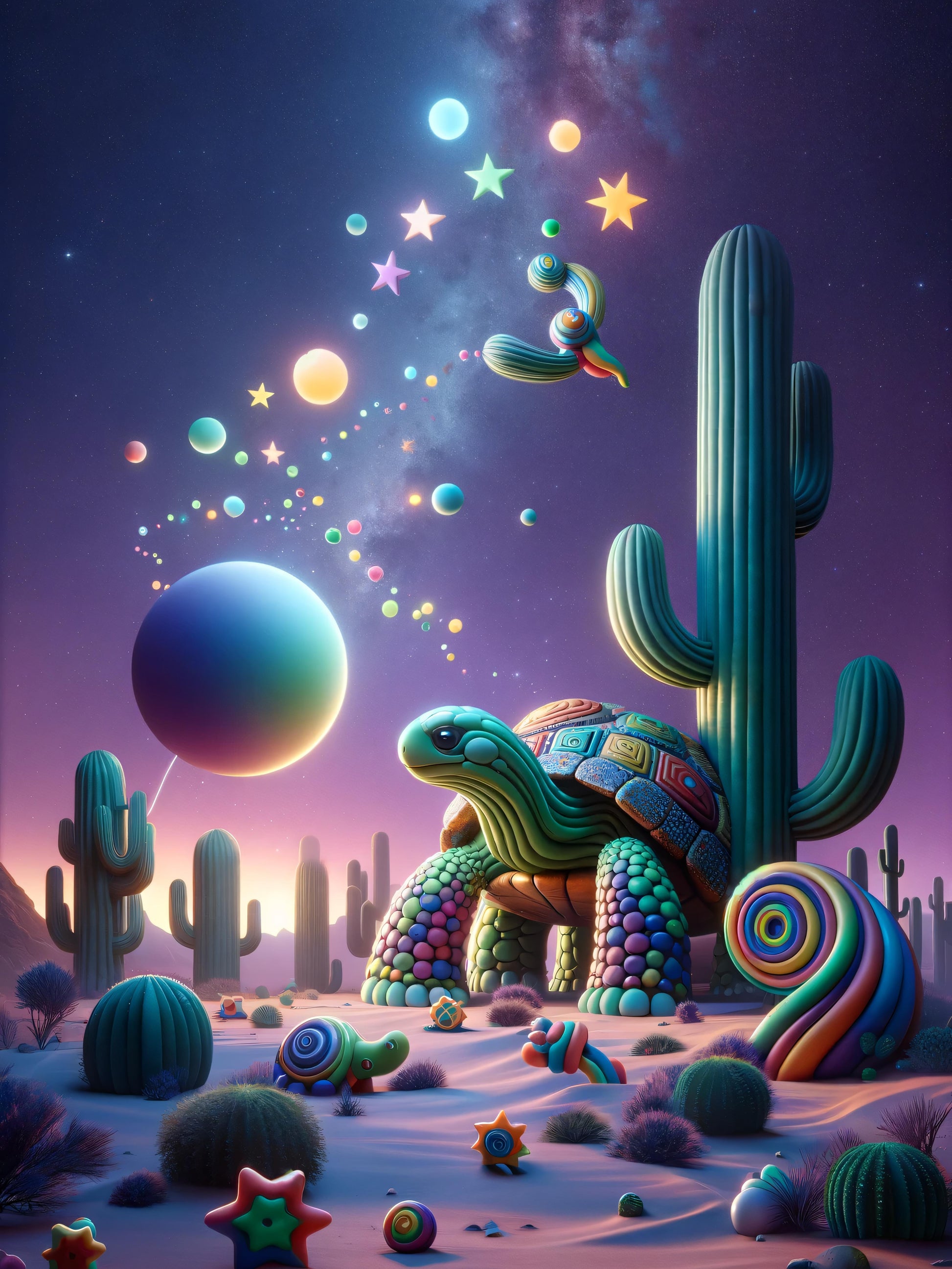 In a colorful desert, under a twilight sky, a wise tortoise carries a world rich with life on its shell, teaching us that slow and steady can still hold the universe. Bright orbs and stars spring from a cactus, painting the night with dreams. Each plant and rock, aglow with their own light, reminds us that every piece of the world, no matter how small, adds to its wonder. Bound by no rules, this place pulses with the beauty of imagination, telling us to look beyond what we see and cherish the magic within everything around us.