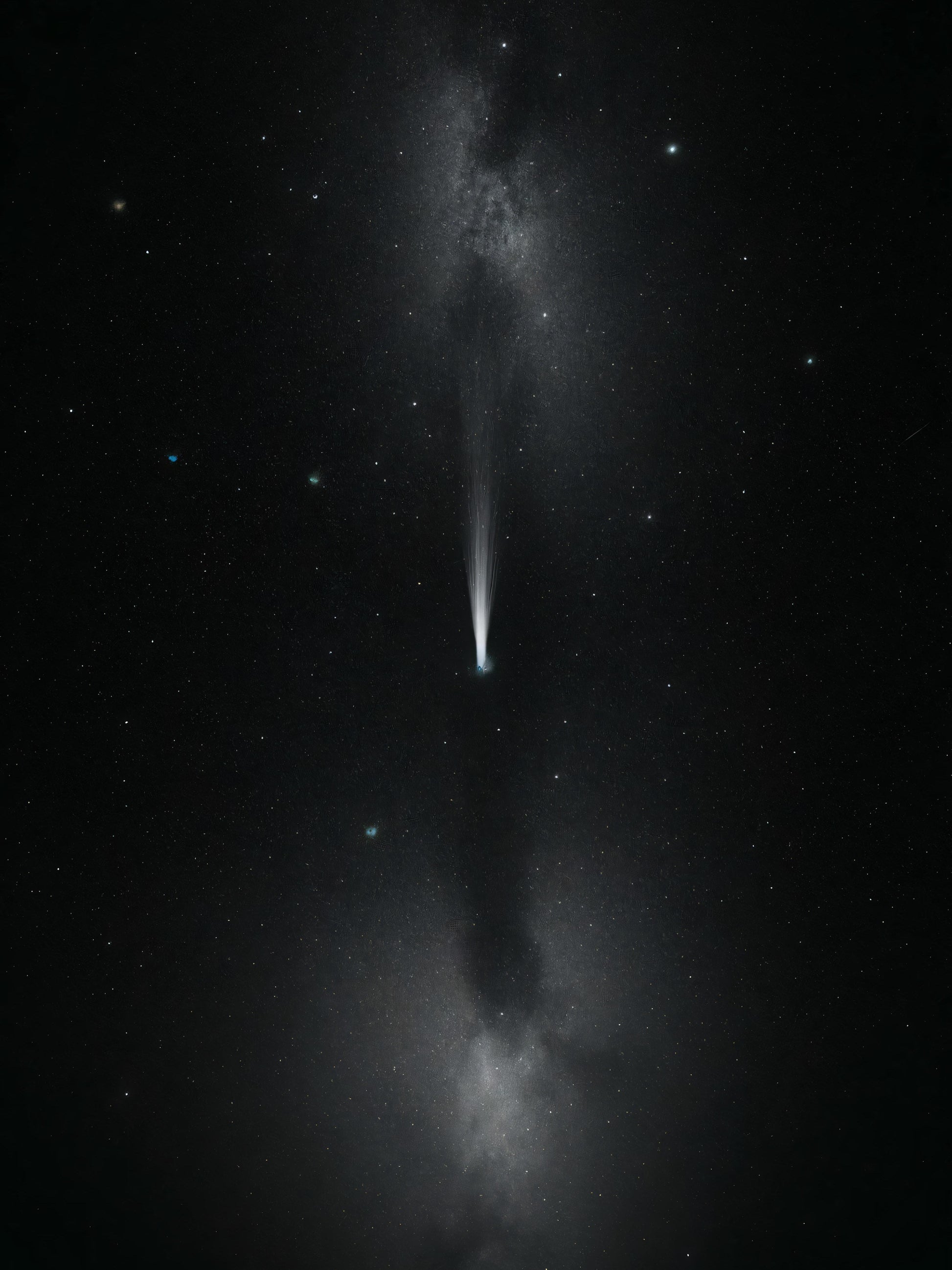 In a cosmic dance, stars are born and fade, while a comet blazes across the inky black, a fleeting visitor among ancient lights. This image captures a moment in the everlasting cycle of the cosmos, reminding us of the vastness of space and time. The comet, with its bright tail, is a symbol of life's brief sparkle amid the boundless universe. Around it, the stars and galaxies stand as sentinels of the infinite, their glow telling tales of distant worlds. Alone in the dark, yet a piece of a larger whole, the comet's journey across the sky is a metaphor for our own path through existence, small yet significant, part of a magnificent canvas.