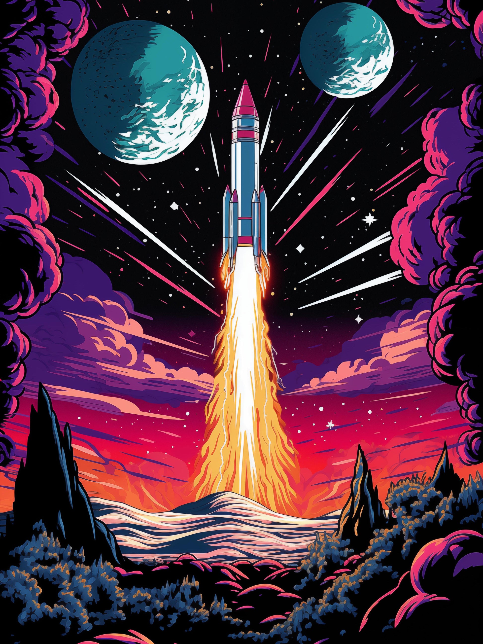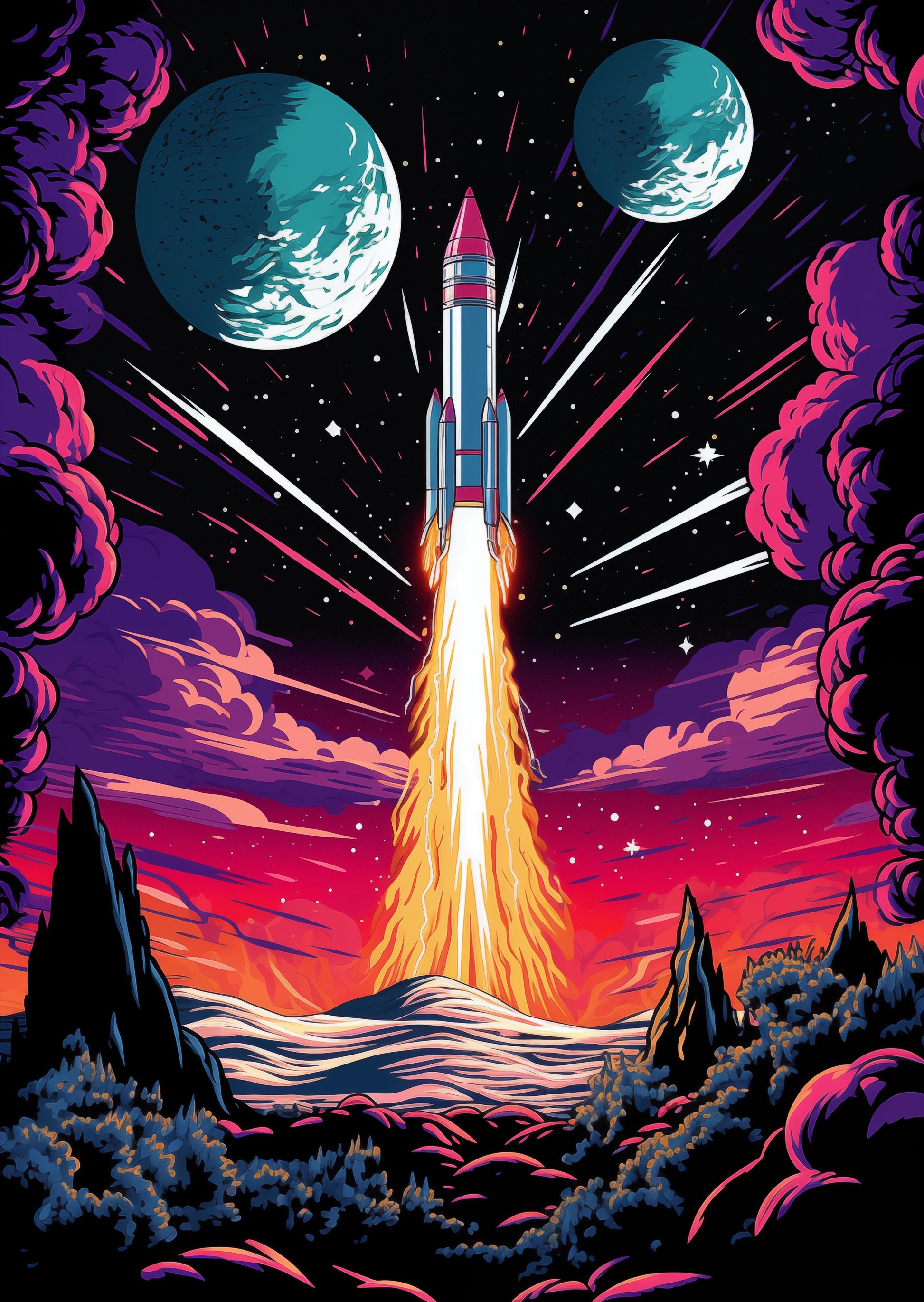 In a burst of fiery energy, a rocket blazes through the cosmos past violet clouds and a surreal landscape below. Two impressive planets hang against the tapestry of space, witnesses to this bold journey into the unknown. The vivid twilight hues cast a dramatic backdrop, embracing the spirit of adventure and the boundless possibilities that lie beyond our world. Stars twinkle and streaks of light punctuate the night, highlighting the rocket's powerful ascent towards the mysteries of the universe. This is a moment of awe-inspiring exploration, symbolizing humanity's unyielding drive to reach new frontiers and to understand our place among the stars.