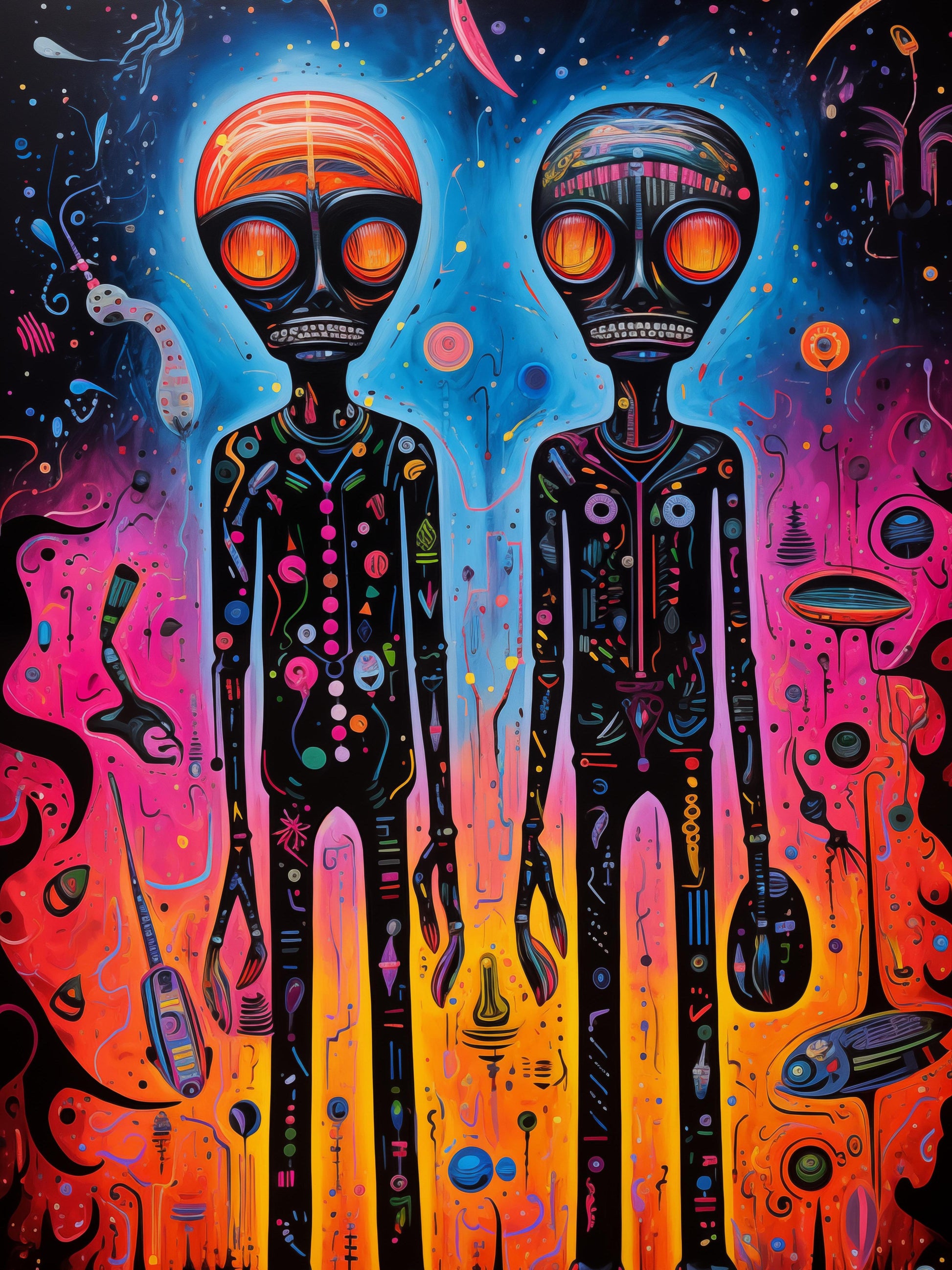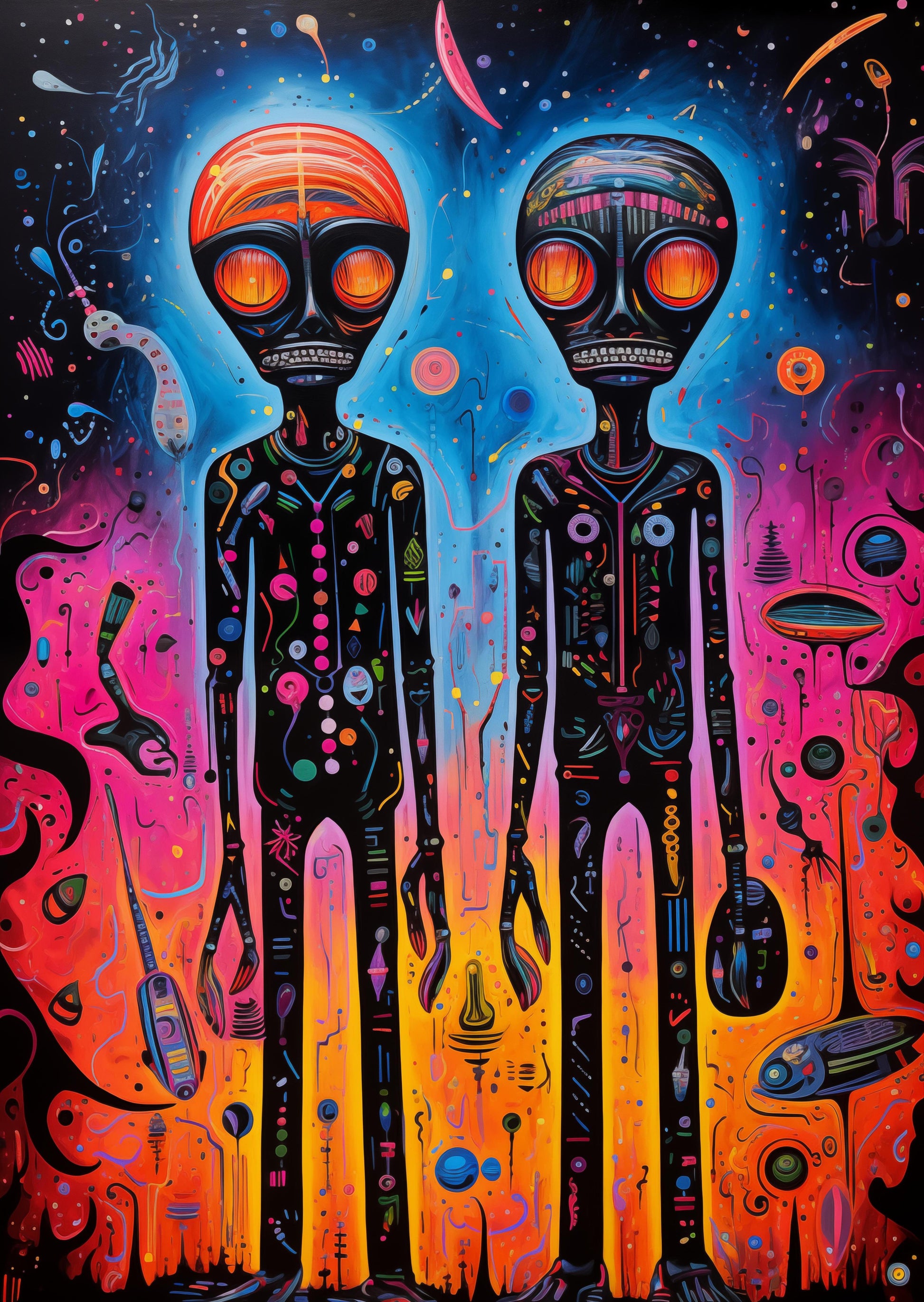 In a vivid cosmos painted with bold colors and energetic strokes, two otherworldly figures stand side by side, casting long shadows on an abstract landscape. Their large, dark eyes, almost window-like, seem to gaze into the soul, while their bodies are a canvas of cosmic symbols and shapes, suggesting a connection to a universe teeming with mysteries. Elevated by dripping flows of electric hues, the universe around them bursts with life, encapsulating the dance of celestial bodies and the relentless pulse of cosmic energy. These beings exude a sense of wisdom and adventure, as if inviting onlookers to join them in exploring the endless wonders and vibrant spectacles of the space they inhabit.