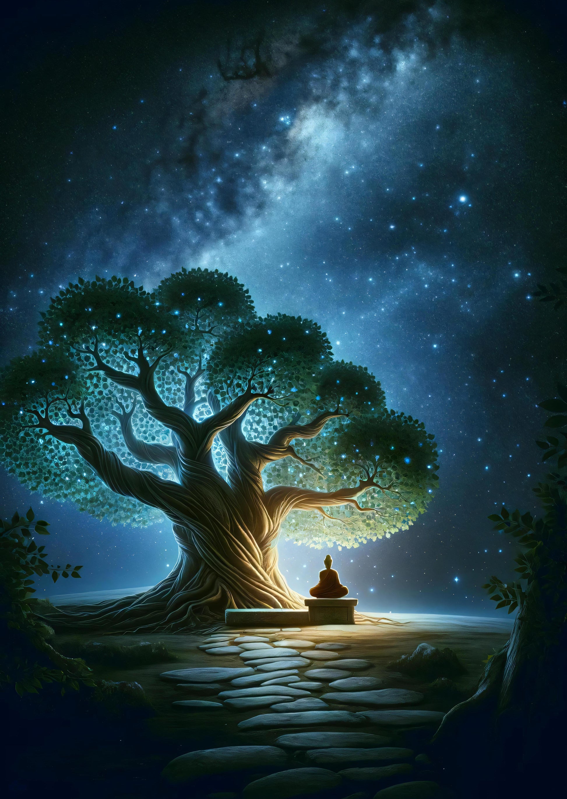 Under a vast night sky sprinkled with stars, an old tree stands tall. Its branches are like a network of roads in the sky. Beneath it, a person sits quietly, lost in thoughts. A gentle glow surrounds them, perhaps from a lantern unseen. The path leading to this quiet place is made of stones, inviting any wandering soul to come and rest. This picture speaks of the silent conversation between nature and one's inner self. It's about finding a moment to pause in a busy life, to look up at the infinite space above and find a sense of place within it. The sparkling heavens remind us of life's endless possibilities, and the tree, wise with time, encourages us to find strength in stillness.