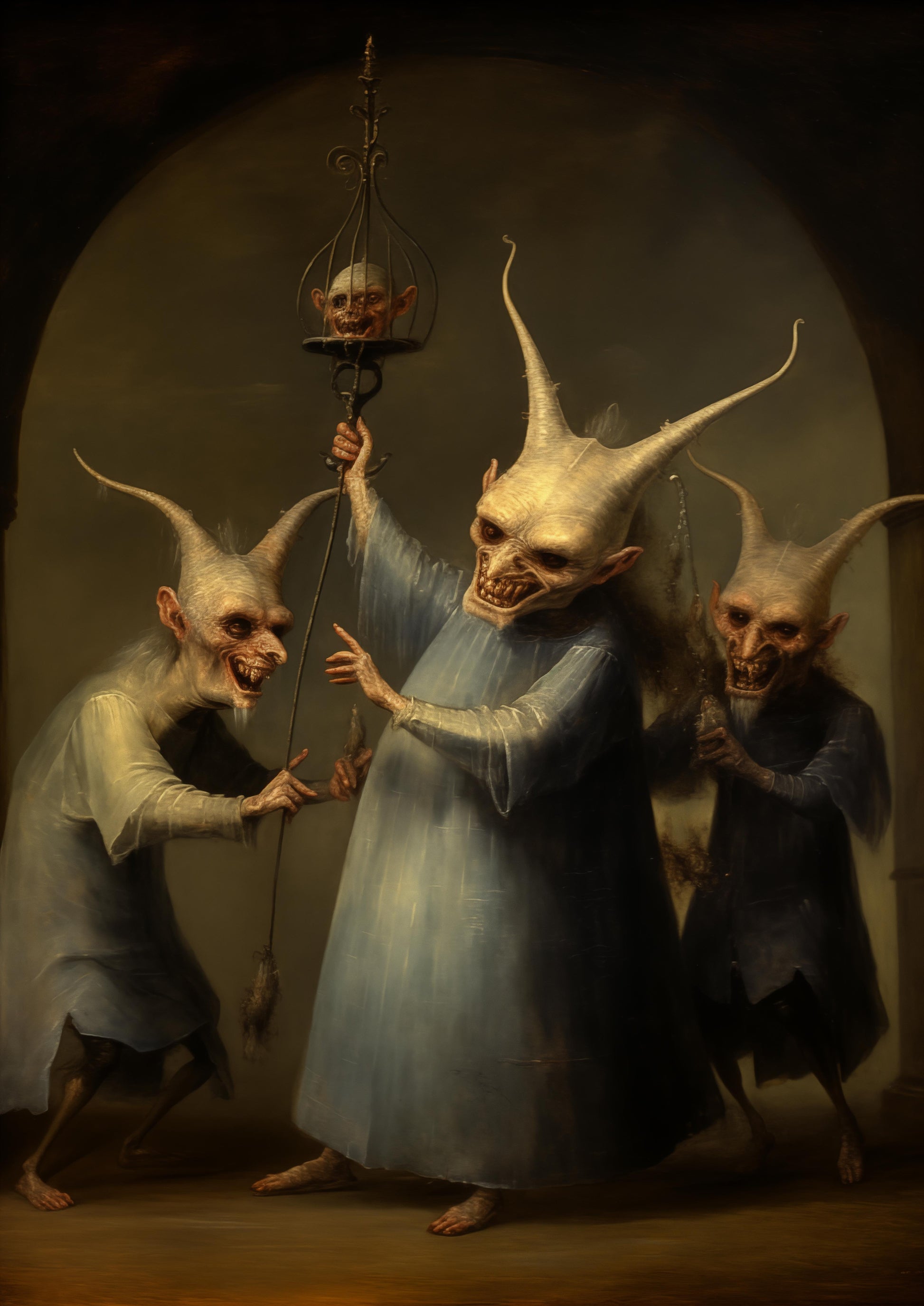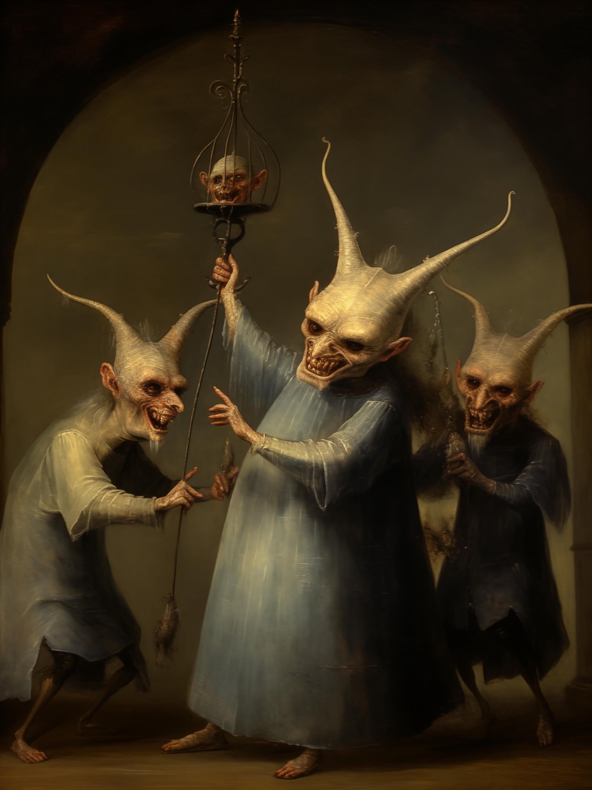 In a dim hallway, three curious beings hold a captive audience. The leader, a tall figure with sharp horns, brandishes a lantern, with a tiny creature trapped inside, mocking the idea of leading with light but offering none. The others laugh, taking joy in the absurd parody of guidance. This scene warns us that false leaders may stand tall and bold, but their intent is to mislead, trapping innocence and reveling in deception. True wisdom lies not in the hollow men of authority, but in discerning the authentic from the facade.