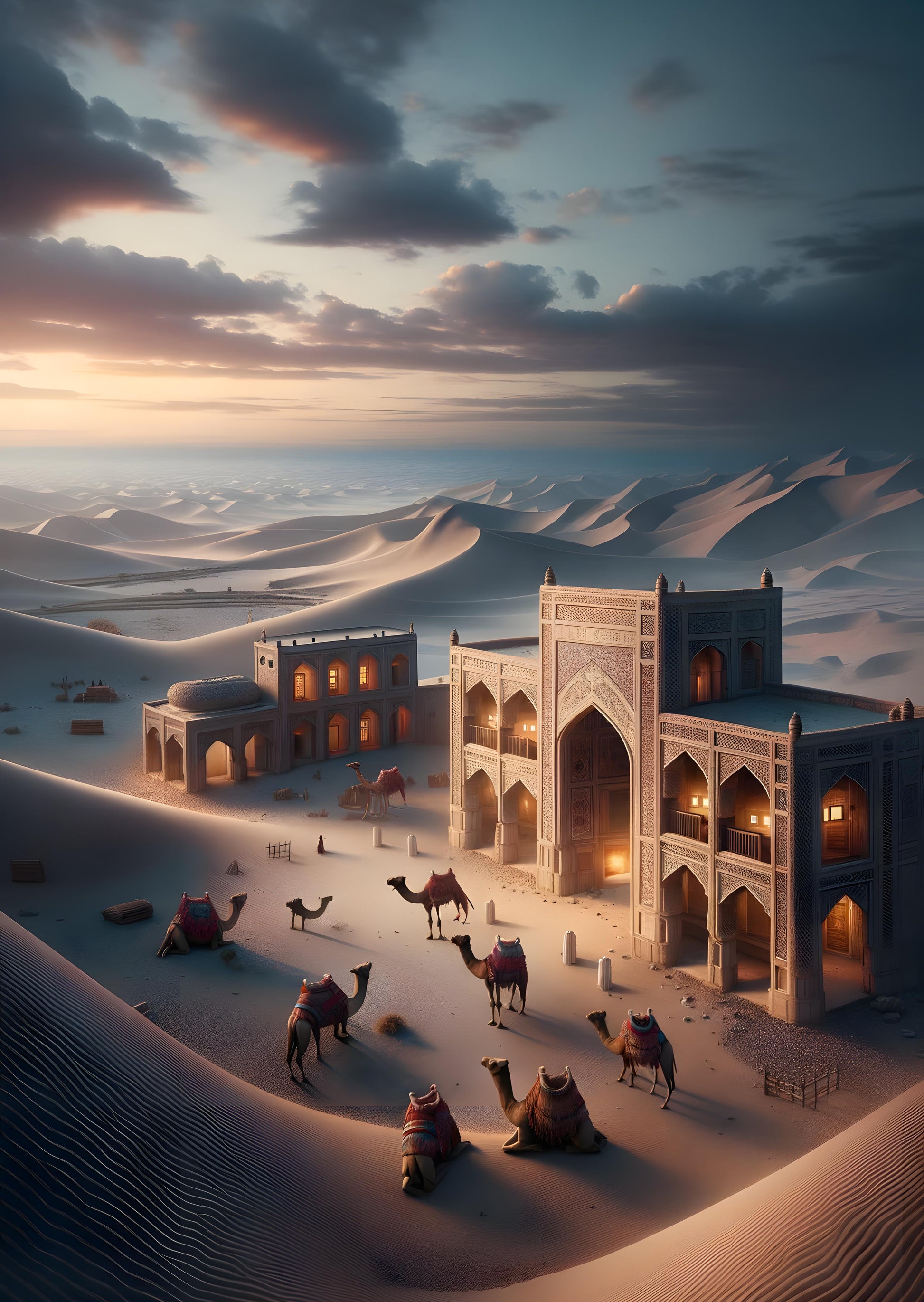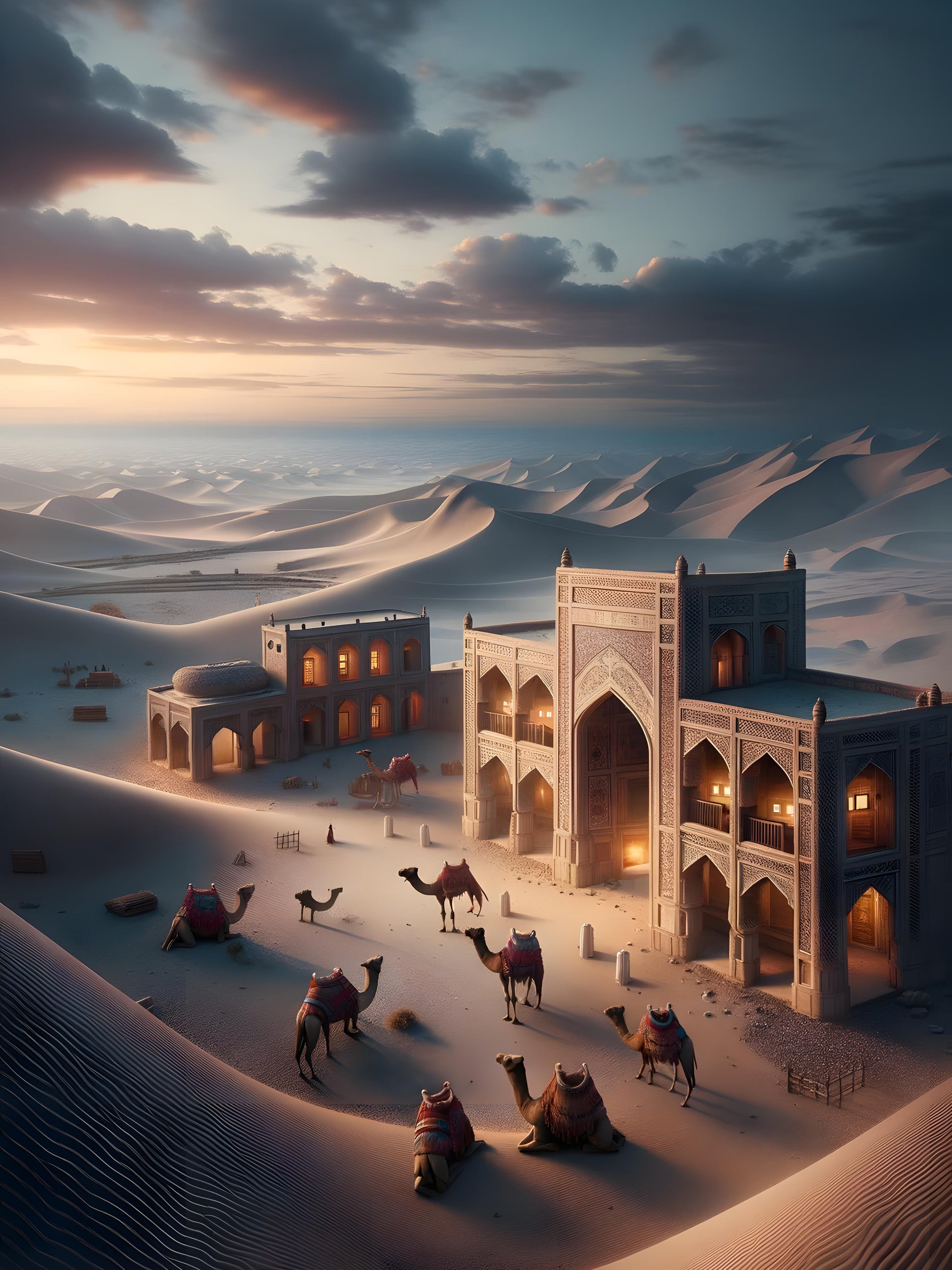 As the sun dips toward the horizon, its dying light casts a warm glow over an ancient desert city. Sand dunes, sculpted by relentless winds, cradle the timeless structures within their golden embrace. Camels, adorned with vibrant textiles, rest after a long day's journey, while the distant mountains stand as silent guardians. The ornate architecture of the buildings, with their intricate carvings and arched doorways, speak of a rich history and culture that has withstood the tough desert climes. This oasis of life, tucked away in the vast desert, is a testament to the ingenuity and resilience of its inhabitants. Here, at the edge of day and night, the bustling activity of the caravansary has come to a peaceful pause, setting the stage for the tales of a thousand and one nights that echo in the cool evening breeze.