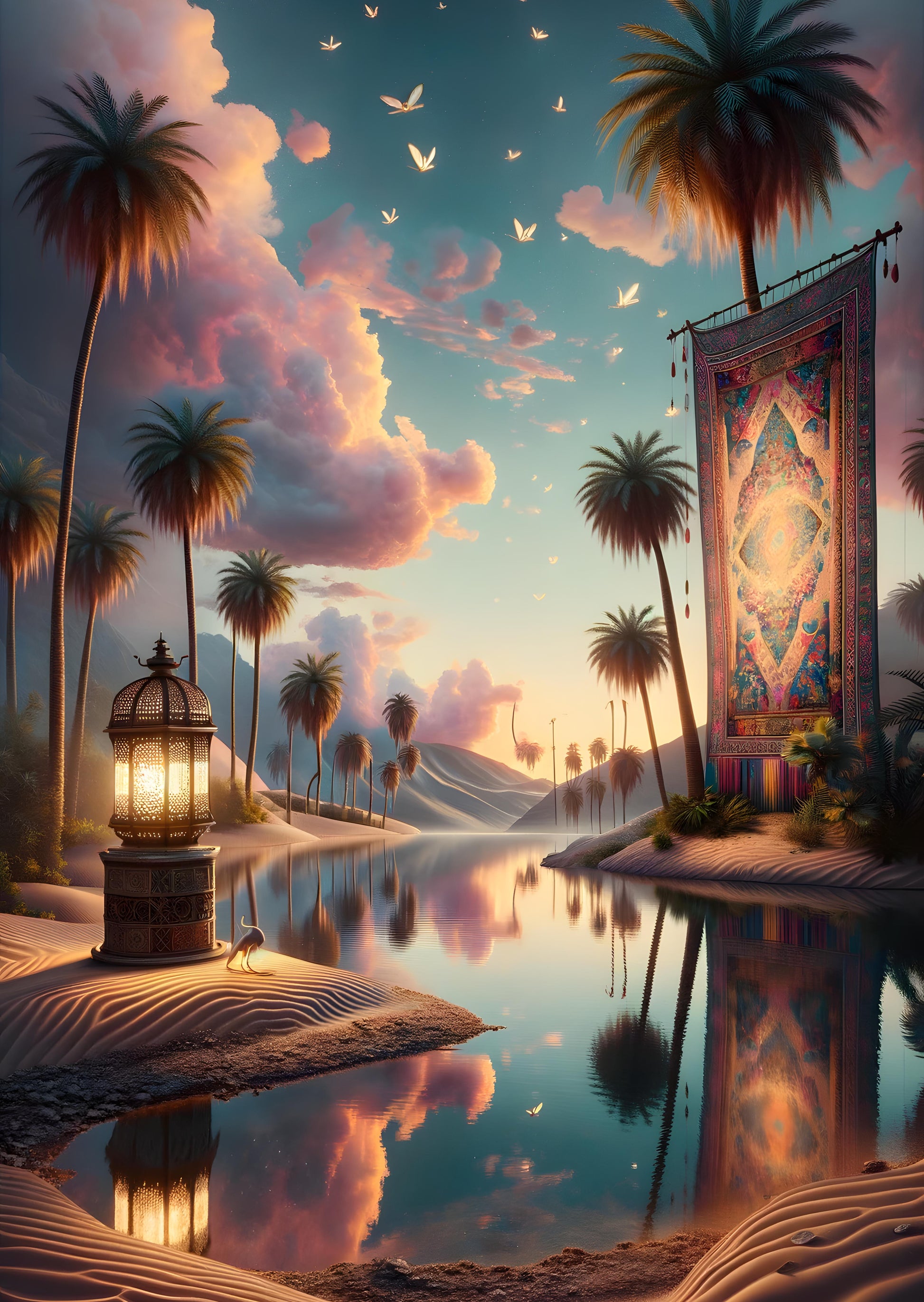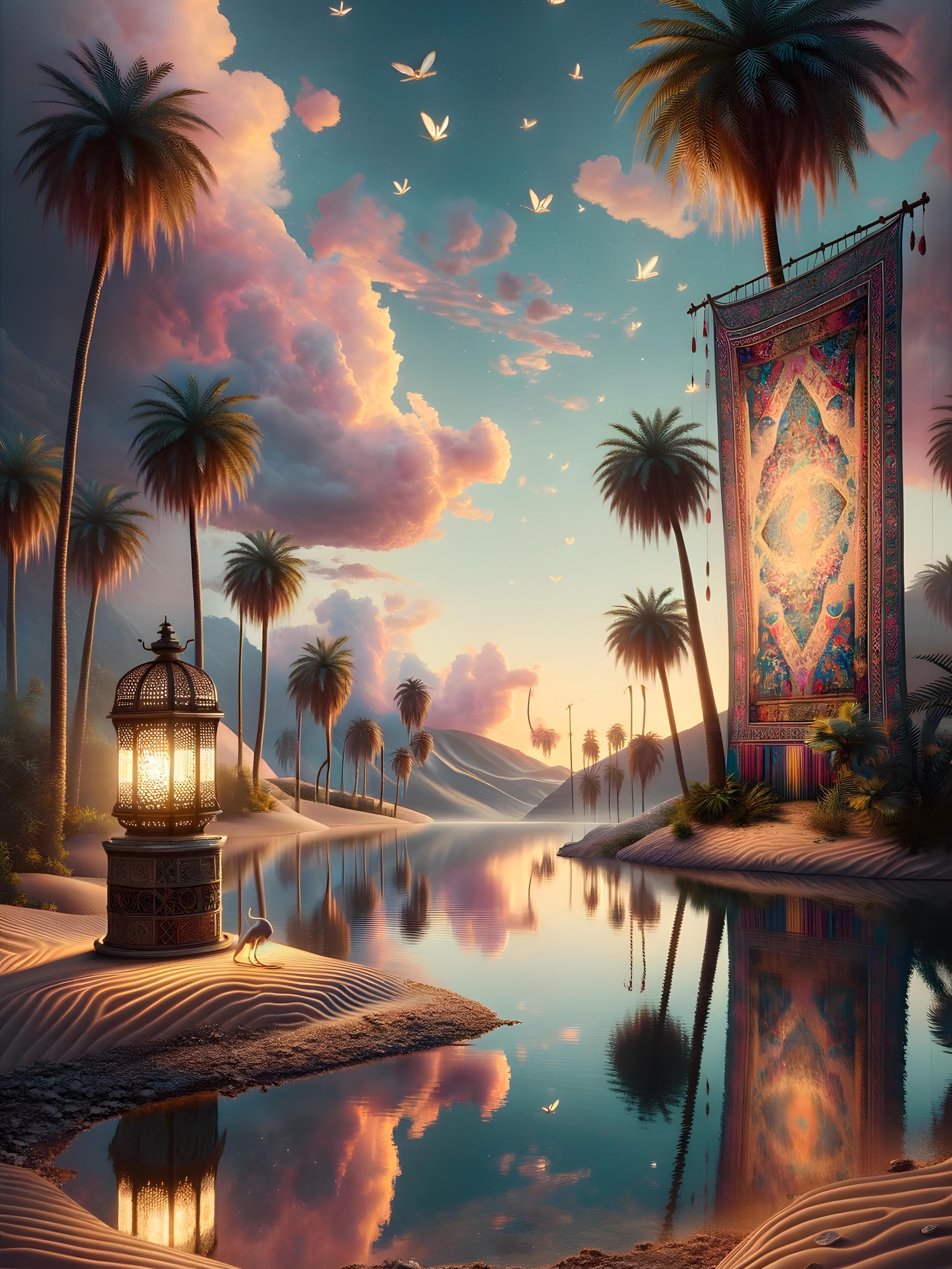 In a forgotten corner of the world, an oasis thrives, caressed by a gentle breeze. As the sun dips toward the horizon, the sky blooms with hues of peach and lavender, mirroring the vibrant tapestry that adorns the space between two palm trees. The still waters below reflect this dreamlike sky, and a traditional lantern casts a warm, inviting glow. Sands, sculpted by the whispers of time, lead to the water's edge, where a solitary cat ambles along the shore. Birds take wing in a synchronized dance overhead, celebrating the close of day in this secluded slice of paradise. Here, reality intertwines with fantasy, creating a momentary escape from the outside world.