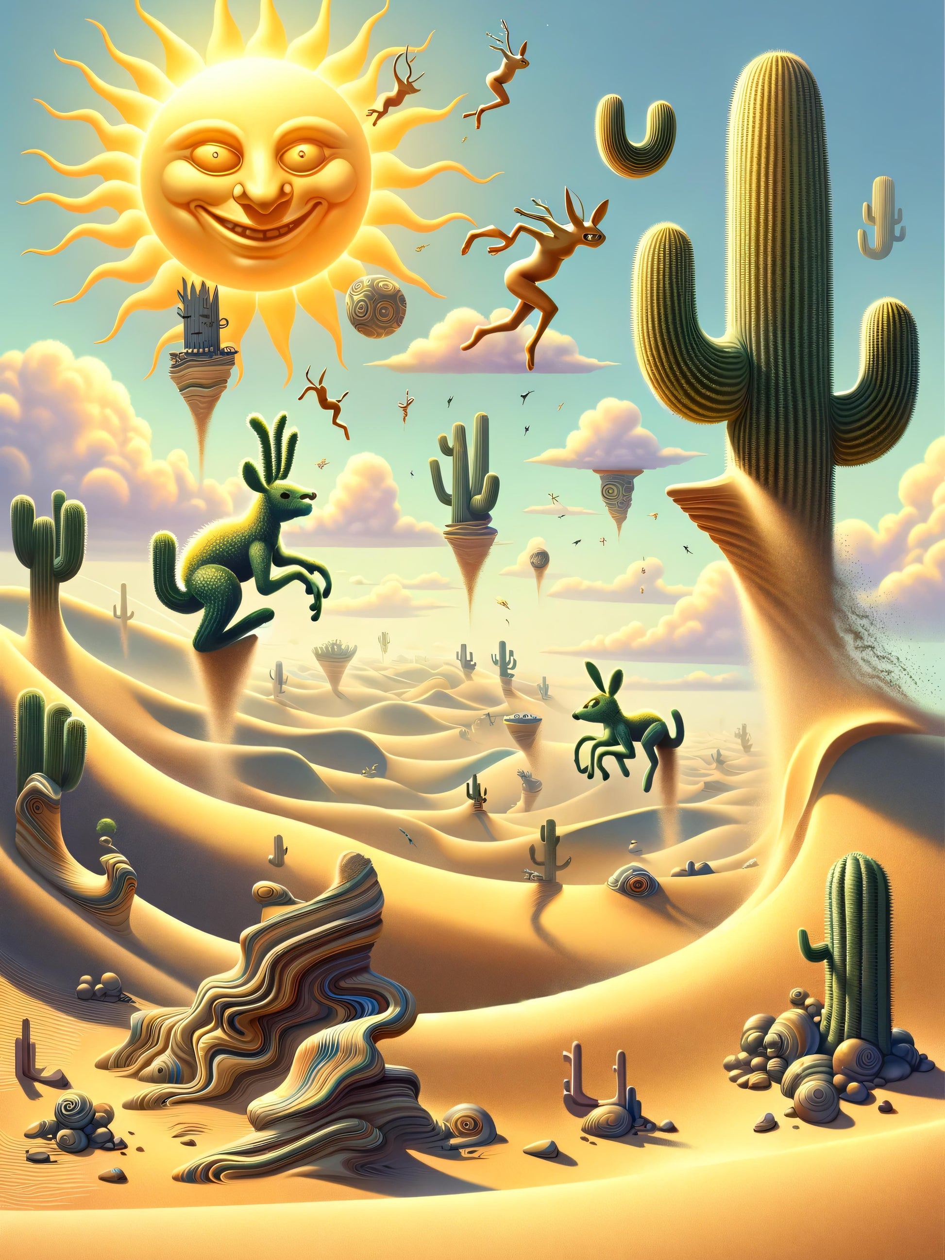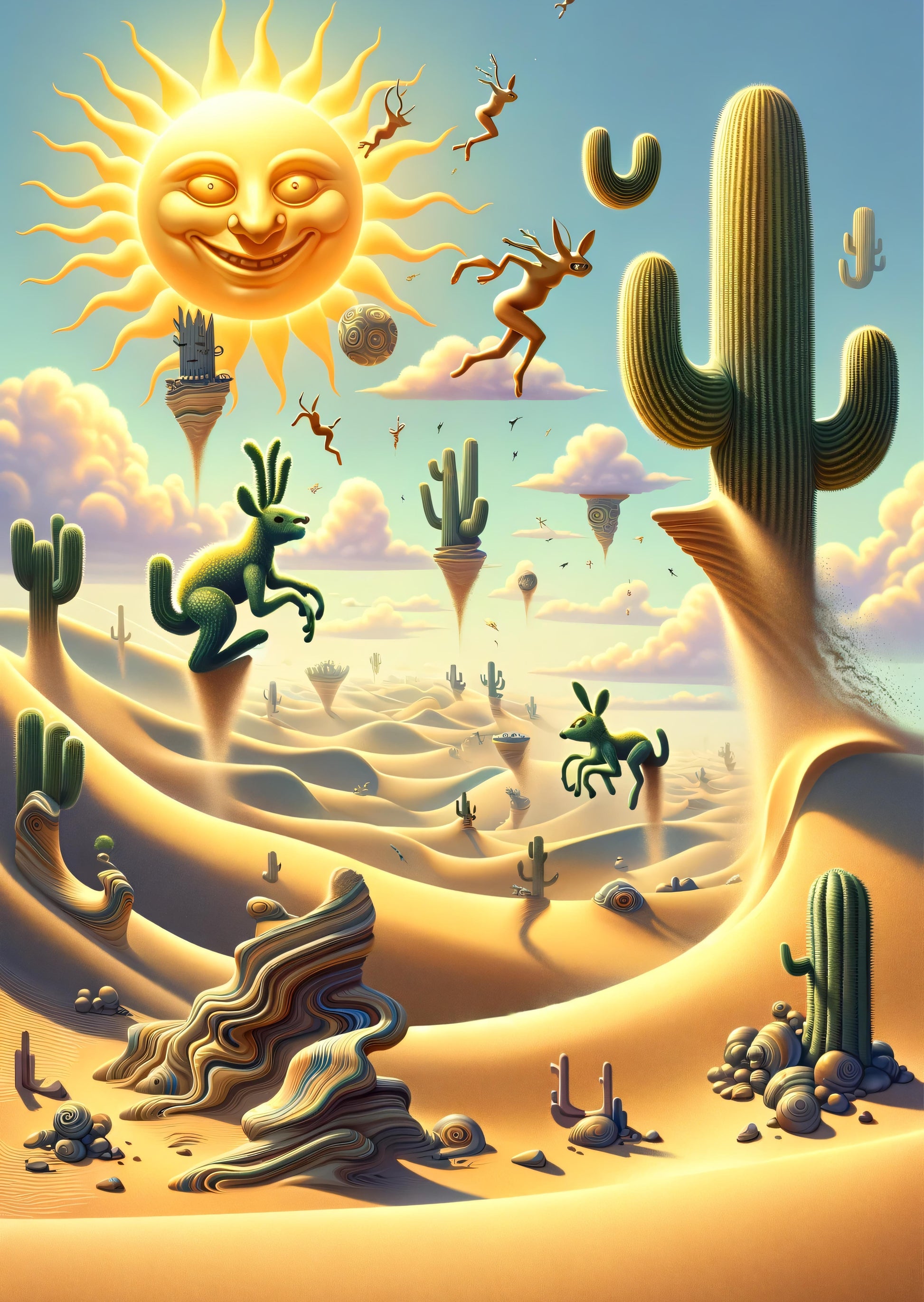 In a sunlit land where giant cacti reach for the sky and the sun beams with a human-like grin, magical creatures leap from one plant to another. The sky dances with strange artifacts, from flying contraptions to floating rocks with faces. Amidst the dance, snail shells spiral like lost dreams on the dusty ground. This place, a canvas of wonder, reminds us that nature and imagination blend, showing us life's limitless potential and the joy of the unexpected. Here, the ordinary is extraordinary, and even the ground flows like the waves of an amber ocean, telling us that reality is not always what it seems, and adventure awaits for those who look with curious eyes.