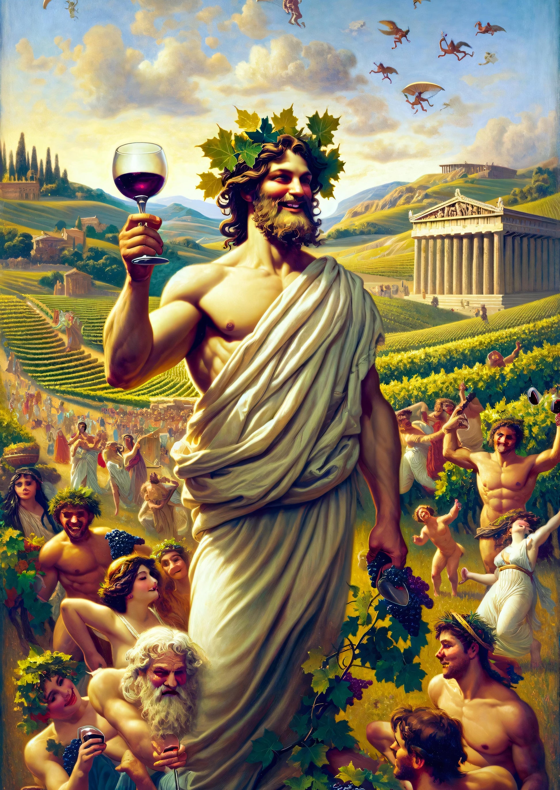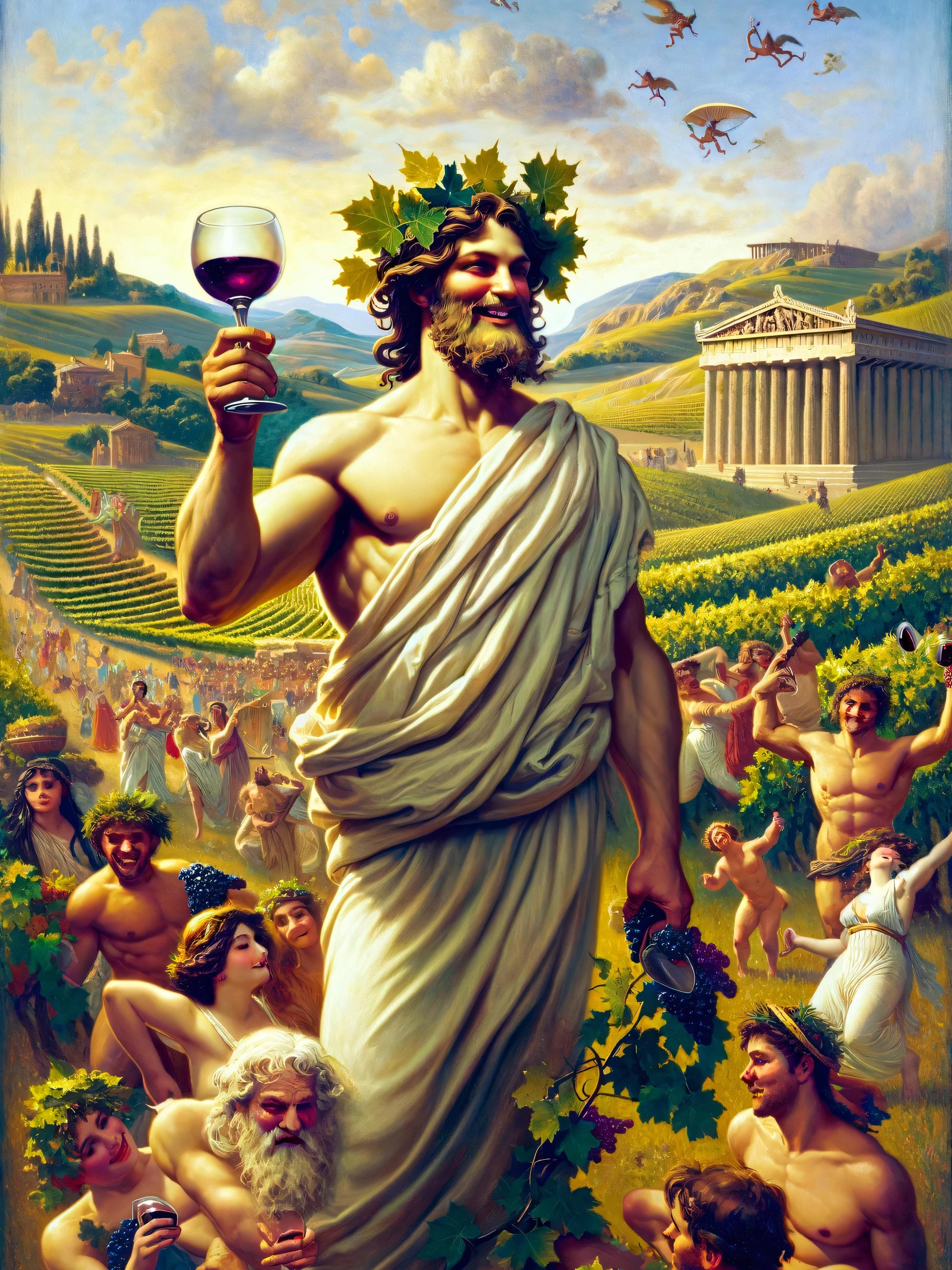 Behold Dionysus, the Greek god of wine, festivity, and ecstasy, standing tall with a goblet of wine in hand as he presides over a vibrant celebration. His crown of ivy, symbolic of everlasting life, adorns a head tilted in mirth towards the heavens. The rich landscape stretches out behind him, blessed with verdant vineyards and a classical temple, a testament to the cultural heritage that worships the vine and the divine pleasures it yields. Below, his followers revel in a state of joyous abandon, embodying the spirit of freedom and hedonism that this deity champions. This tableau captures the essence of Dionysus, inviting all to partake in the beauty and wild exuberance that life has to offer.