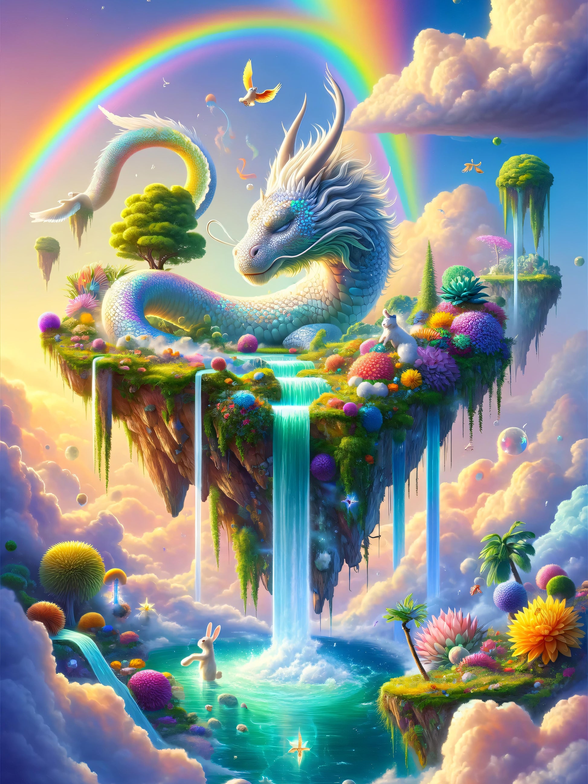 In a realm where skies are colorful and lands float, a wise dragon guards the roots of existence. On floating islands, rich with life, waterfalls pour endlessly into a sea of clouds, the source of all rivers. Creatures, big and small, live in peace, each adding to the land's joy. The dragon, a kind spirit, represents wisdom, reminding all that knowledge and kindness keep the world in balance. Shining rainbows and lively flora are the island's treasures, not gold. In this land, imagination and dreams shape reality, proving that what truly matters lies within the heart and the mind's eye.