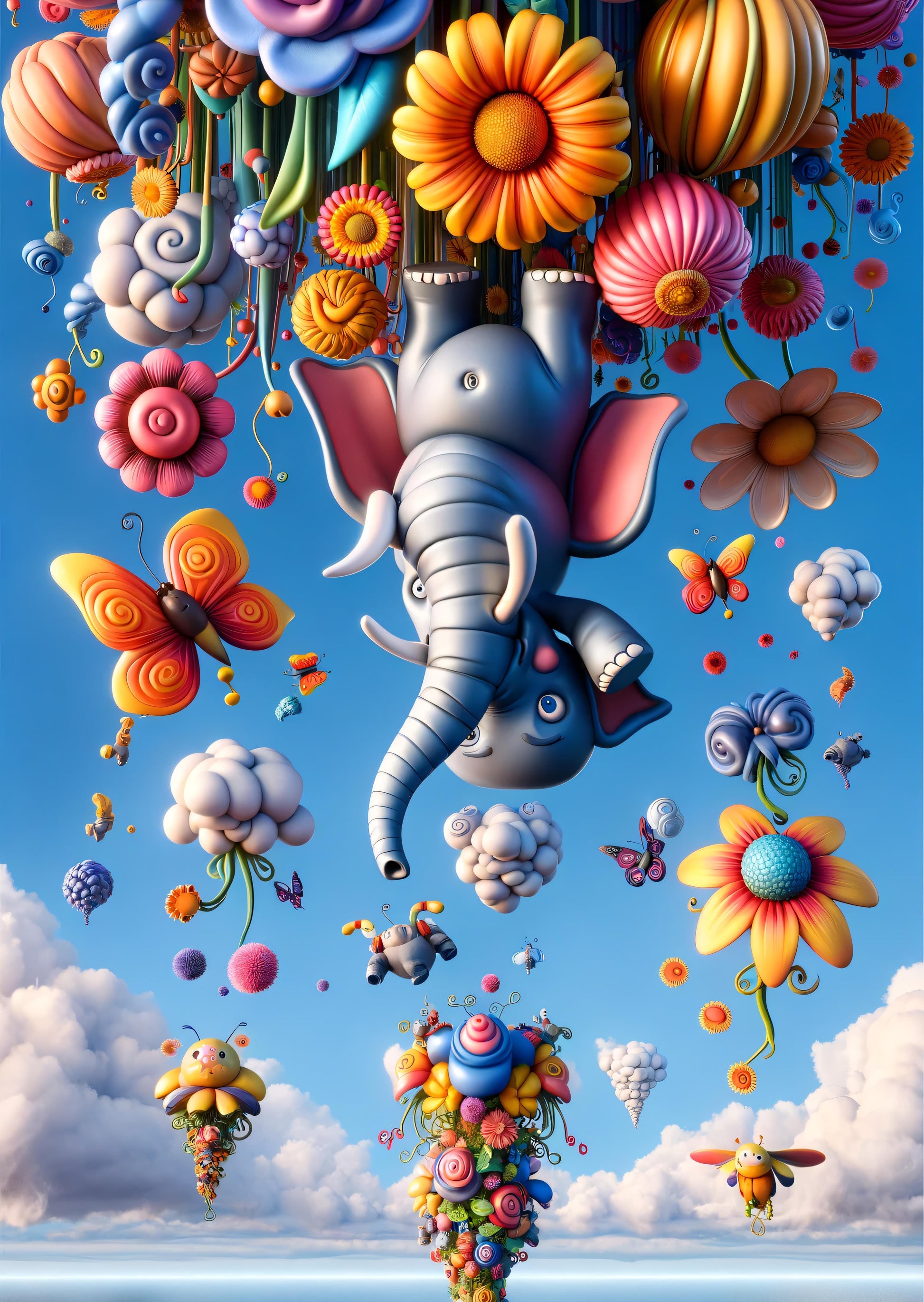 In a wondrous sky where flowers bloom like stars, an elephant floats, untethered by gravity's chains. Around it, a carnival of color dances, with cheerful clouds and friendly bees wearing hats. Smiling creatures soar on whimsy's breeze, sharing the air with balloons that could have sprouted from the very earth. This world, painted with the brush of joy, reminds us that imagination can defy logic, and that happiness often nests in the heart of simplicity. The elephant, a gentle giant, bathed in the warm glow of this dreamscape, invites all to bask in the beauty of a moment that requires nothing but an open mind.