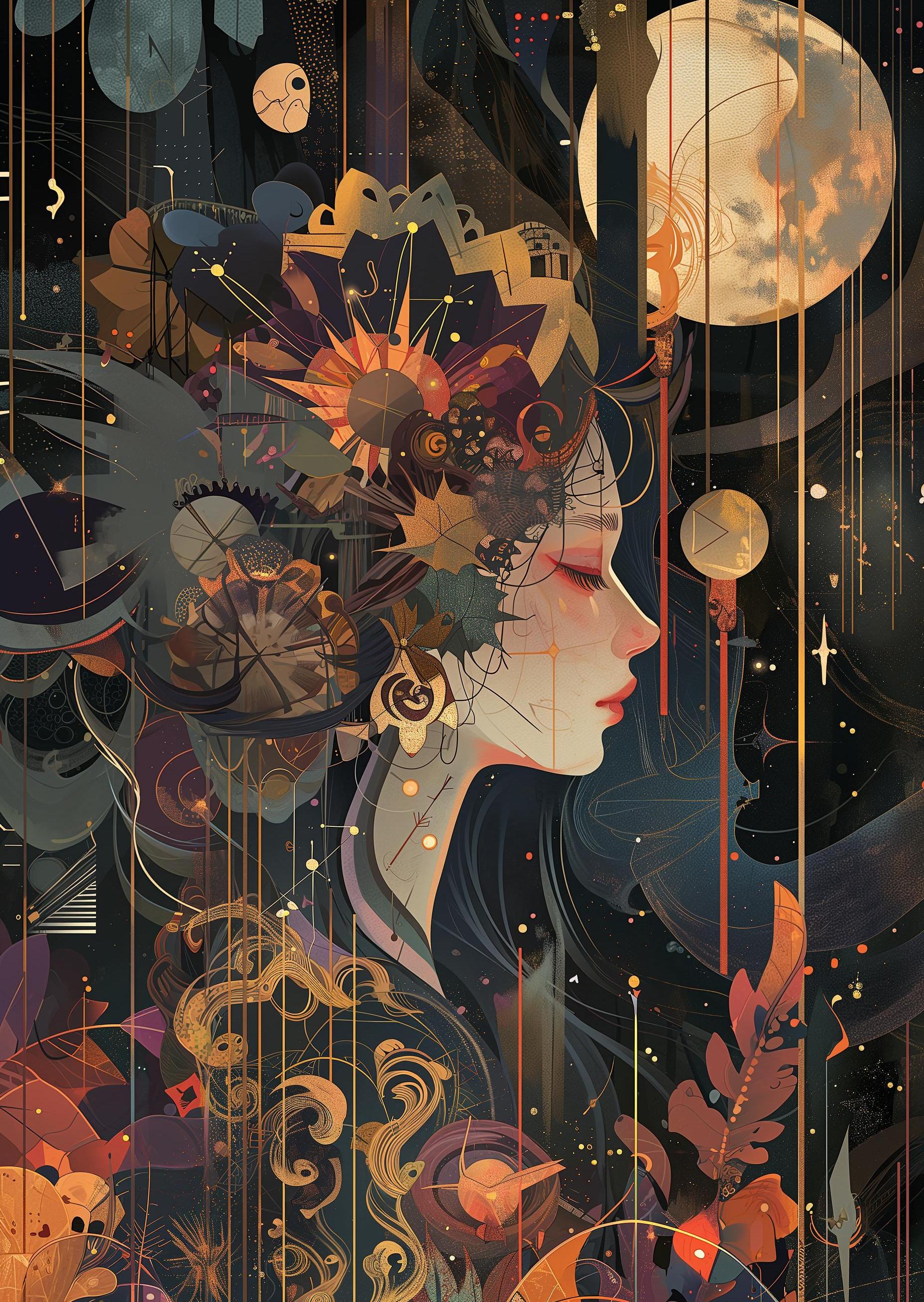 In a world woven from dusk and dreams, a woman's face emerges. Vines of time twirl around her, binding moments like jewels. The sun and moon dance in balance above, casting light that sparkles against the night. She holds a universe within, where golden lines connect stars to fate. Her eyes, closed, seem to hum with secret tales as colors of fall crown her head. In this tapestry of imagination, every thread tells a story, inviting us to look closer and find our own place within the intricate dance of life.
