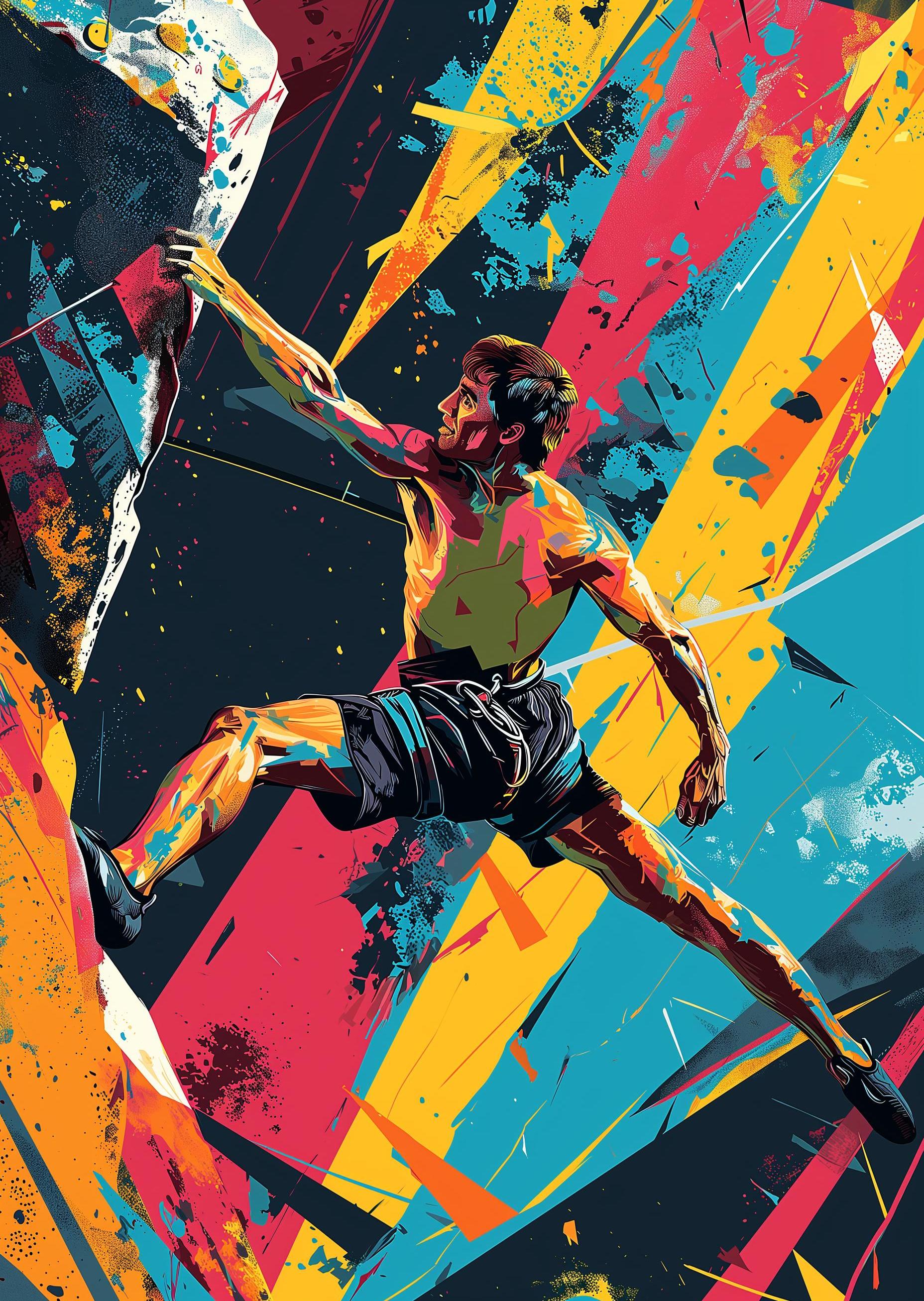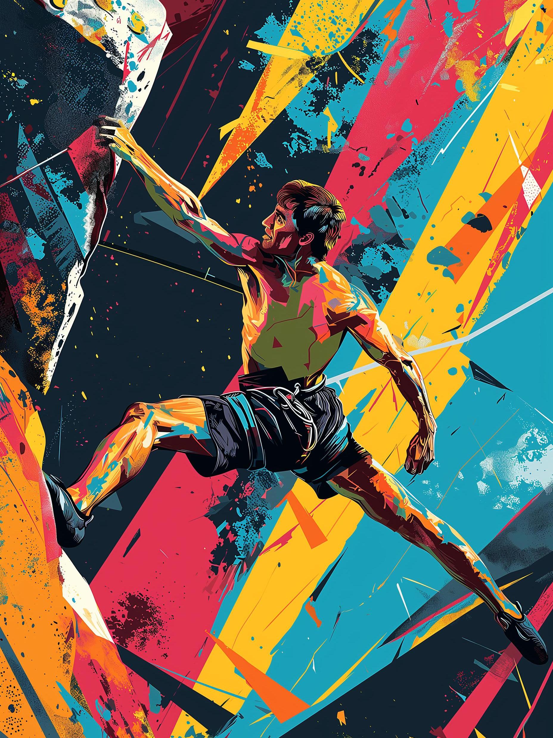 In a world of bright colors and bold moves, a climber faces the wall with fierce eyes and a strong heart. Every muscle tightens as he reaches for a hold, far above the cheering crowd. His fingers grip the rock, and for a moment, he's a hero in his own epic adventure. With a push of his legs, he leaps to the next challenge, climbing higher and higher. The top beckons, and with one final jump, he touches the peak. Victory! The crowd goes wild, and the climber smiles, knowing he's conquered more than just the wall – he's beaten his own doubts. Simple yet powerful, the story of willpower at play.